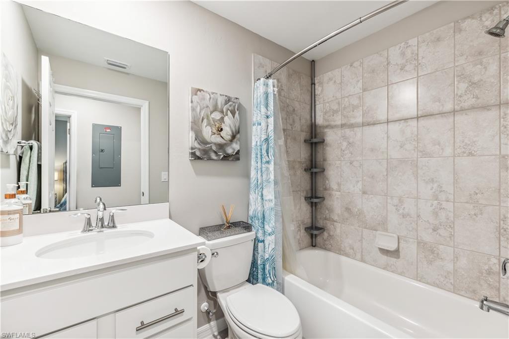 This Condo offers, 2 Bedrooms Plus a Den. The Master Bedroom is furnished with a King Size Bed, 2 Walk In Closets and a Private En-suite bathroom. The Second bedroom has a Queen Bed, and is located on the opposite side of the condo, with easy access to the guest bathroom & laundry room. The Den / Study, offers a stationary exercise bike as well as a desk and office chair.