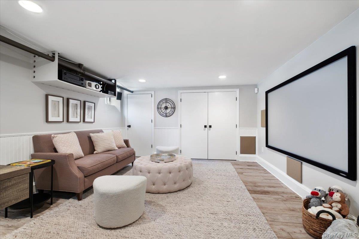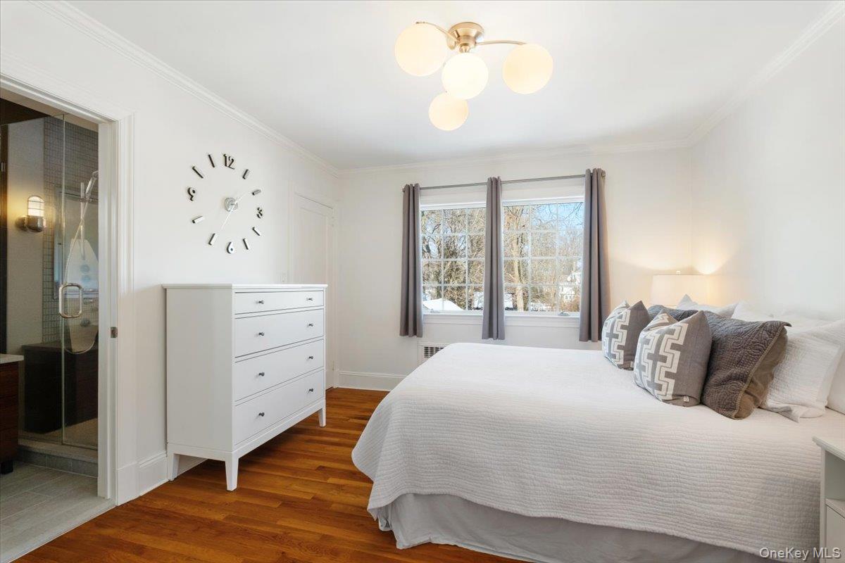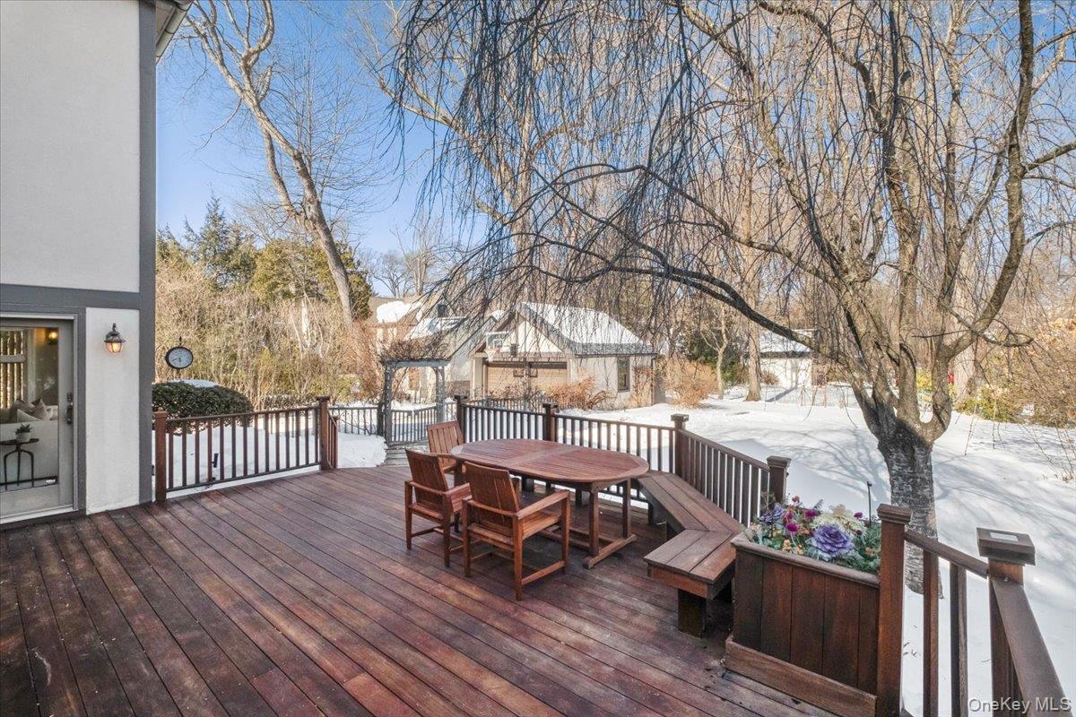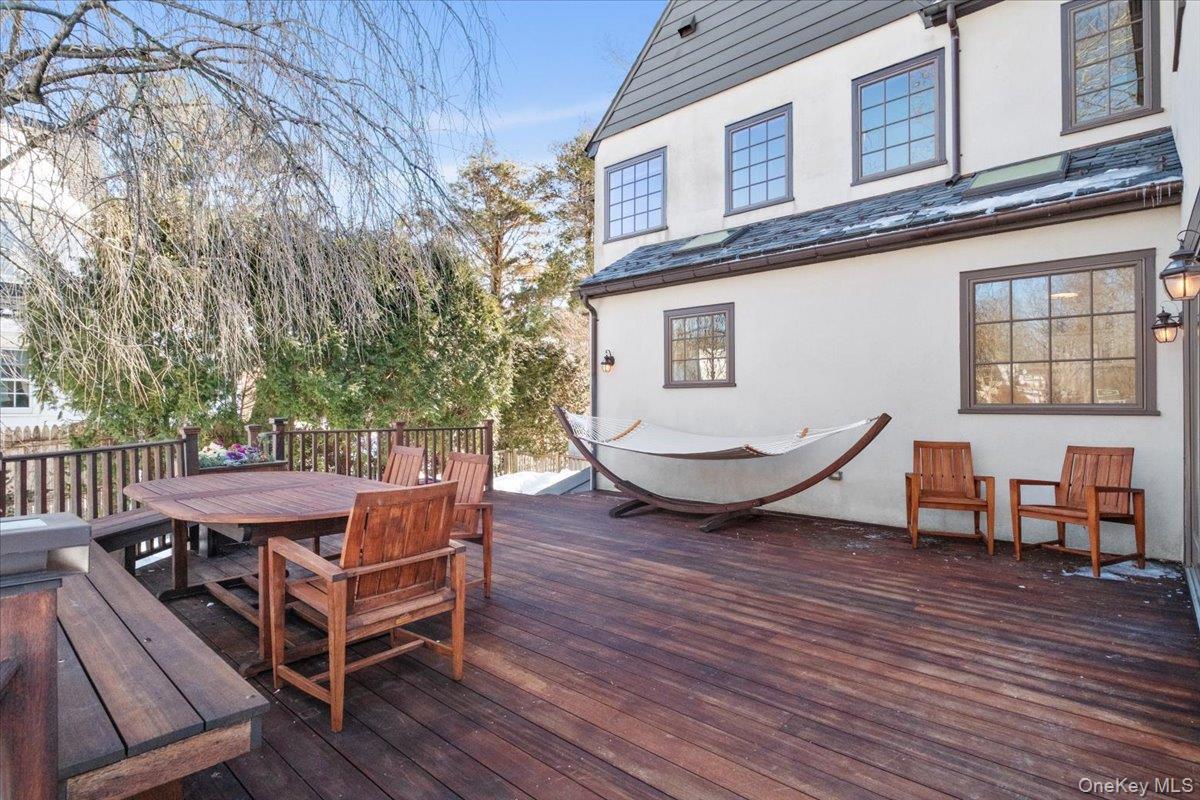 Timeless architectural appeal and thoughtful modern updates abound in this classic Scarsdale stone and stucco Tudor, ideally located a short walk to Greenacres School and Metro-North train station. Sensible layout for comfortable everyday living and festive entertaining. Freshly painted interior, beautiful hardwood floors, French doors, designer lighting and ceiling fans, wood-burning fireplace, premium stainless appliances, central air, generously-sized rooms and closets throughout, huge deck, professionally landscaped grounds, and many more Special Features make this move-in ready home a place to create lasting memories. The gracious entry foyer offers coat and shoe closets and a practical built-in storage bench. Curl up with a good book by the living room fireplace or gather for joyful celebrations with a big crowd. Formal dining room with custom wainscoting for elegant dinners. Sunny chef's kitchen with skylights, premium stainless appliances, breakfast area, and pantry is adjacent to the family room with oversized windows and slider overlooking the huge mahogany deck and backyard. Two separate home offices with custom built-ins. Elegant powder room, with exquisite curated garden serving as a privacy screen, completes the first floor. Upstairs to 5 bedrooms: the primary bedroom suite with walk-in and outfitted closets, a luxurious bath with radiant heat floor, walk-in shower and deep jacuzzi soaking tub that offers a spa-like experience. A Jack and Jill bedroom/bath suite. Two additional bedrooms and a hall bath with tub/shower means plenty of room for everyone to dream and get ready for the day ahead. A convenient second floor laundry with full-size washer/dryer completes the second floor. The versatile lower level offers space for recreation, a screening area, a huge wood/hobby shop, wet bar for entertaining, and many large storage closets. Relax in tranquil comfort and privacy outside on the enormous deck. Large, level, fully fenced backyard for Fido plus outdoor fun and games for everyone. Detached 2-car garage with storage loft. Professionally landscaped grounds with lawn irrigation, mature trees and seasonal gardens in bloom for most of the year. Greenacres Elementary School and playground 2 blocks away. Free bus to Scarsdale Middle School. Short walk to the nearby Hartsdale Metro-North train station to zip you to Grand Central Terminal on the 37 minute express train. Hartsdale commerce includes inviting shops, restaurants, fitness clubs, and bagels. Easy access to Bronx River Parkway for Bicycle Sunday. Scarsdale Recreation offers summer day camp, tennis, youth and adult sports and parks. Square footage includes 475 square footage of finished legal recreation space in the lower level. Welcome home!