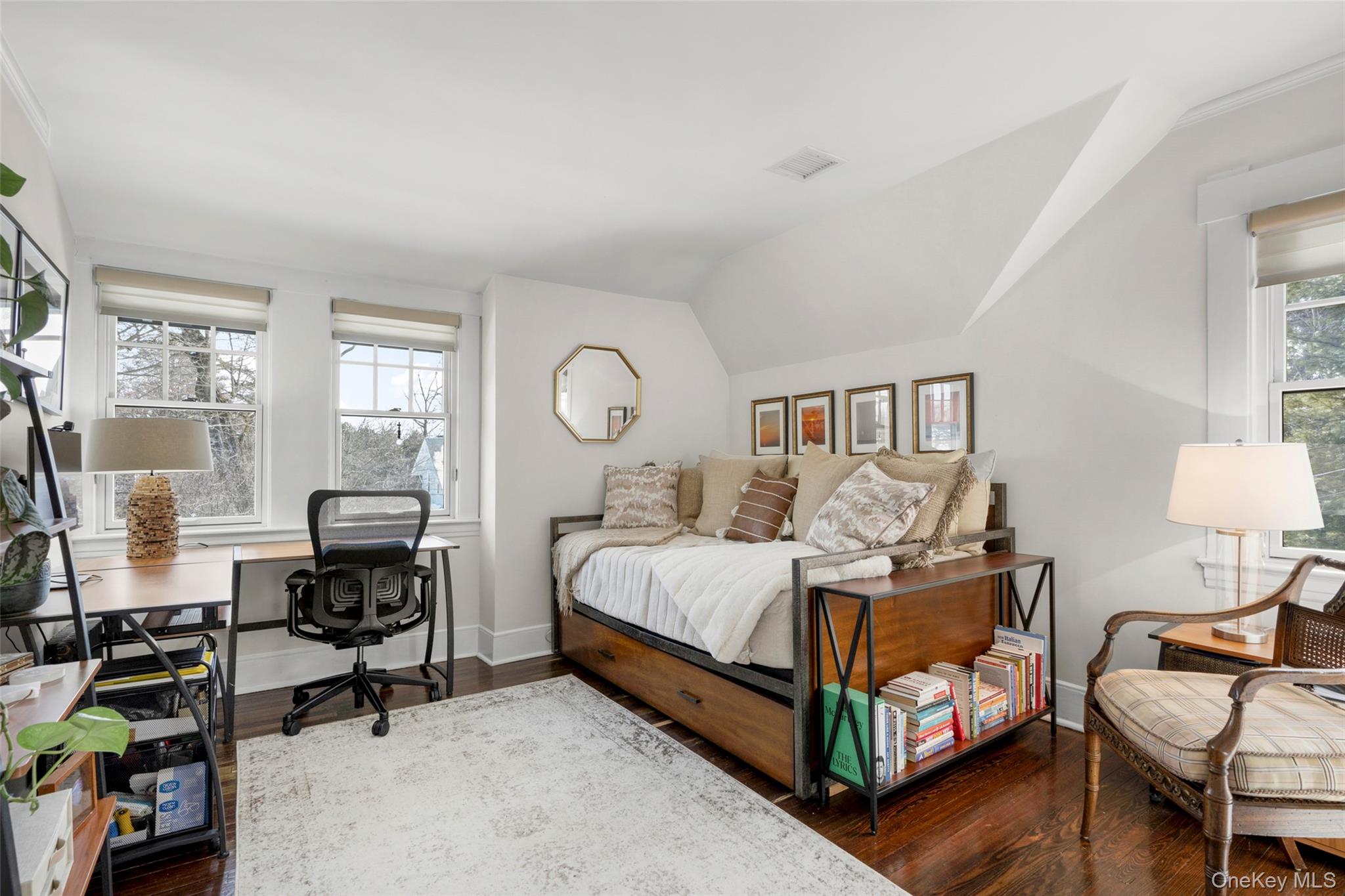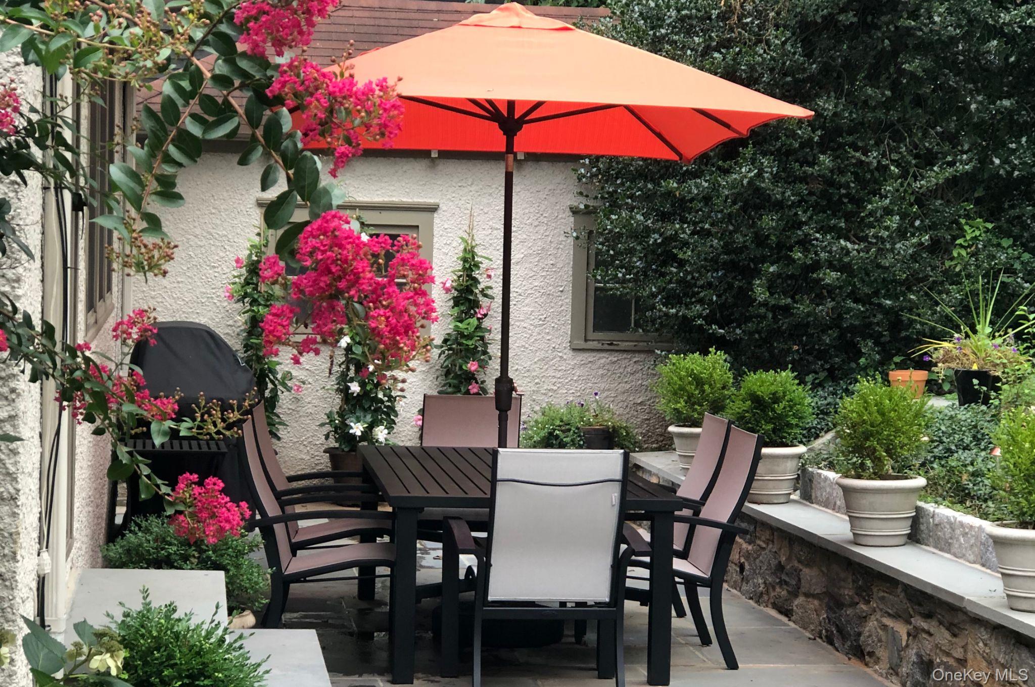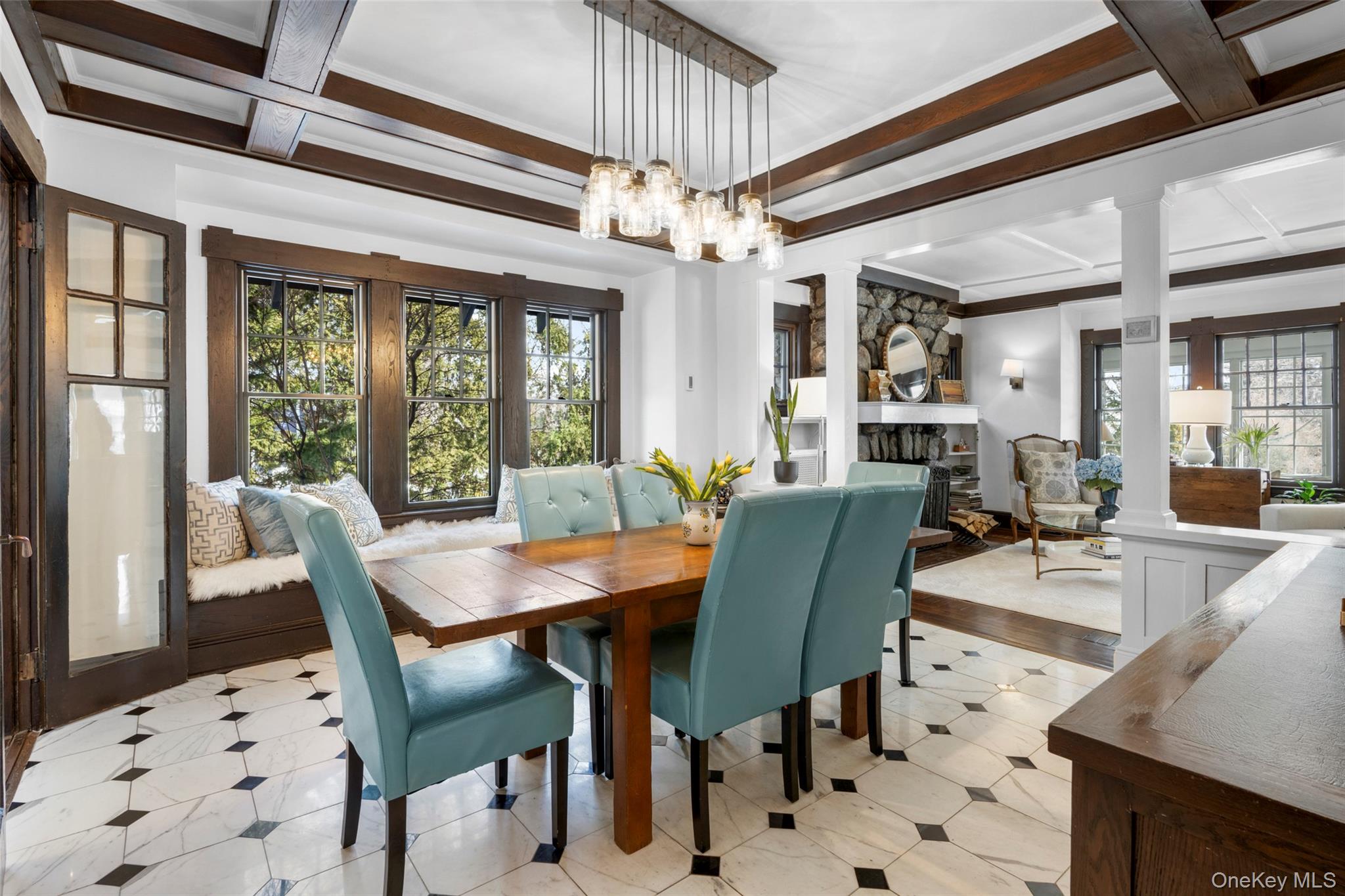 Stunning custom Craftsman Tudor, perfectly nestled in the desirable Larchmont Gardens neighborhood. Offering the ultimate in convenience and an idyllic suburban lifestyle, you are just down the street from the Metro-North station, the vibrant shops and dining of Larchmont Village, and the picturesque Duck Pond. Step inside through a beautifully welcoming sun porch—the perfect tranquil spot to spend lazy summer days. The spacious living room immediately greets you with a dramatic stone fireplace and stunning coffered ceilings, accented by original wood beams. This space seamlessly leads into an elegant dining room featuring classic black and white marble-tiled floors. The well-appointed kitchen features stainless steel appliances and a convenient barstool breakfast counter, opening directly onto a bright and airy family room. This inviting space includes a skylight, a conveniently located full bathroom, and easy access to the backyard. Upstairs, you will find three generous bedrooms that offer plenty of space to unwind, along with an oversized hall bathroom. Downstairs, the lower-level recreation room features a fantastic open floor plan and an additional full bathroom; this highly versatile space can easily adapt to fit your exact needs. Outside, the beautifully landscaped backyard is picture-perfect for entertaining. The large slate patio serves as the ideal venue for summer BBQs and carefree lounging. This home must be seen to be truly appreciated!