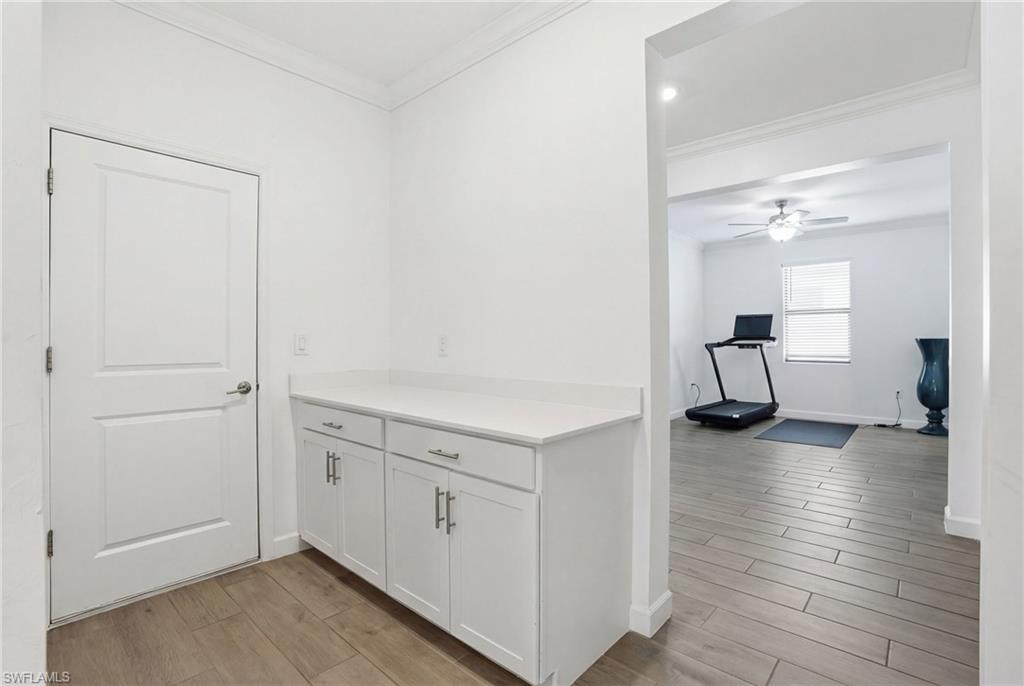 The gourmet kitchen is a standout with quartz countertops, a butler’s pantry, abundant cabinetry, and generous prep space, making it ideal for hosting and everyday living. A well-appointed laundry room with built-in cabinets adds extra storage and organization. Just inside the garage service door, a thoughtfully designed drop zone provides the perfect place to keep everything neatly tucked away.