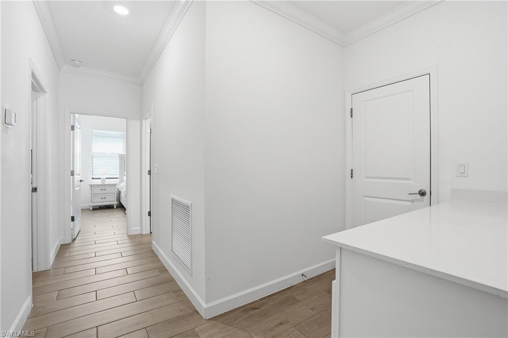 Expansive sliding glass doors lead to the covered lanai, where you’ll enjoy peaceful water and preserve views along with electric remote Storm Smart Kevlar screens, allowing for seamless indoor-outdoor living year-round with added storm protection.