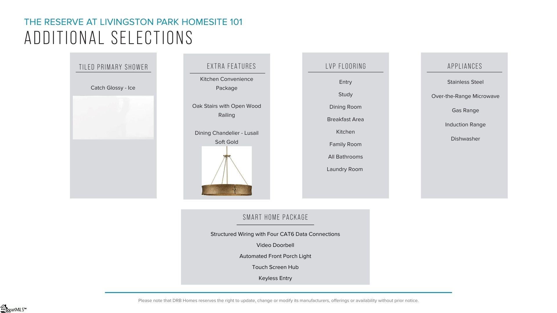 Welcome to The Reserve at Livingston Park! The most conveniently located single family homes with quick access to I-123 and direct access the Brushy Creek Trail. Come home to the Drayton! This Craftsman style home features over 2900 square feet of functional living space, perfect for entertaining. Upon entering from your covered front porch, you are greeted with a welcoming foyer that shows how open and bright the home is. Adjacent to the entry is a dedicated study with french doors, perfect for a home office. The formal dining room with coffered ceiings leads into the spacious and modern kitchen featuring beautiful white cabinetry, Quartz countertops, tiled backsplash, under cabinet lighting, double door pantry, center island with navy cabinet accents and upgraded stainless steel gas appliances. The extended breakfast nook leads out to the covered back porch which overlooks your large backyard making it a perfect place for outdoor entertaining. The airy family room features high ceilings and tall windows giving the room lots of natural light along with a cozy gas fireplace with stone surround. Up the Oak staircase you come to the spacious Primary Suite which features trey ceilings, double sinks, generous walk in closet and an amazing Roman tiled shower with dual showerheads, seat and frameless glass door. Two additional bedrooms, a full bath, large loft space, and convenient upper-level laundry room complete the second floor. Smart home technology, energy-efficient design, and a dedicated local warranty team ensure long-term comfort and convenience. The Reserve at Livingston Park is conveniently located in the sought after Easley, SC area only 11 miles from downtown Greenville and 20 miles from Table Rock, Clemson University, Lake Hartwell, and Lake Keowee. Behind the community, the mile-long phase 1 of the Brushy Creek Greenway Trail leads directly to the impressive J. B. Owens Recreation Complex. Enjoy shopping in the rapidly growing city of Easley and nearby Powdersville. Access to sought-after schools, ample employment, easy commuting, and Interstate 85. Located near plenty of shopping, restaurants, and parks on the Highway 123 corridor including the Doodle Trail and Nalley Brown Nature Park. This home is almost complete so come by for your personal tour and make The Reserve at Livingston Park your new home! See Sales Agent for additional pricing information.