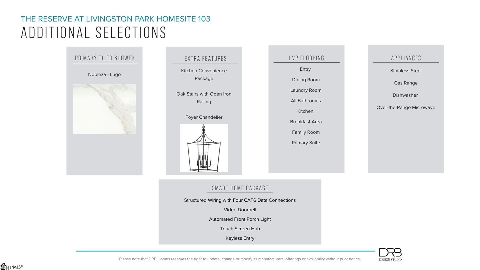 Welcome to The Reserve at Livingston Park! The most conveniently located single family homes with quick access to I-123 and direct access the Brushy Creek Trail. The Middleton Design offers craftsman-style architecture at its finest with large windows allowing the sun to glisten throughout the home. When you enter you will be greeted by your 2 story foyer and adjacent dining room with coffered ceiings which leads into your butlers pantry for extra prep space and storage with the double door pantry. Continuing into your open concept kitchen and living room, you will be wowed by the stacked white cabinetry, white Quartz countertops, tiled backsplash, under cabinet lighting, center island with light brown cabinet accents and along with upgraded stainless steel gas appliances. The living room features trey ceilings and tall windows for lots of natural light along with a cozy gas fireplace. The breakfast room leads out to the covered back porch which overlooks your large backyard. The Primary Suite is situated off the living room and features an expansive walk in closet, double vanities and amazing Roman tiled shower with dual showerheads, seat and frameless glass door. The walk in laundry room and powder room complete the main level. As you go up the Oak staircase off the foyer, you have three additional bedrooms, full bathroom and a large multi use room. Smart home technology, energy-efficient construction, and a dedicated local warranty team ensure lasting convenience and comfort. The Reserve at Livingston Park is conveniently located in the sought after Easley, SC area only 11 miles from downtown Greenville and 20 miles from Table Rock, Clemson University, Lake Hartwell, and Lake Keowee. Behind the community, the mile-long phase 1 of the Brushy Creek Greenway Trail leads directly to the impressive J. B. Owens Recreation Complex. Enjoy shopping in the rapidly growing city of Easley and nearby Powdersville. Access to sought-after schools, ample employment, easy commuting, and Interstate 85. Located near plenty of shopping, restaurants, and parks on the Highway 123 corridor including the Doodle Trail and Nalley Brown Nature Park. This home will be complete this Summer so come by today for more information and make The Reserve at Livingston Park your new home. See Sales Agent for additional pricing information.