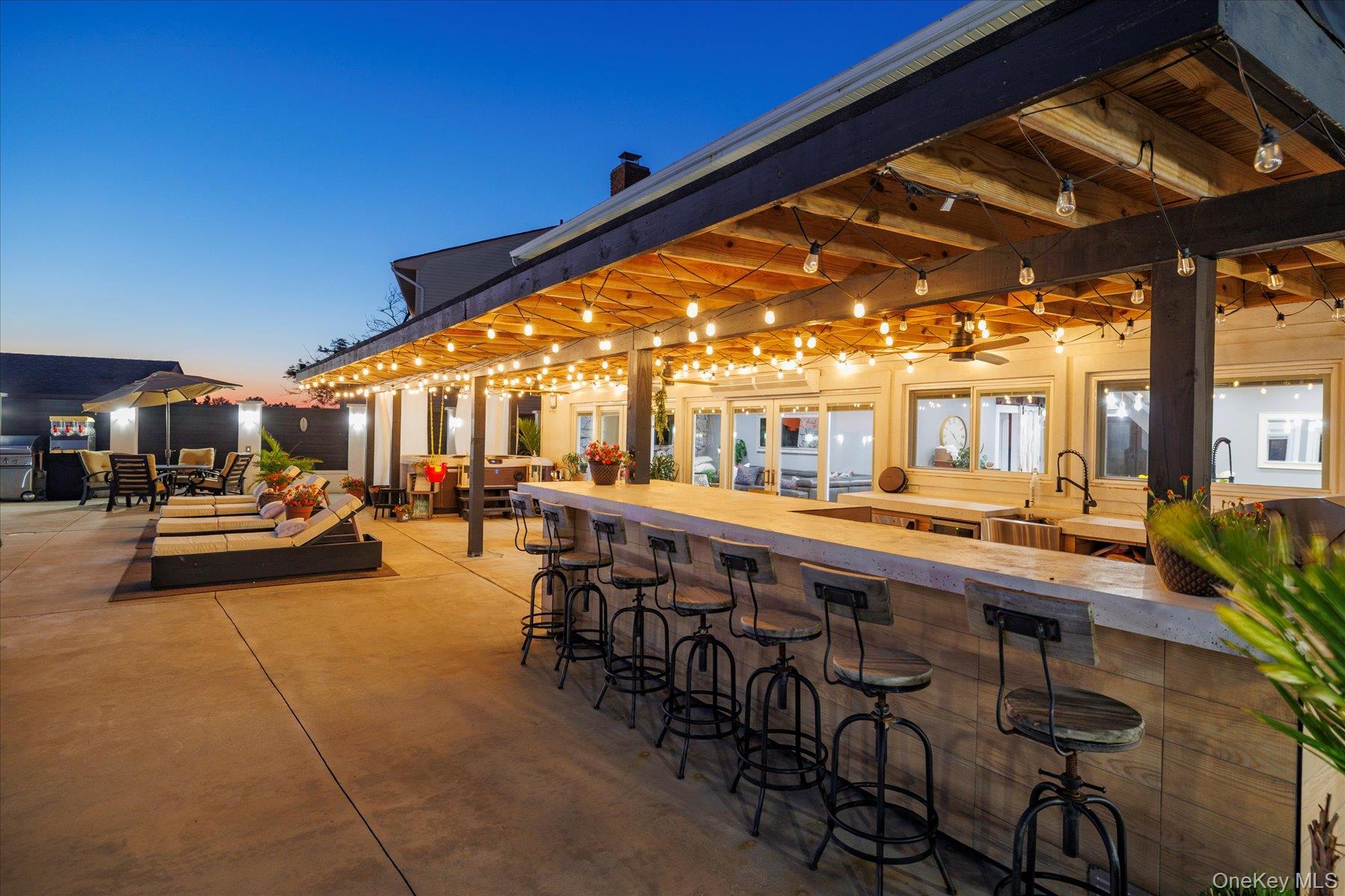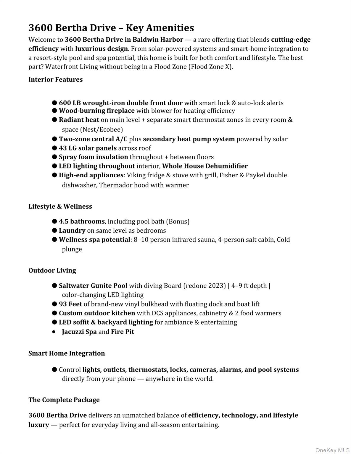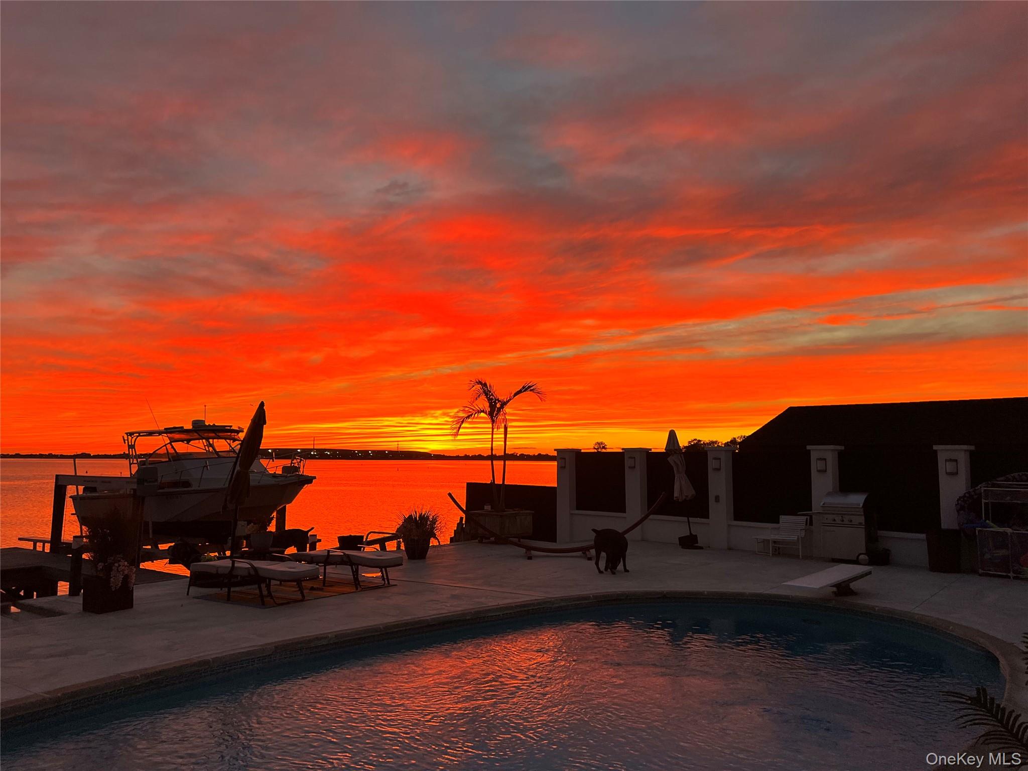 Welcome to one of Baldwin Harbor’s most exceptional waterfront estates—an incredibly rare offering where panoramic open-bay views, refined design, and resort-caliber amenities come together to create a truly unforgettable coastal lifestyle. Set on an extraordinary 93 feet of open bay frontage with coveted southern and western exposure, this remarkable residence captures breathtaking sunsets, sweeping water views, and even front-row seats to fireworks and summer concerts from Long Beach to Jones Beach. With quick access to the Atlantic Ocean, the property is a boater’s paradise featuring a large dock, boat lift, and effortless open-water access. The resort-style backyard rivals that of a luxury retreat. Designed for both serene relaxation and unforgettable entertaining, it features a heated gunite pool with dramatic lighting, hot tub, full outdoor bath, custom outdoor kitchen, and multiple waterfront lounging areas—all framed by uninterrupted open-bay views and expansive skies. Inside, the home has been fully rebuilt and meticulously renovated down to the studs, blending modern coastal sophistication with thoughtful architectural design. Walls of glass and expansive sliding doors flood the home with natural light while seamlessly connecting indoor and outdoor living. The chef’s kitchen is a true showpiece, featuring Viking appliances, stunning stone countertops, designer lighting, and a layout that flows effortlessly into the dining area, family room, and additional lounge space—perfect for hosting both intimate gatherings and large-scale entertaining. The residence offers five bedrooms and four beautifully designed bathrooms, highlighted by a breathtaking primary suite with walk-in closet and convenient second-floor laundry. Two separate access points lead to the expansive upper-level bayfront deck, an extraordinary setting for morning coffee, sunset cocktails, and endless water views. Additional highlights include radiant heated floors, central air with smart thermostats in every room, a working fireplace, solar panels for energy efficiency, and a truly unique private wellness retreat complete with a salt cave, sauna, and cold plunge. The beautifully designed paver landscape creates a low-maintenance waterfront oasis that feels both private and luxurious. And perhaps the most remarkable feature of all: this spectacular waterfront property is NOT located in a flood zone, offering the beauty and lifestyle of open-bay living without the typical constraints or costs. A rare combination of location, design, and lifestyle amenities, this Baldwin Harbor waterfront estate delivers the ultimate year-round coastal living experience—effortless, elevated, and truly one-of-a-kind.