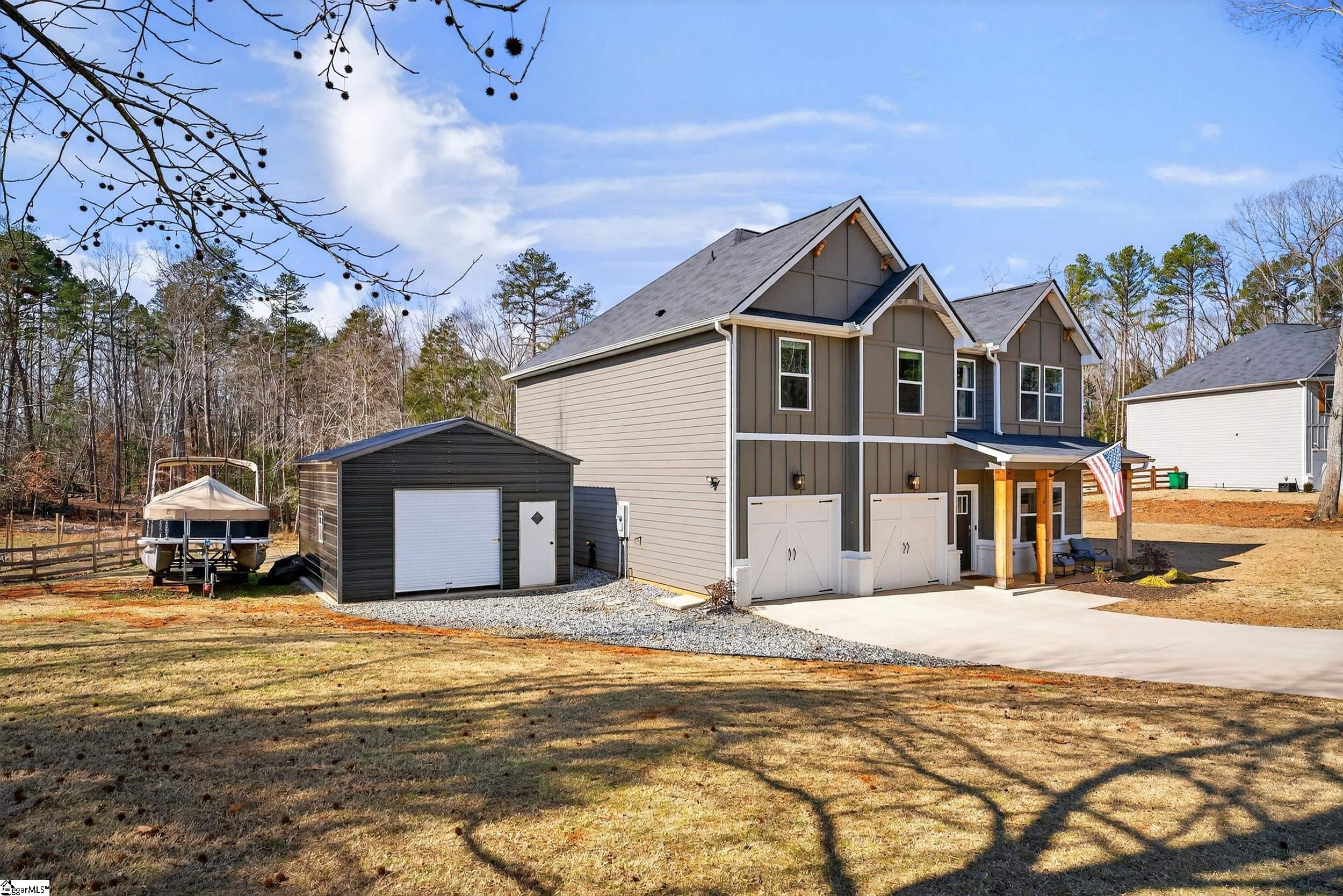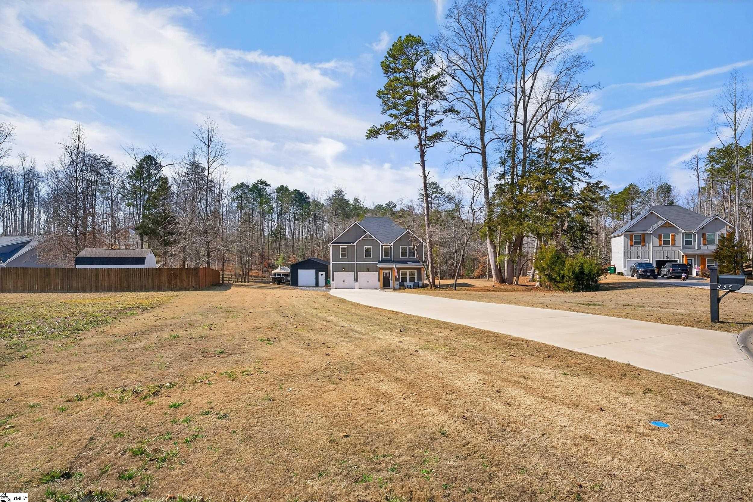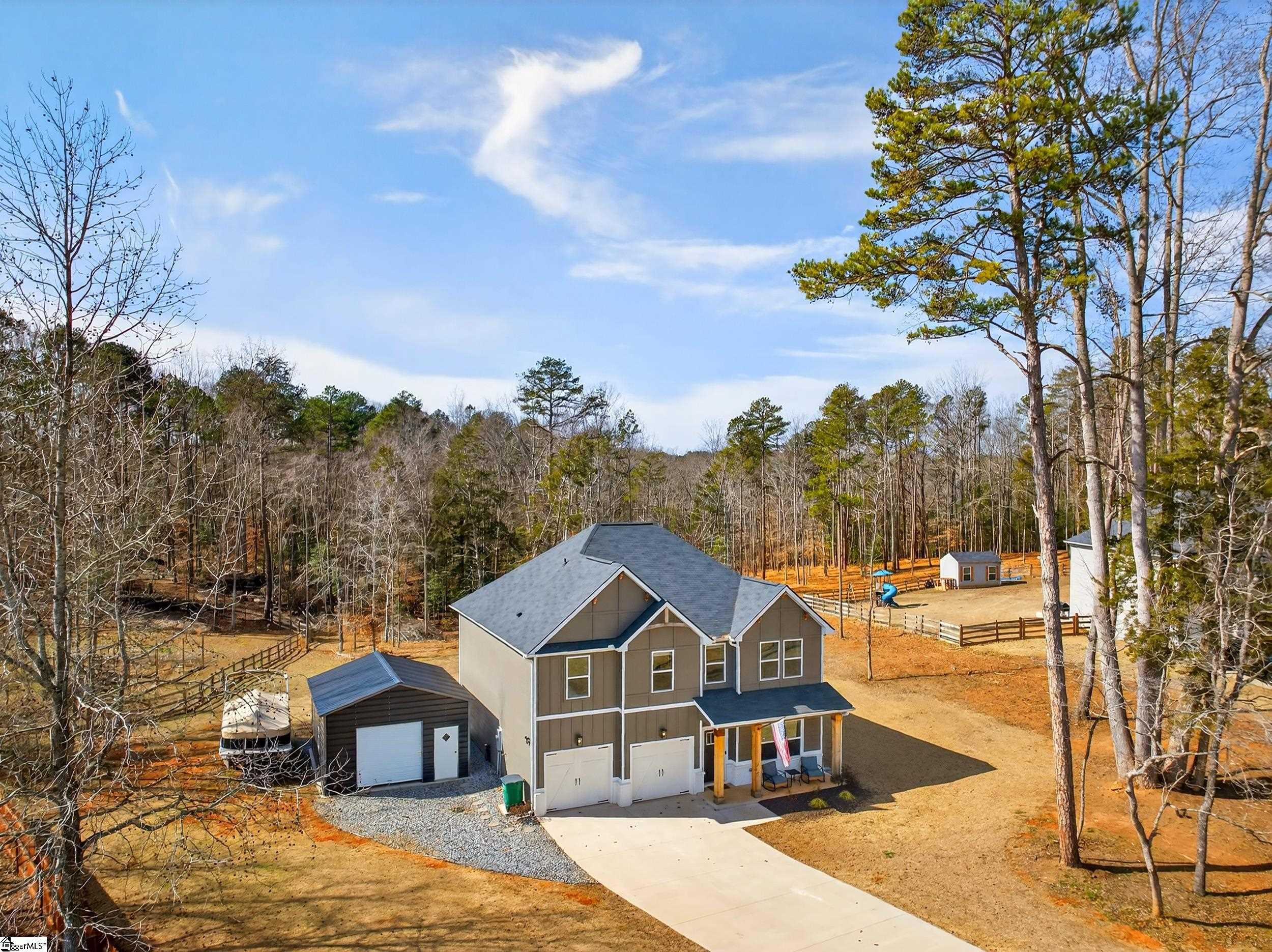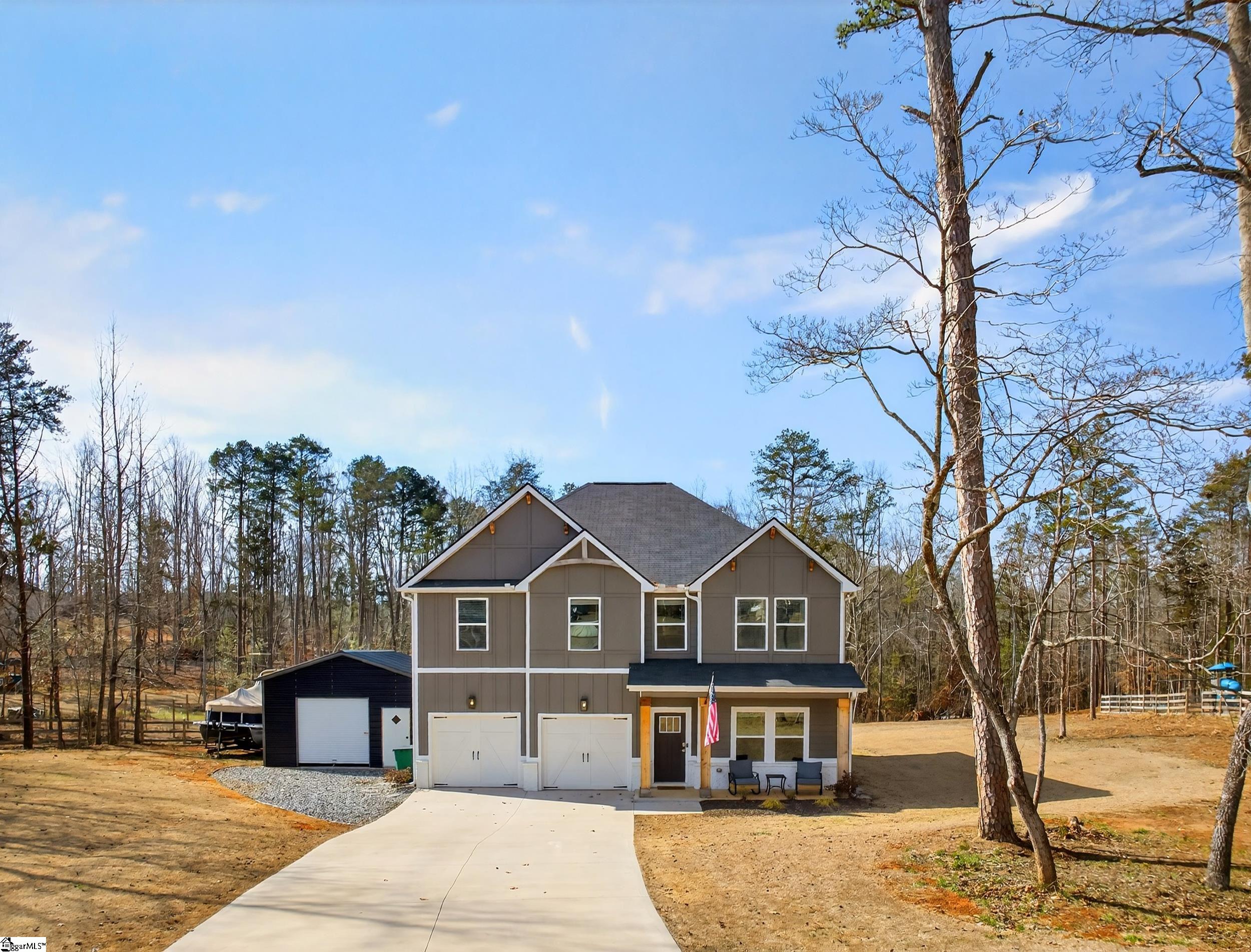 Set on over 4 acres in a neighborhood with no HOA, this 5-bedroom home offers a rare mix of open yard space, wooded privacy, and room to spread out. The homesite features a large front and backyard ideal for everyday living and entertaining, while wooded acreage behind the home leads to the North Tyger River at the rear of the property. A trail winds through the trees down toward the water where you’ll find a peaceful, private area with beautiful rock formations — perfect for relaxing, exploring, or a quiet picnic. The trail is wide enough for a side-by-side, while still allowing you to enjoy the natural beauty of your own wooded setting if you prefer to walk and take it all in. A welcoming covered front porch and detached workshop/garage add both charm and function, offering space for storage, hobbies, or equipment. Inside, the open floorplan feels bright and comfortable with 9-foot ceilings on the main level and durable flooring throughout. The living and dining areas flow easily into the spacious kitchen, where a hand-selected, one-of-a-kind countertop anchors the space and adds character you won’t find in a standard build. The kitchen also features white cabinetry, an oversized island with seating, stainless appliances, double wall ovens, and a walk-in pantry. One bedroom and full bath are located on the main level, offering flexibility for guests, office space, or multi-generational living. Upstairs, you’ll find additional bedrooms, a second living space with loft area, and a comfortable owner’s suite featuring a spacious bath with dual shower heads. Over 4 acres with open yard, wooded trails, North Tyger River frontage, and no HOA — all within a neighborhood setting.