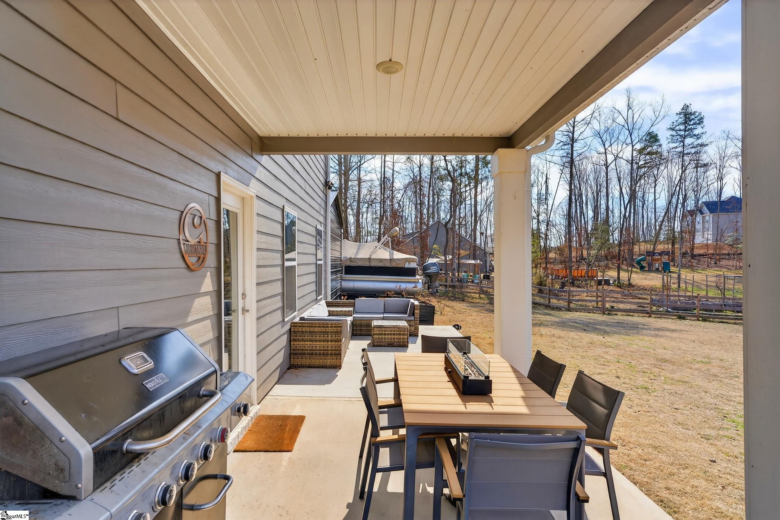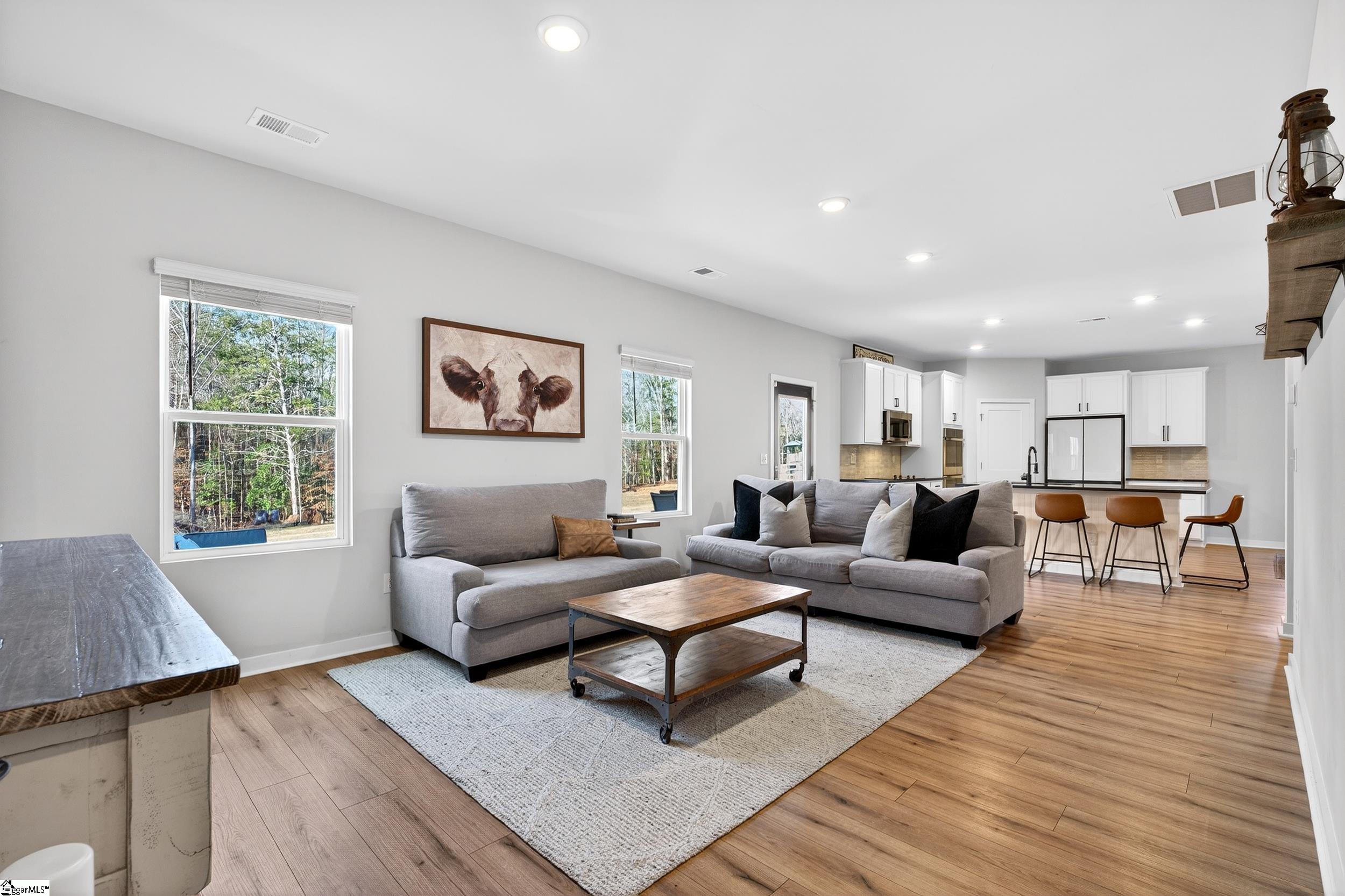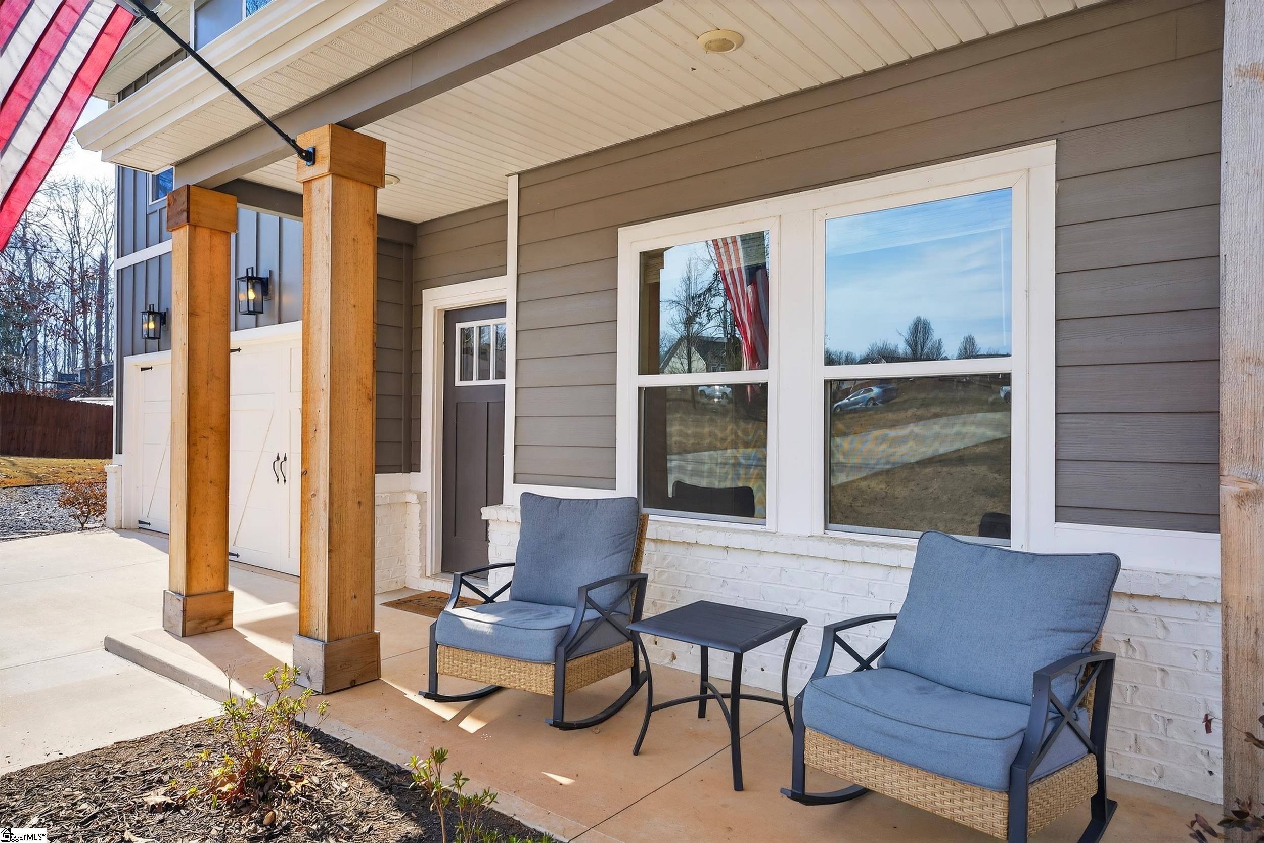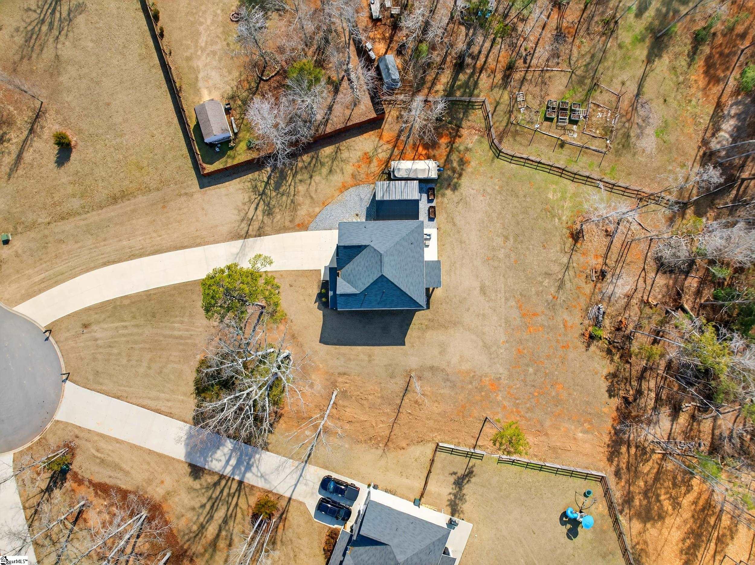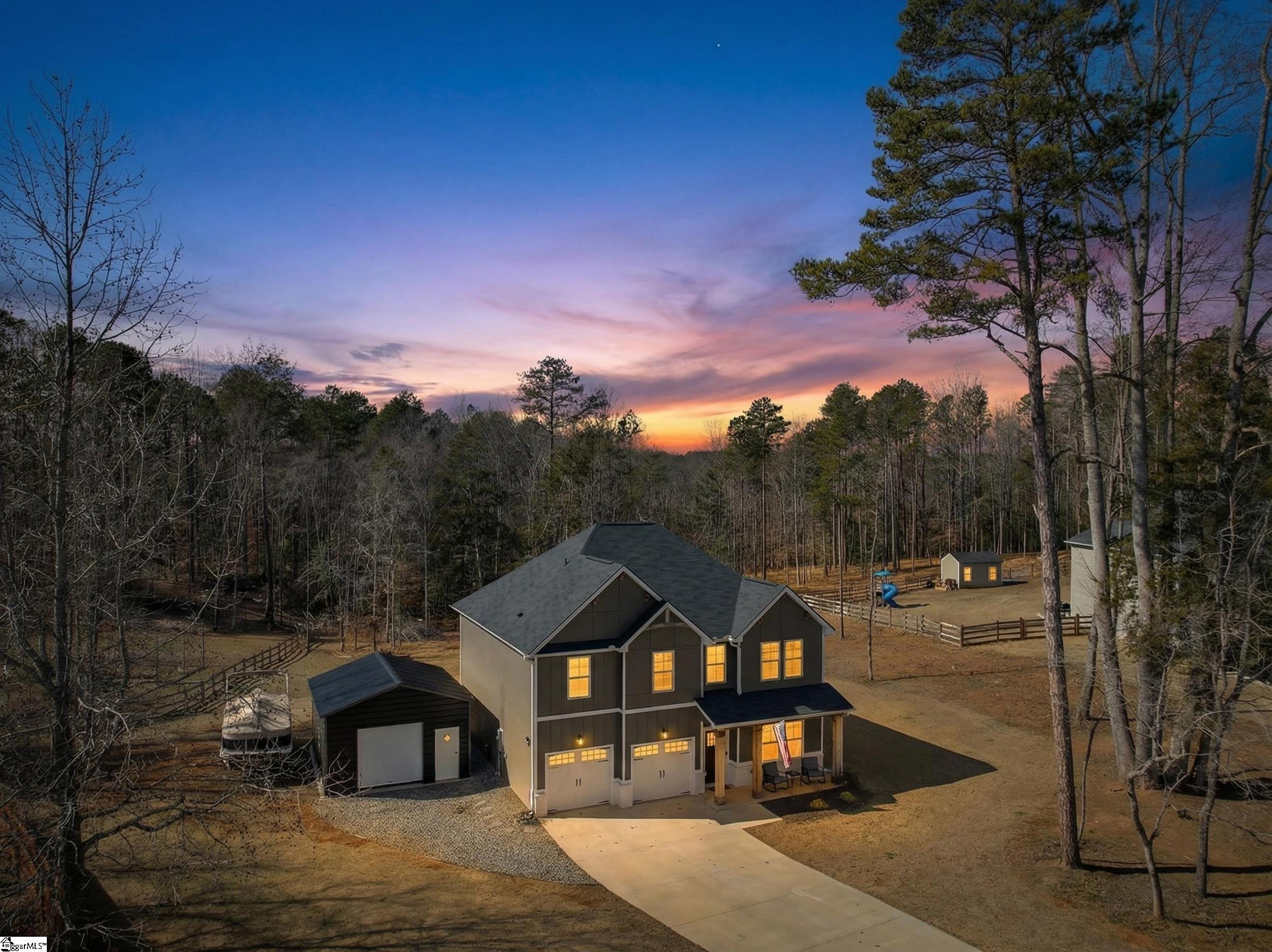 Set on over 4 acres in a neighborhood with no HOA, this 5-bedroom home offers a rare mix of open yard space, wooded privacy, and room to spread out. The homesite features a large front and backyard ideal for everyday living and entertaining, while wooded acreage behind the home leads to the North Tyger River at the rear of the property. A trail winds through the trees down toward the water where you’ll find a peaceful, private area with beautiful rock formations — perfect for relaxing, exploring, or a quiet picnic. The trail is wide enough for a side-by-side, while still allowing you to enjoy the natural beauty of your own wooded setting if you prefer to walk and take it all in. A welcoming covered front porch and detached workshop/garage add both charm and function, offering space for storage, hobbies, or equipment. Inside, the open floorplan feels bright and comfortable with 9-foot ceilings on the main level and durable flooring throughout. The living and dining areas flow easily into the spacious kitchen, where a hand-selected, one-of-a-kind countertop anchors the space and adds character you won’t find in a standard build. The kitchen also features white cabinetry, an oversized island with seating, stainless appliances, double wall ovens, and a walk-in pantry. One bedroom and full bath are located on the main level, offering flexibility for guests, office space, or multi-generational living. Upstairs, you’ll find additional bedrooms, a second living space with loft area, and a comfortable owner’s suite featuring a spacious bath with dual shower heads. Over 4 acres with open yard, wooded trails, North Tyger River frontage, and no HOA — all within a neighborhood setting.