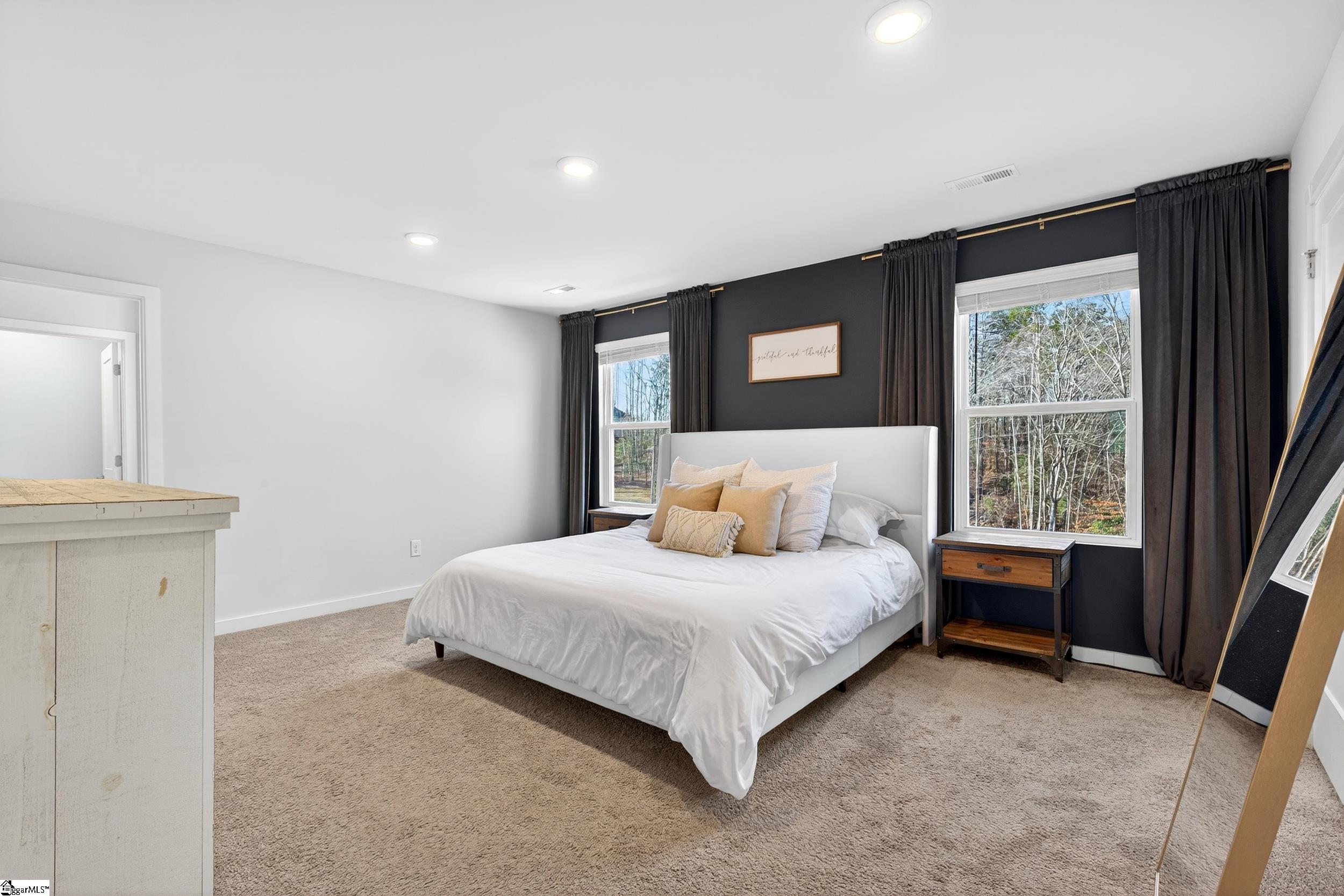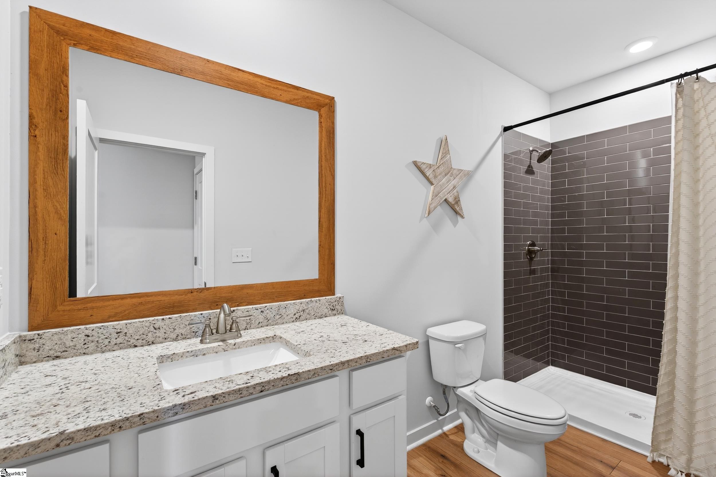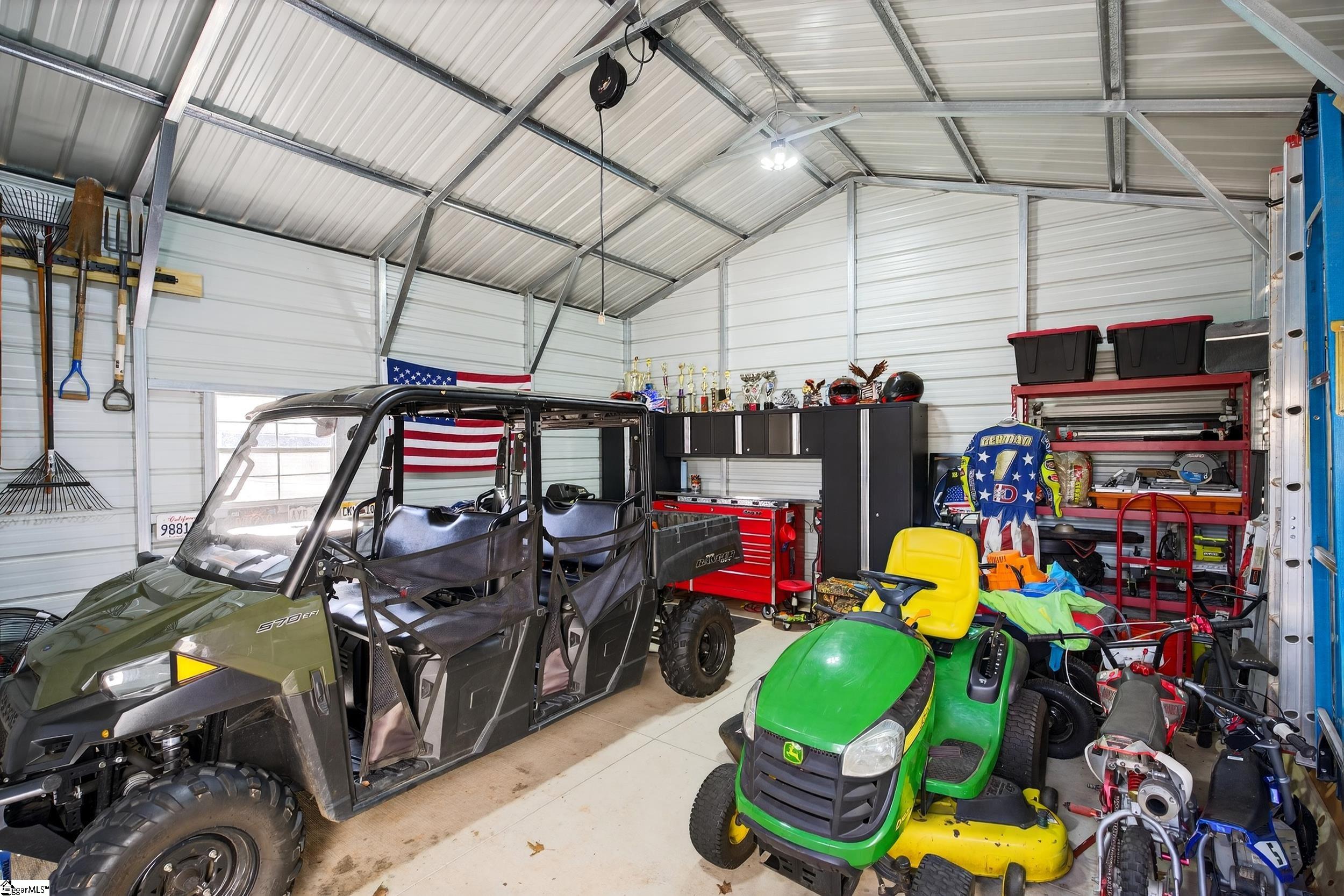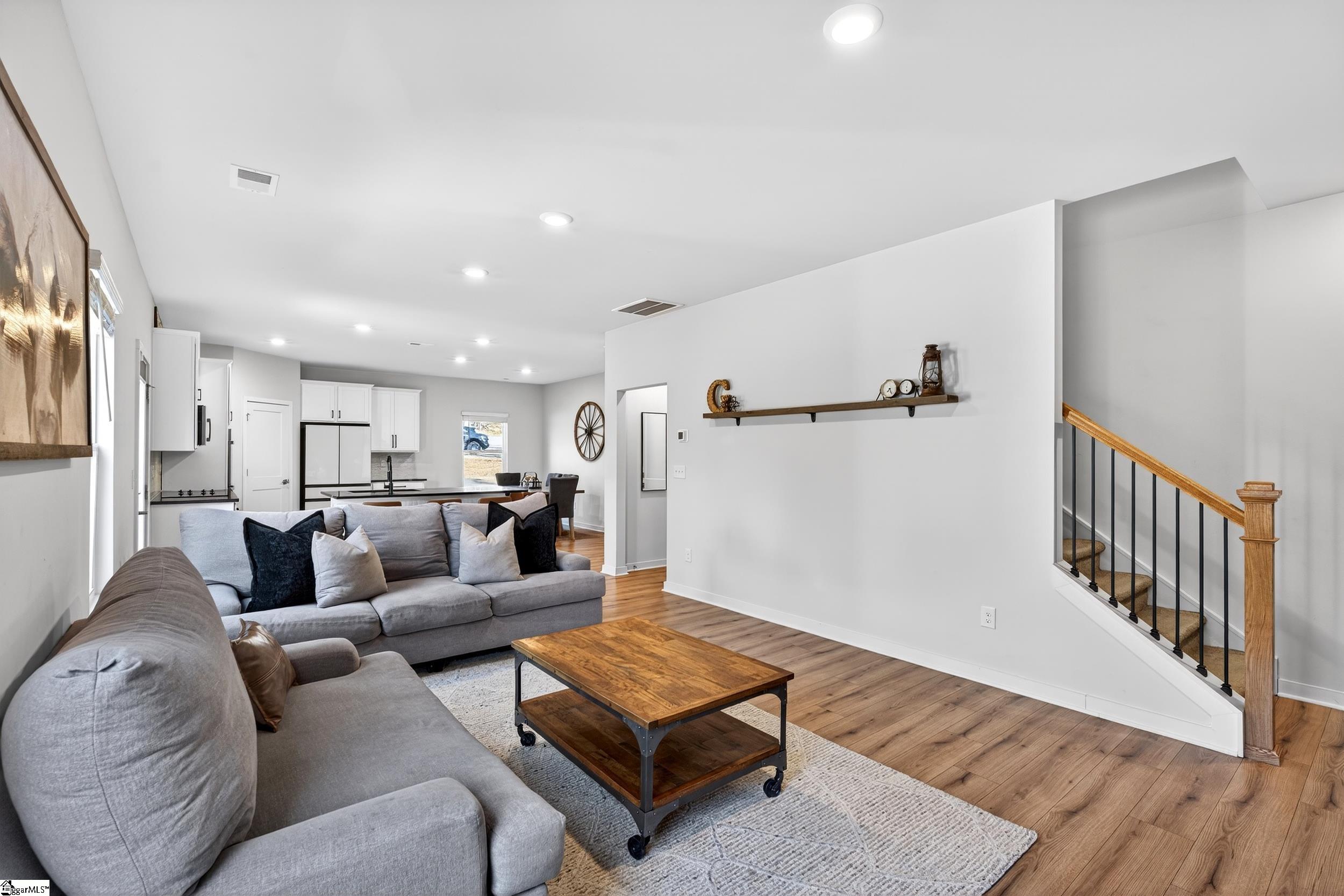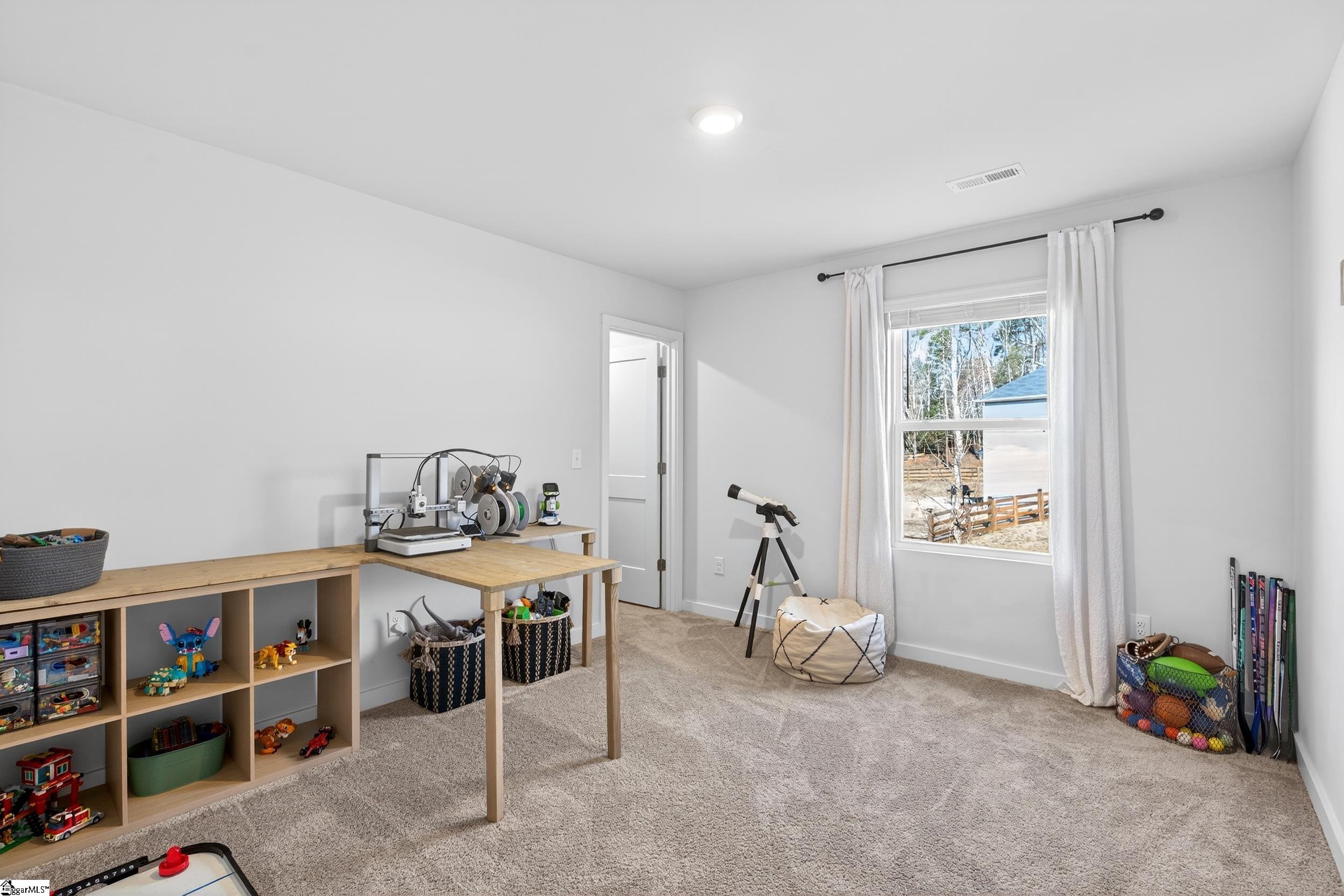 Set on over 4 acres in a neighborhood with no HOA, this 5-bedroom home offers a rare mix of open yard space, wooded privacy, and room to spread out. The homesite features a large front and backyard ideal for everyday living and entertaining, while wooded acreage behind the home leads to the North Tyger River at the rear of the property. A trail winds through the trees down toward the water where you’ll find a peaceful, private area with beautiful rock formations — perfect for relaxing, exploring, or a quiet picnic. The trail is wide enough for a side-by-side, while still allowing you to enjoy the natural beauty of your own wooded setting if you prefer to walk and take it all in. A welcoming covered front porch and detached workshop/garage add both charm and function, offering space for storage, hobbies, or equipment. Inside, the open floorplan feels bright and comfortable with 9-foot ceilings on the main level and durable flooring throughout. The living and dining areas flow easily into the spacious kitchen, where a hand-selected, one-of-a-kind countertop anchors the space and adds character you won’t find in a standard build. The kitchen also features white cabinetry, an oversized island with seating, stainless appliances, double wall ovens, and a walk-in pantry. One bedroom and full bath are located on the main level, offering flexibility for guests, office space, or multi-generational living. Upstairs, you’ll find additional bedrooms, a second living space with loft area, and a comfortable owner’s suite featuring a spacious bath with dual shower heads. Over 4 acres with open yard, wooded trails, North Tyger River frontage, and no HOA — all within a neighborhood setting.