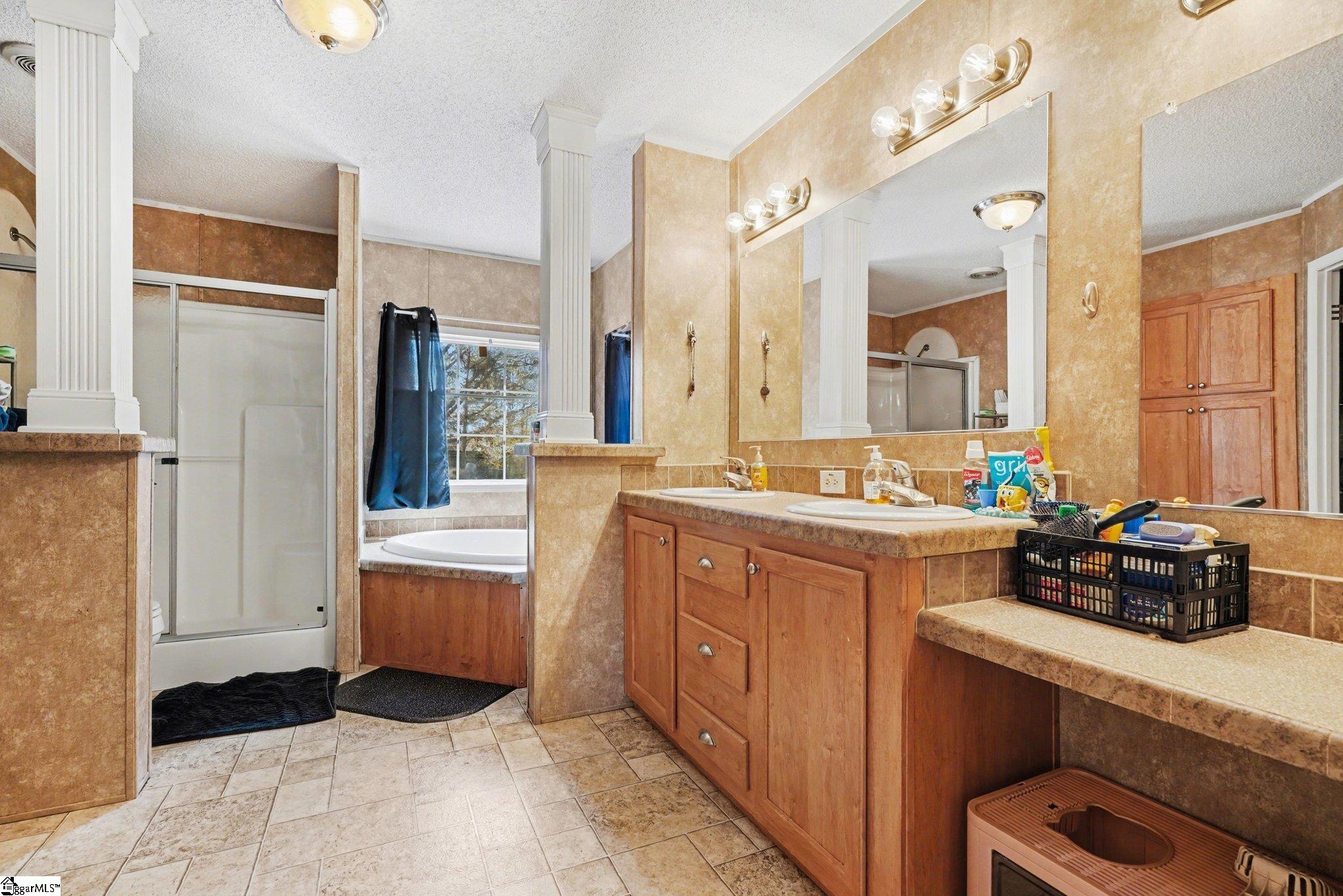 DETITLED home on just over 1 acre with DETACHED OVERSIZED 2 CAR GARAGE with two 10 ft roll up doors, 240 amp power + plug for a 5th wheel camper on the side. 2 car shed behind garage, the property has a gate + metal storage building with lean-to on back. The home offers an open floor plan with the kitchen sink overlooking the back + another work sink in the oversized island! Split bedroom floor plan and large primary suite with dual vanities, garden tub, separate shower and walk-in closet.