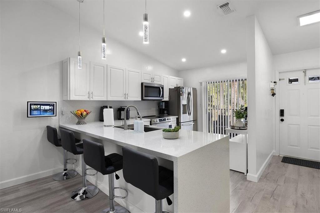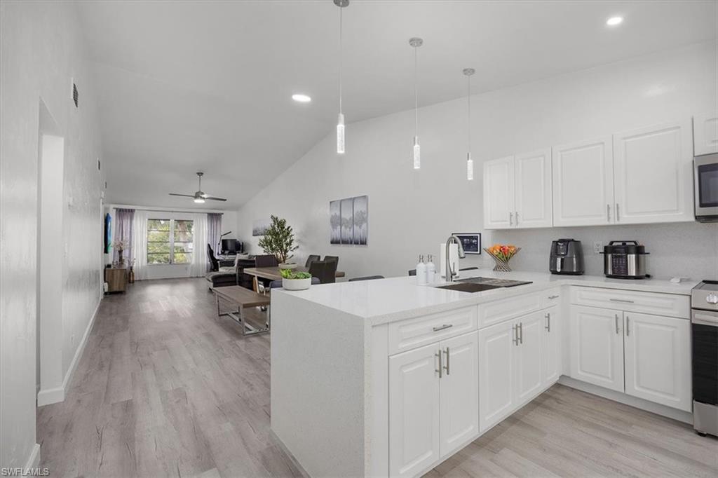 Discover the perfect blend of comfort, style, and location in this spacious second-floor corner condo in beautiful Naples. Featuring vaulted ceilings and serene garden views, this light-filled residence offers privacy and tranquility within the lush, peaceful community of Winterpark. This updated 2-bedroom, 2-bath home showcases an open, airy layout with neutral tones that complement any décor. The remodeled kitchen features modern cabinetry, quartz countertops, stainless steel appliances, and a convenient breakfast bar that flows seamlessly into the expansive living and dining areas—ideal for entertaining or relaxing at home. Both bathrooms have also been tastefully renovated. Other updates include a newer A/C and water heater, and a brand-new roof for added peace of mind. Flood insurance is covered by the association. Another advantage is the in-unit laundry room with washer, dryer, and abundant storage. Enjoy Florida living year-round from the screened porch overlooking the garden, the large heated community pool, tennis courts and other playing courts, as well as walking and jogging paths. Other features include private assigned parking and plenty of additional guest parking for even more convenience. Extra private storage accompanies this property to store your bike or anything else you may need. The location is perfect, only a few minutes to Downtown Naples and its world renowned beaches, plus easy access to exceptional dining, shopping and entertainment options. Pet-friendly, rental-friendly and without age restrictions, this condo presents an excellent investment opportunity or seasonal retreat. While other units may be available in the community, this beautifully updated corner residence truly stands out—one you must see in person to fully appreciate.