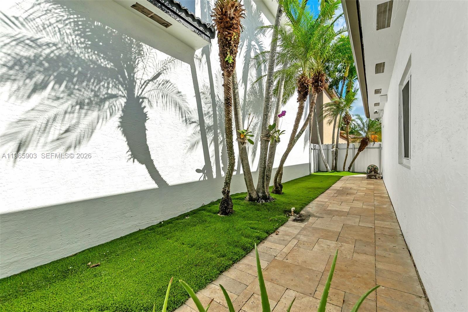 grass throughout, and exterior surveillance systems. This home also features a large travertine driveway and a