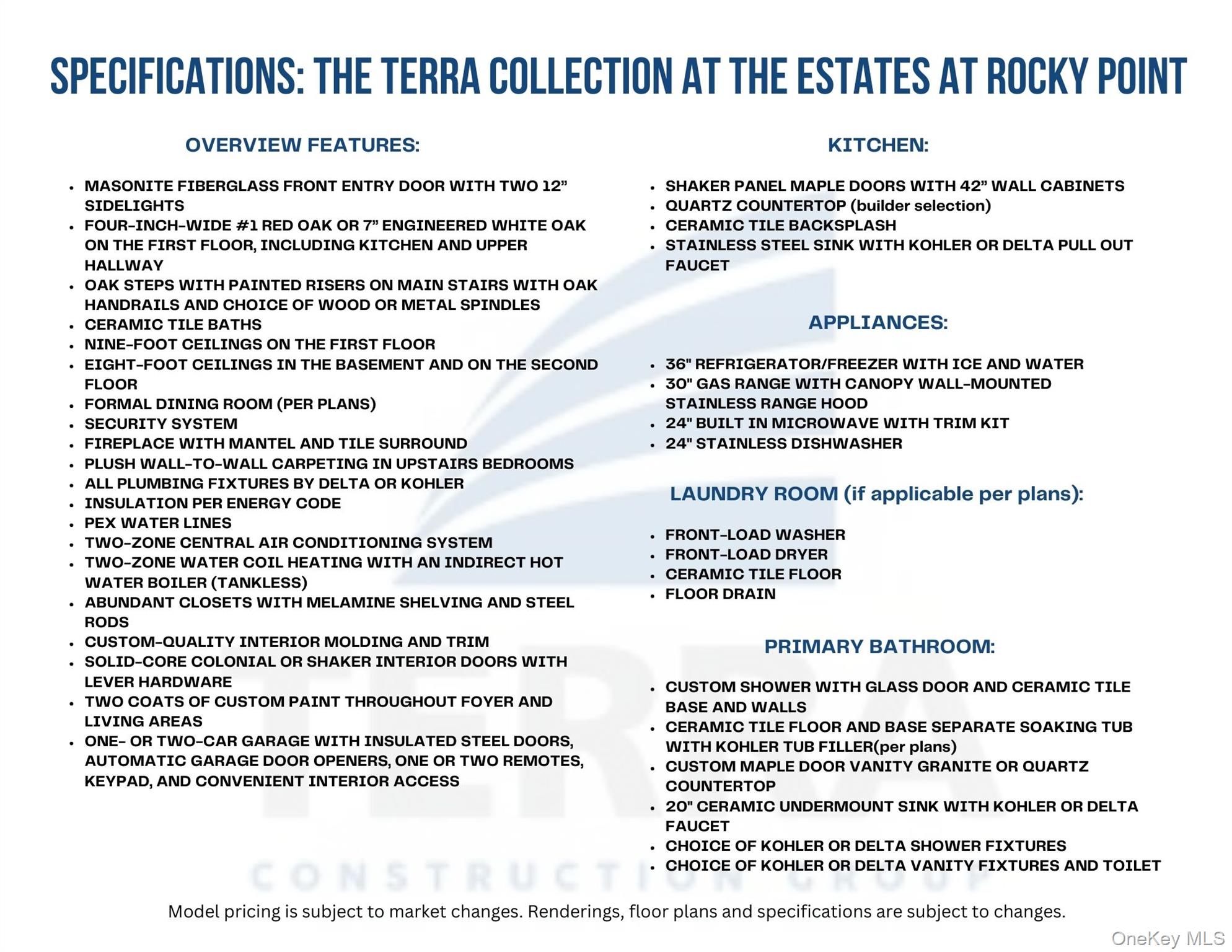 New Construction – To Be Built - The Terra Collection at The Estates at Rocky Point Welcome to The Terra Hampton Ranch II, a beautifully designed spacious ranch-style home by Long Island’s premier builder, Terra Construction Group, located in the desirable Estates at Rocky Point. This thoughtfully crafted home offers approximately 2, 050 square feet of well-designed living space, featuring 3 bedrooms, 2. 5 bathrooms, a 2-car garage, and a full basement with outside entrance. The bright and open floor plan showcases a dramatic living room with soaring ceilings, creating an airy and inviting atmosphere. Elegant red oak or engineered white oak flooring, custom interior moldings, and an open-concept layout seamlessly connect the living room, dining area, and kitchen—perfect for both everyday living and entertaining. The designer kitchen features shaker-style maple cabinetry with 42” wall cabinets, quartz countertops, ceramic tile backsplash, stainless steel sink with Kohler or Delta pull-out faucet, and a premium stainless appliance package including a 36” refrigerator with ice and water, 30” gas range with stainless canopy hood, built-in microwave, and stainless dishwasher. The primary suite offers a luxurious retreat featuring a custom tiled shower with glass door, ceramic tile floors, a soaking tub (per plan), and a custom maple vanity with granite or quartz countertop with Kohler or Delta fixtures. Two additional bedrooms provide comfortable space for family or guests. Built with quality and efficiency in mind, the home includes two-zone central air conditioning, energy-efficient insulation, PEX plumbing, and high-quality construction throughout. Exterior highlights include maintenance-free vinyl siding, 30-year architectural roof shingles, vinyl double-hung windows, asphalt driveway with paver border and walkway, underground utilities, seeded lawn, and an in-ground sprinkler system (up to 10 zones). The home is also solar-ready for future energy efficiency. Experience the ease of modern ranch-style living combined with superior craftsmanship in the exciting new community of The Estates at Rocky Point by Terra Construction Group.
