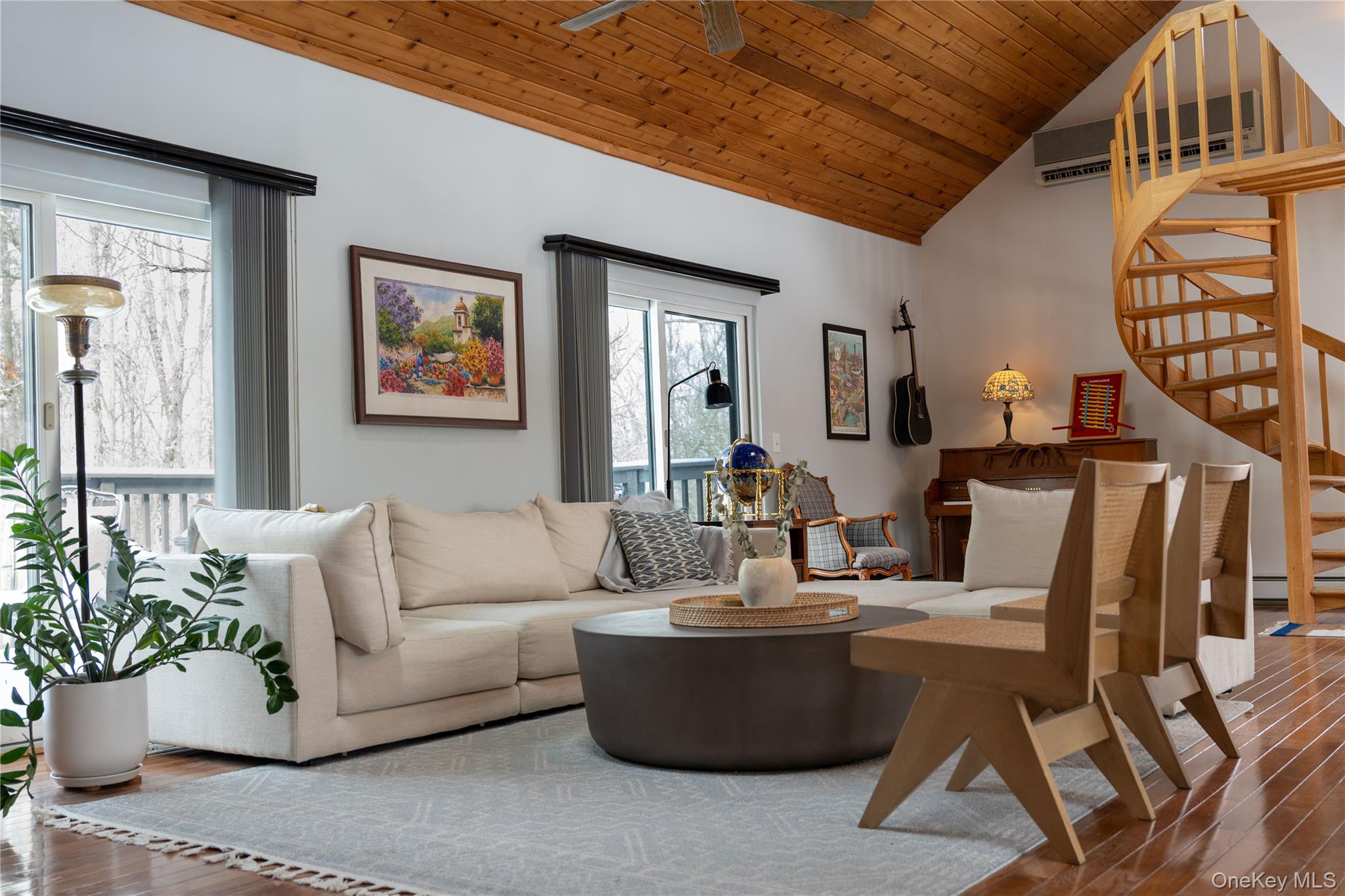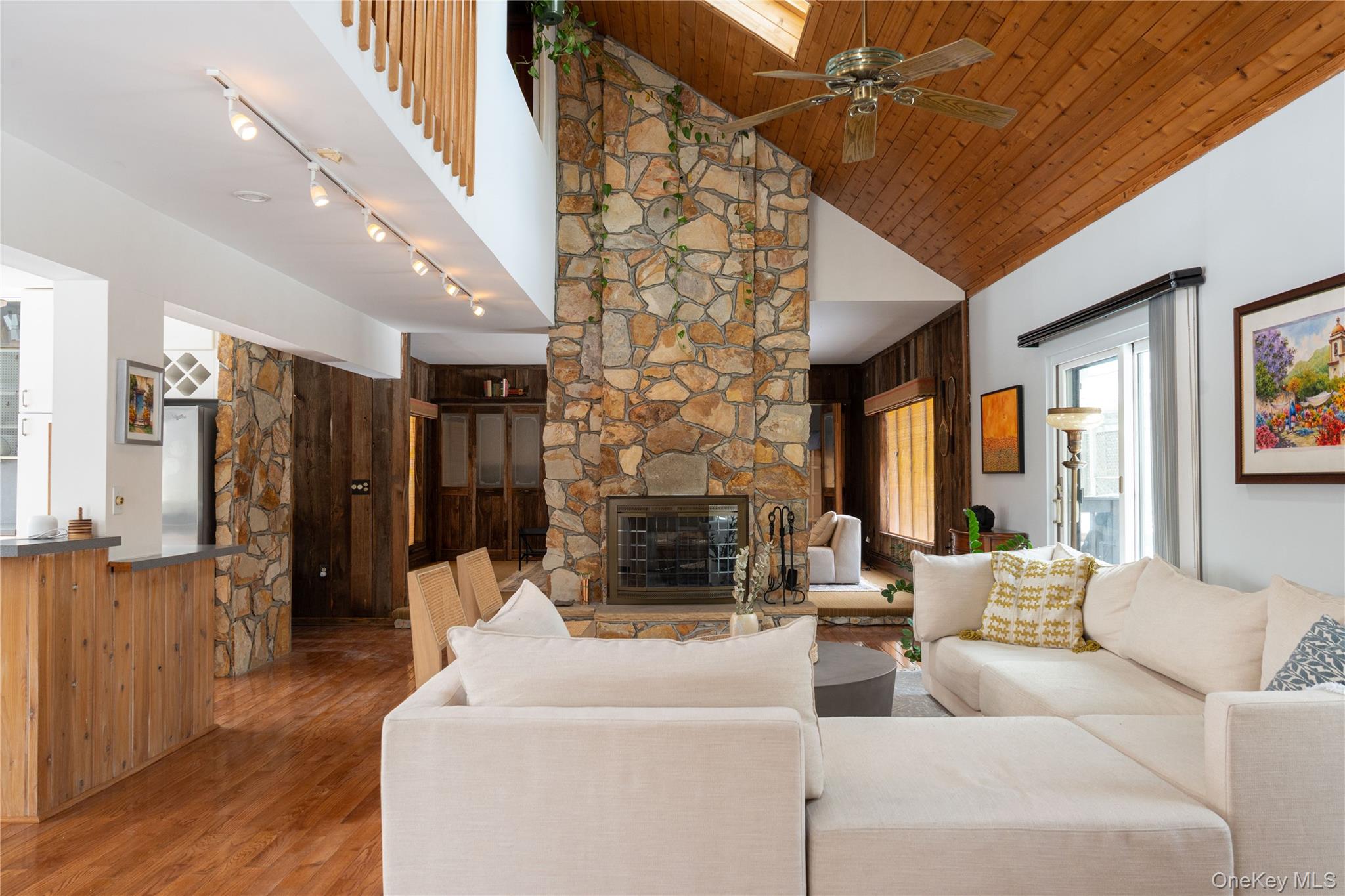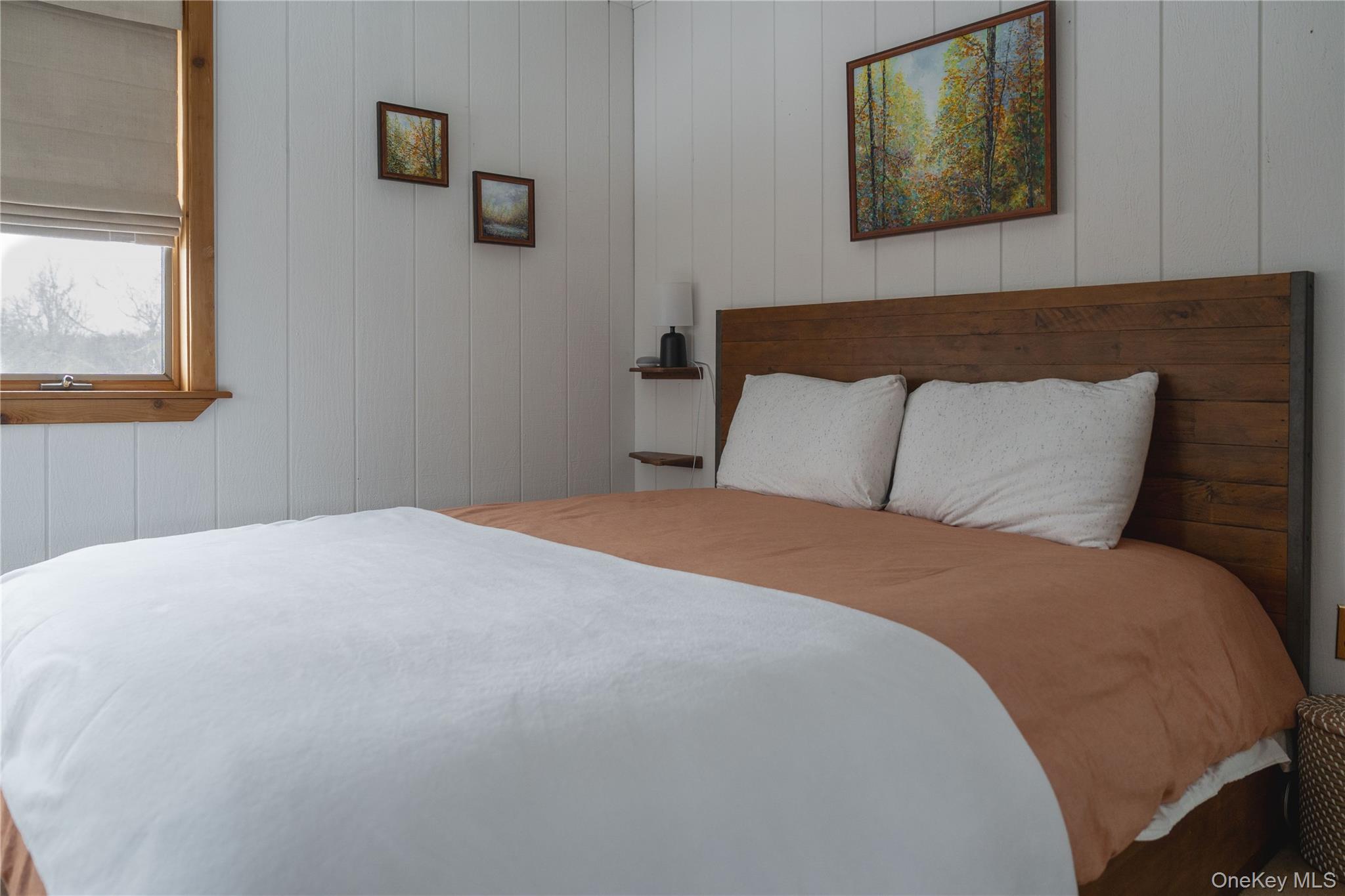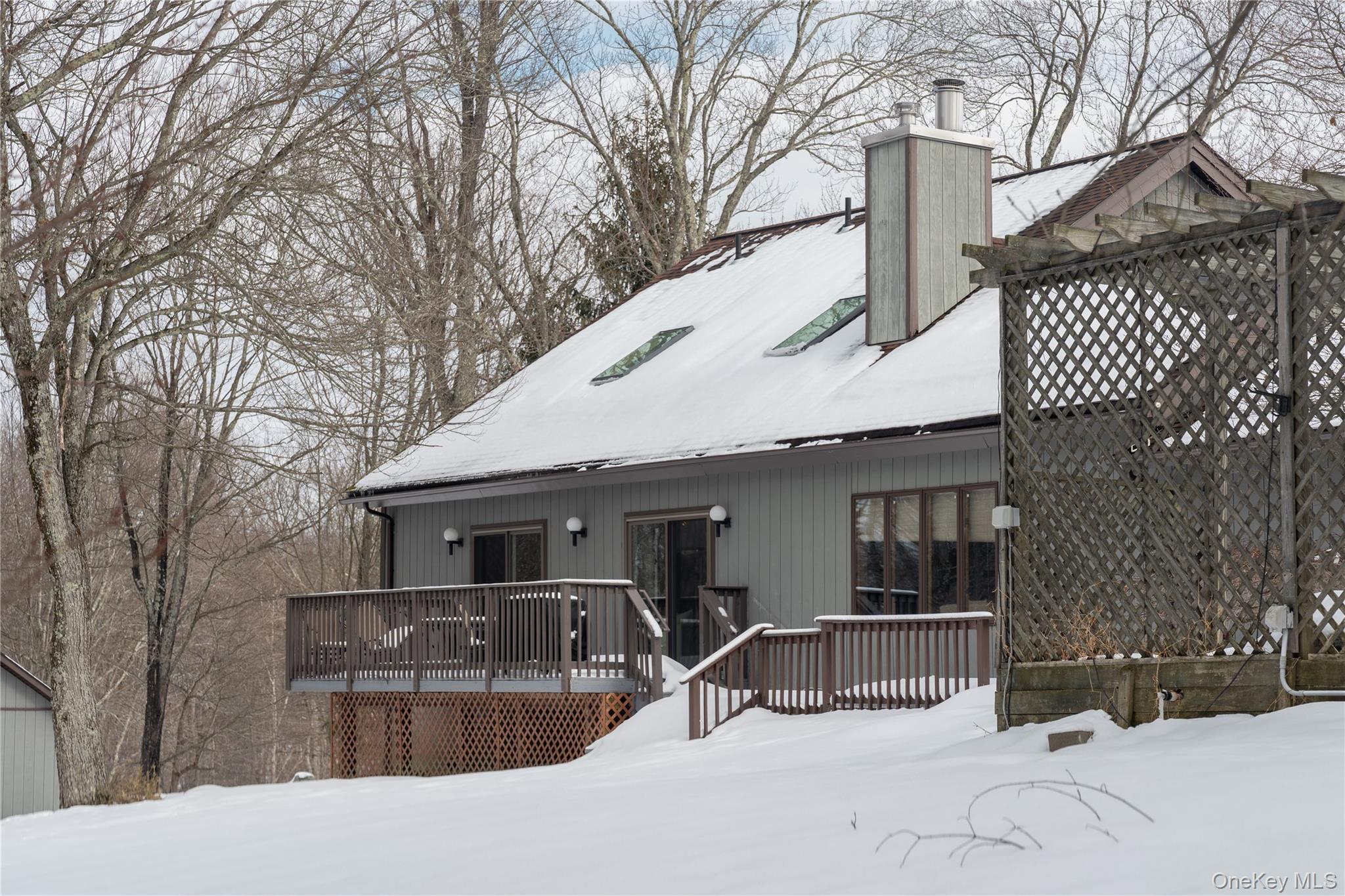 Set on 8 private wooded acres across from protected state land with miles of trails, this fully furnished contemporary home offers privacy, natural surroundings, and flexible living in the Hudson Valley. Located on a quiet country road, it’s ideal for remote work, seasonal stays, or extended escapes from the city. Available April 1 with lease terms from 3–18 months. Open and airy, the home features soaring ceilings, hardwood floors, and a bright contemporary layout. The main living space highlights a striking two-sided stone fireplace, with skylights and sliding doors that open to the outdoor deck areas, creating a natural indoor-outdoor flow perfect for entertaining or relaxing evenings by the fire. The main house includes two bedrooms, a full bathroom, and workspace upstairs, plus a downstairs den with bunk beds for additional sleeping space. Outdoor spaces feature a rear deck with grill, tiered front decks, and a fire pit area, perfect for enjoying the peaceful surroundings. A separate studio above the detached garage provides additional flexibility, with a queen bed, pull-out sofa bed, and full bath. Conveniently located close to the Village of Montgomery and within 30 minutes of Minnewaska State Park, Mohonk Preserve, local wineries, and farm-to-table restaurants, with shopping and dining in Middletown just minutes away. Easy access to I-84 and Route 17, and approximately 90 minutes from NYC. Fully furnished rental available April 1 with flexible lease terms from 3–18 months.