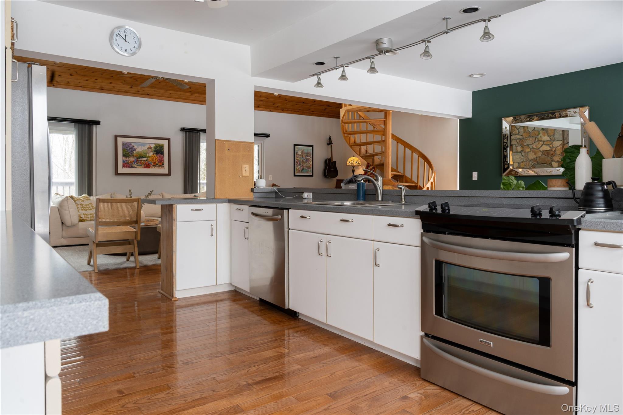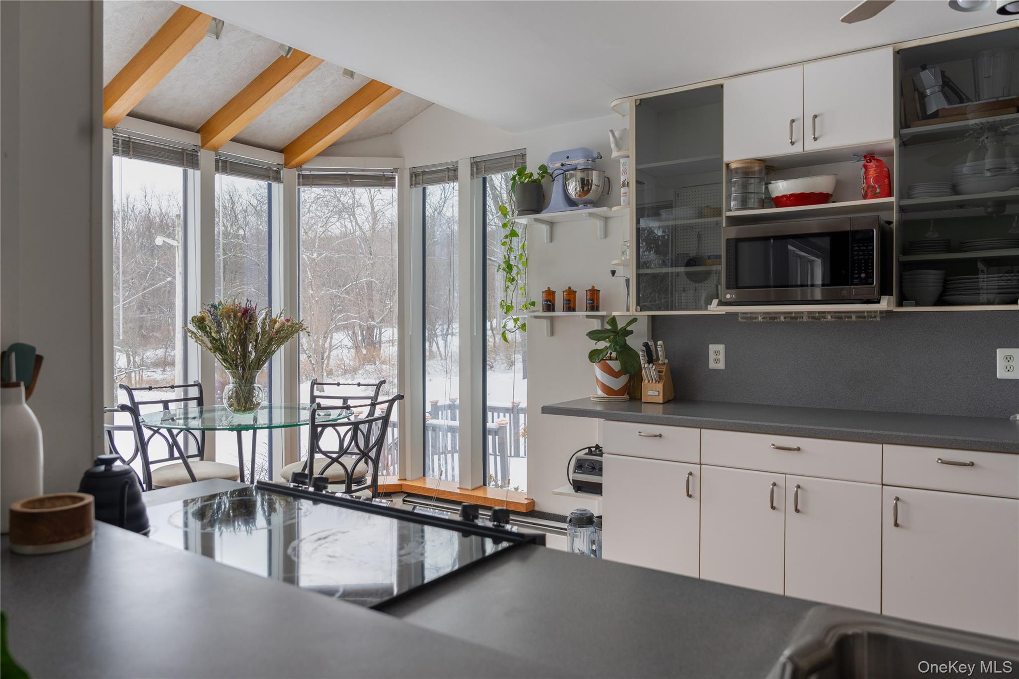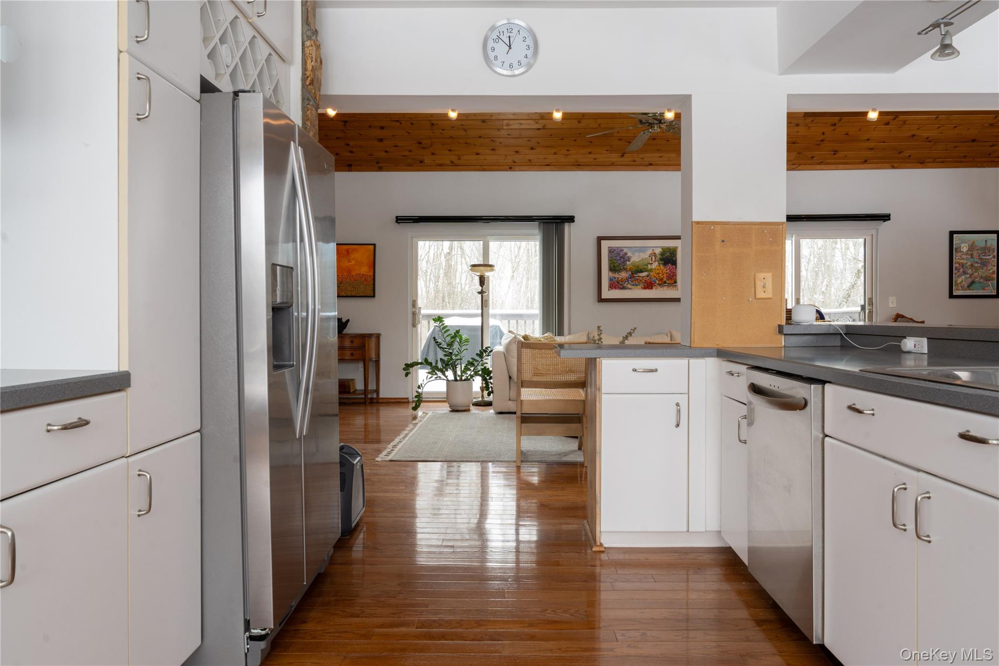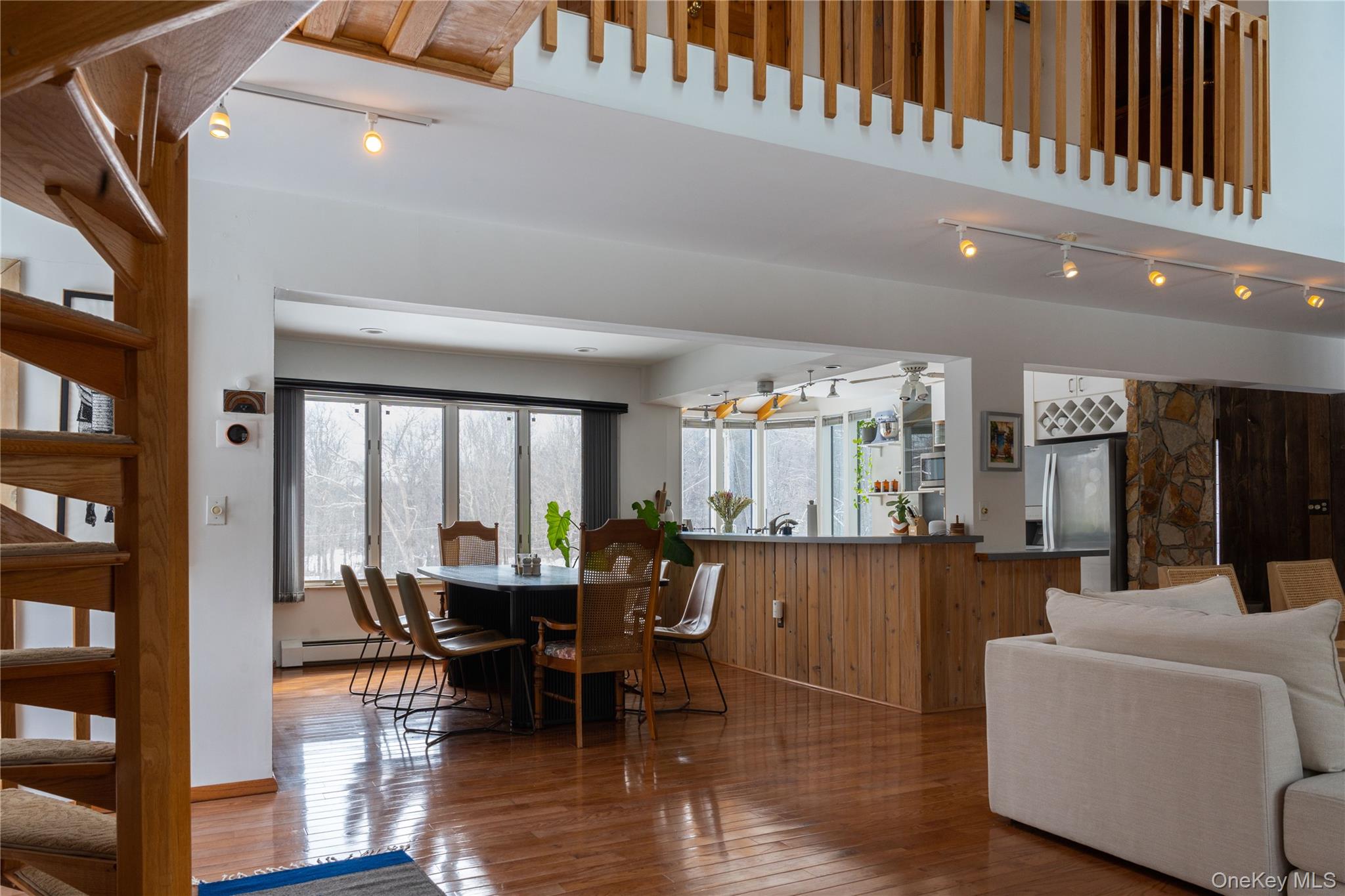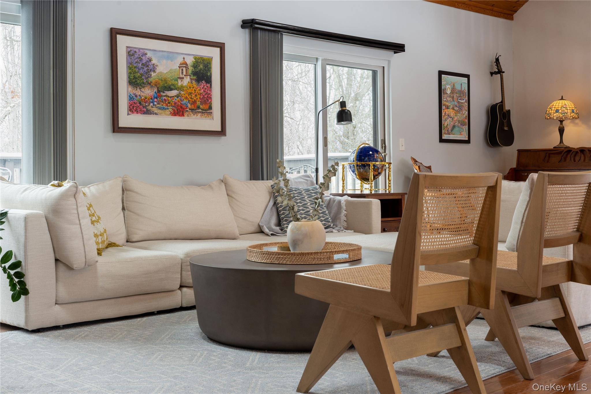 Set on 8 private wooded acres across from protected state land with miles of trails, this fully furnished contemporary home offers privacy, natural surroundings, and flexible living in the Hudson Valley. Located on a quiet country road, it’s ideal for remote work, seasonal stays, or extended escapes from the city. Available April 1 with lease terms from 3–18 months. Open and airy, the home features soaring ceilings, hardwood floors, and a bright contemporary layout. The main living space highlights a striking two-sided stone fireplace, with skylights and sliding doors that open to the outdoor deck areas, creating a natural indoor-outdoor flow perfect for entertaining or relaxing evenings by the fire. The main house includes two bedrooms, a full bathroom, and workspace upstairs, plus a downstairs den with bunk beds for additional sleeping space. Outdoor spaces feature a rear deck with grill, tiered front decks, and a fire pit area, perfect for enjoying the peaceful surroundings. A separate studio above the detached garage provides additional flexibility, with a queen bed, pull-out sofa bed, and full bath. Conveniently located close to the Village of Montgomery and within 30 minutes of Minnewaska State Park, Mohonk Preserve, local wineries, and farm-to-table restaurants, with shopping and dining in Middletown just minutes away. Easy access to I-84 and Route 17, and approximately 90 minutes from NYC. Fully furnished rental available April 1 with flexible lease terms from 3–18 months.