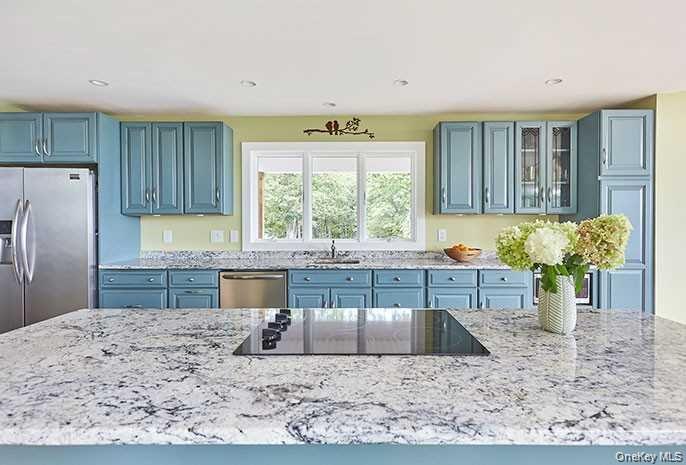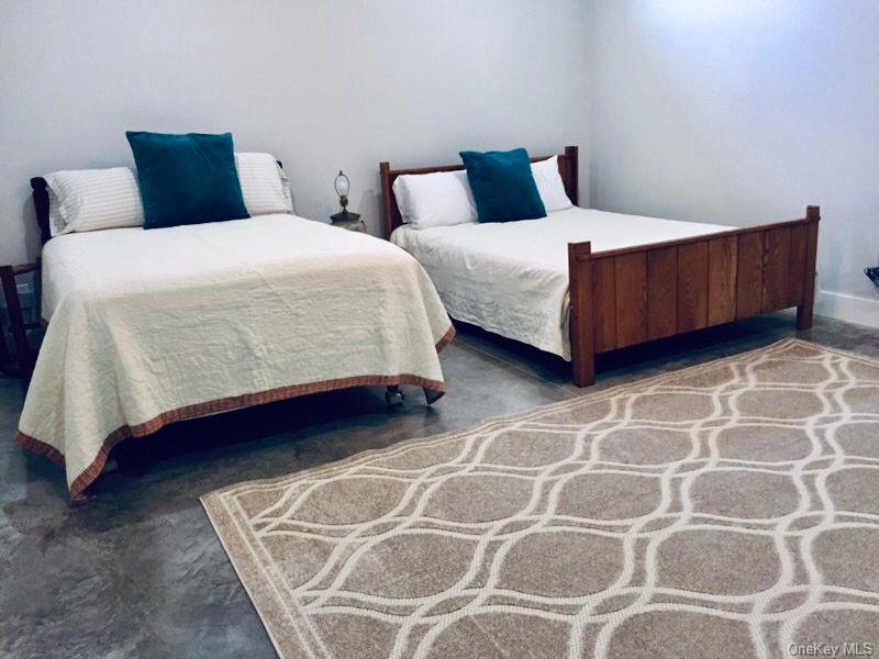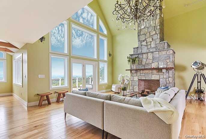 This custom-built house is located on a private road in Milan and offers sweeping views of the Berkshires and Stissing Mountain. The main level consists of a spacious open floor plan and features a living area with double-height ceilings, a stone two-story fireplace, beautiful kitchen & several dining areas. Ample windows and an expansive deck offer panoramic views from all three areas. The primary bedroom with ensuite bathroom, a powder room, and laundry room complete the first floor. On the second floor, there are two bedrooms and a full bathroom. The fully finished basement, perfect for guests or as an in-law suite, boasts high ceilings, poured concrete floors with radiant heat, two rooms that can be used as bedrooms and are equipped with beds, a full bath, an efficiency kitchen, and a family room that opens to a bluestone patio. There is a beautiful in-ground, heated pool, plus an outbuilding which adds approximately 800 sf of finished space on two levels, with a second floor deck, and a detached 2-car garage. The home sits on three private, landscaped acres.