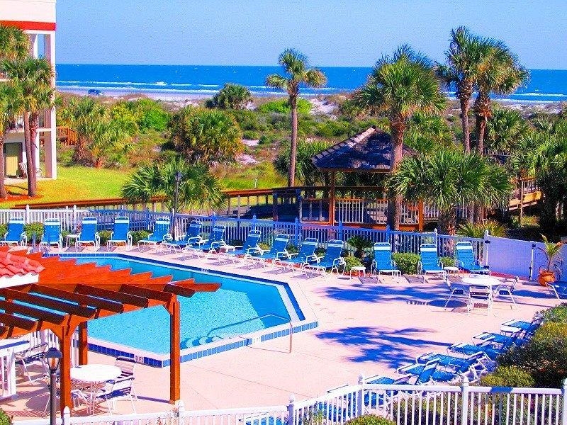 Enjoy the beach life in this FULLY FURNISHED 2/2 condo that is located just a short stroll from the white sand beaches, 2 swimming pools and tennis courts. Ocean Village Club is a gated community convenient to shopping and popular restaurants on St Augustine Beach. This condo offers upgraded kitchen and bathrooms, LVP flooring in the great room, king size bed in the primary bedroom and bunk beds in the 2nd bedroom. Enjoy ocean breezes on the lanai. Bring your swim suite and tooth brush. Available for 7-12 month lease on April 7th. Offered by CENTURY 21 St Augustine Properties and Beverly O'Nell, Property Mgr.