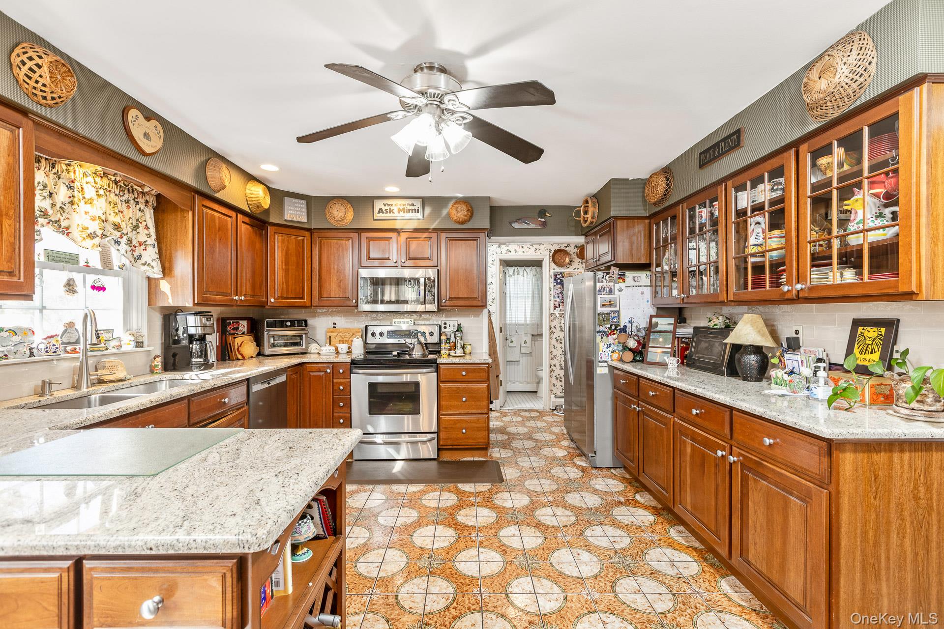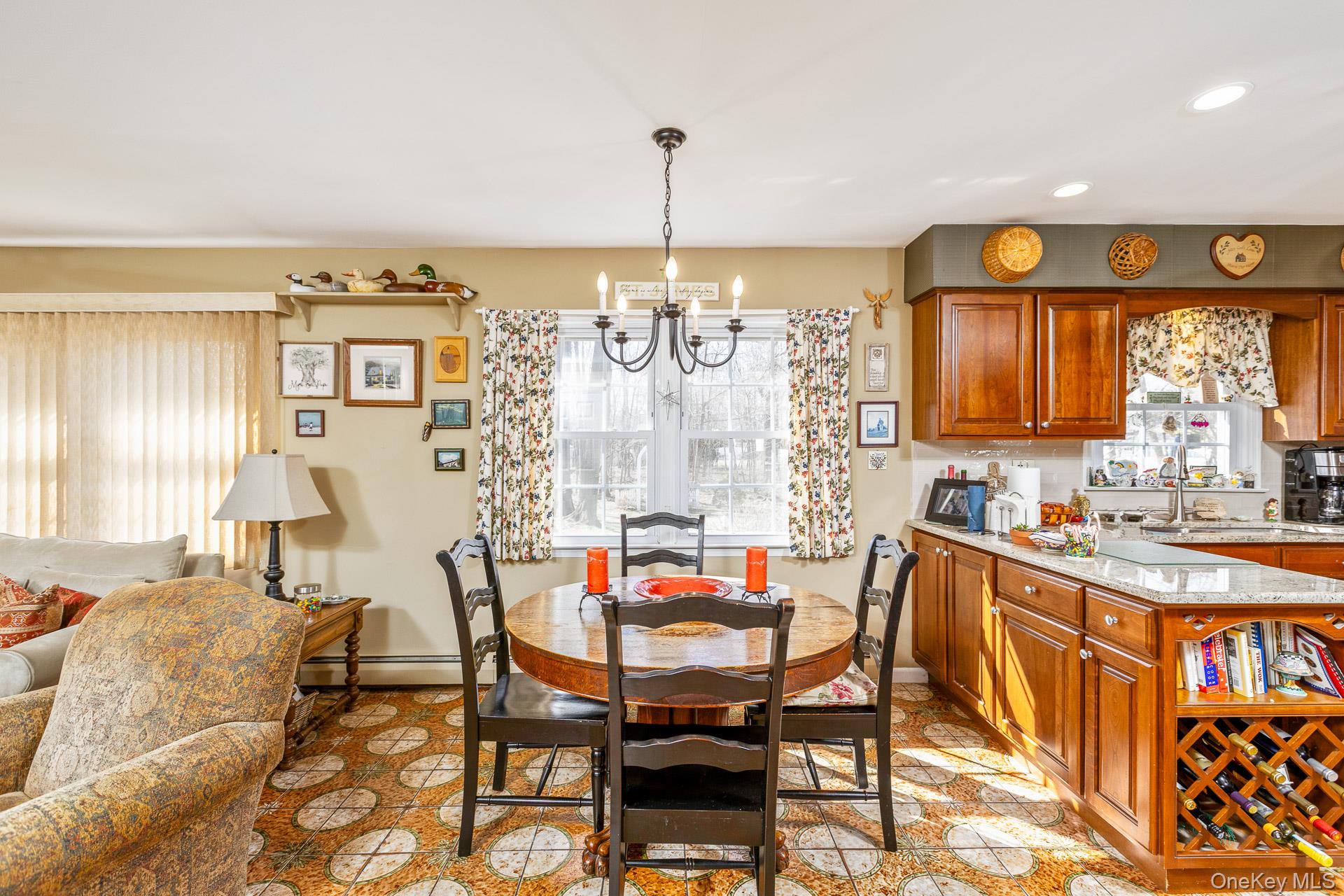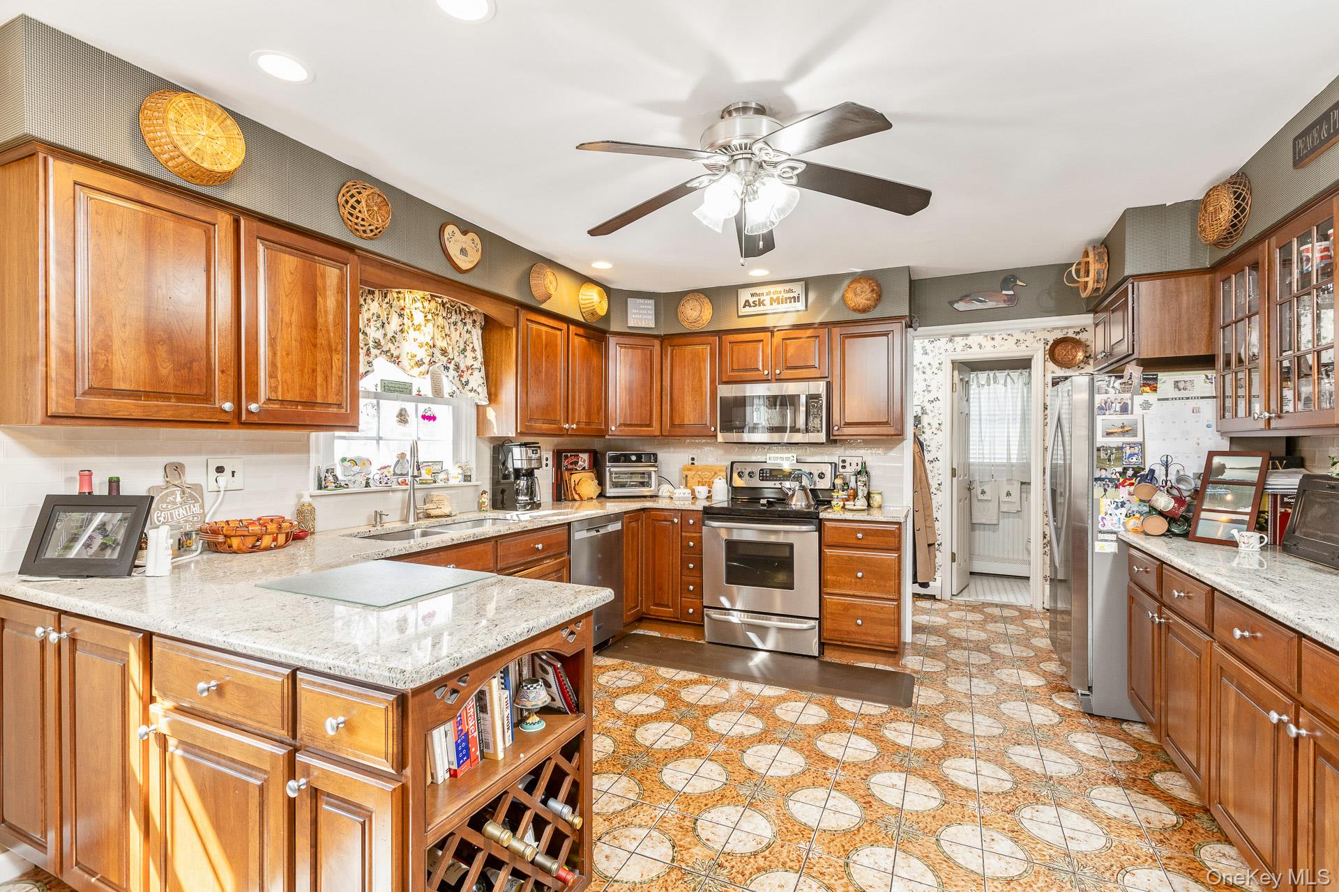 This cozy home is nestled in the quaint town of Saint James. Privacy is one of its' characteristics as it is set back from the road and has a large, fenced backyard. Since only a part of the backyard is finished, a large , tree filled area can be developed to accomodate a pool, athletic area or something of your choice. There are inground sprinklers front and back. The open floor concept of the kitchen and den invites friendly gatherings. The privacy of the dining room and living room makes for a cozy atmosphere. The attic is accessible from the upstairs hallway and there is a partial basement.