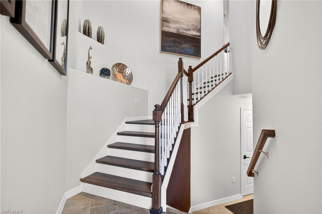 This spacious Bay Creek floor plan offers 2, 110 sqft of living space in a beautifully upgraded second floor residence. The home has been thoughtfully upgraded with designer finishes throughout, including fresh interior paint, upgraded wood and luxury plank vinyl flooring along the staircase, and modern lighting fixtures and ceiling fans installed throughout the interior and lanai. The kitchen has been elevated with a custom tile backsplash that extends above the cabinetry, creating a clean and sophisticated focal point. Matte black hardware, plumbing fixtures, and cabinet pulls have been installed throughout the home, establishing a consistent and contemporary design language. Storage and functionality were clearly prioritized in the improvements. All bedroom closets and the pantry have been professionally customized. Additional storage includes a built-in area beneath the staircase, expanded cabinetry within the laundry room, and overhead storage in the garage. Plantation shutters have been installed on every window, and the home also benefits from a Halo whole-home water purification and softening system. The layout is efficient and well balanced, offering generous living spaces filled with natural light. A screened lanai provides a comfortable setting for outdoor relaxation and year-round enjoyment of the Southwest Florida climate. Residents of Lamorada enjoy a comprehensive suite of resort-style amenities that support an active and social lifestyle. The community features a well-appointed clubhouse, resort pool and spa, fitness center, tennis courts, pickleball, bocce, and a private movie theater. These amenities are included within the community’s low HOA and condominium fees. The location in North Naples places residents within minutes of the Gulf beaches, Mercato, Downtown Naples, and the restaurants and shops of Fifth Avenue South. With no CDD obligations, this property represents a compelling opportunity within one of Naples’ most desirable residential communities.