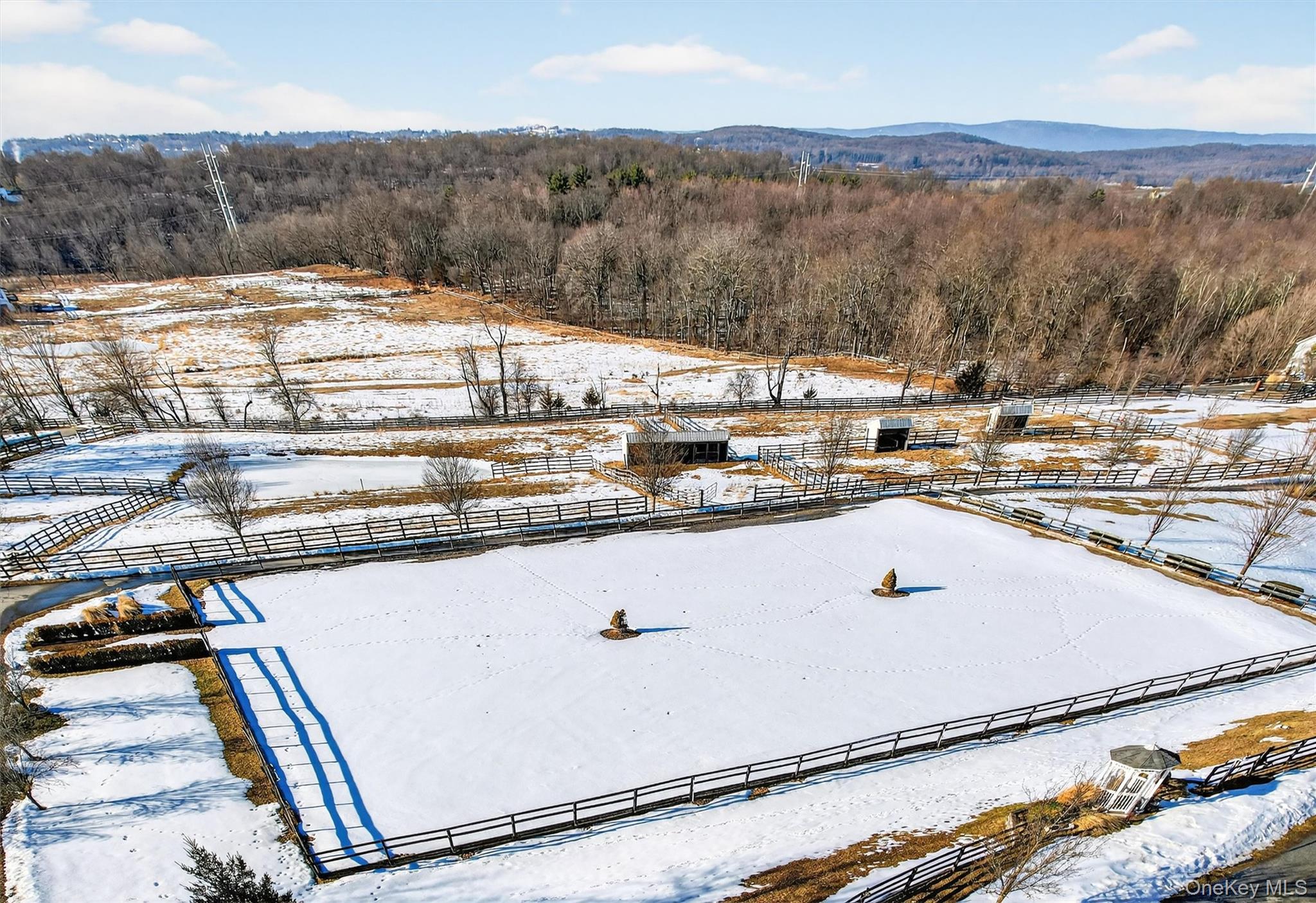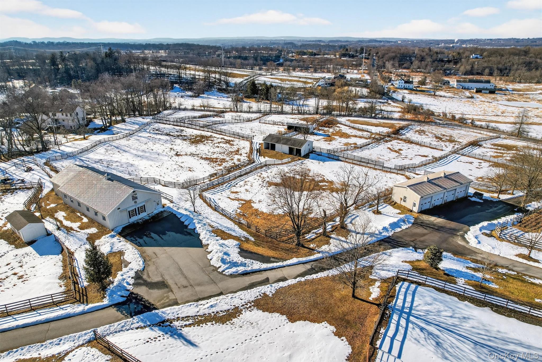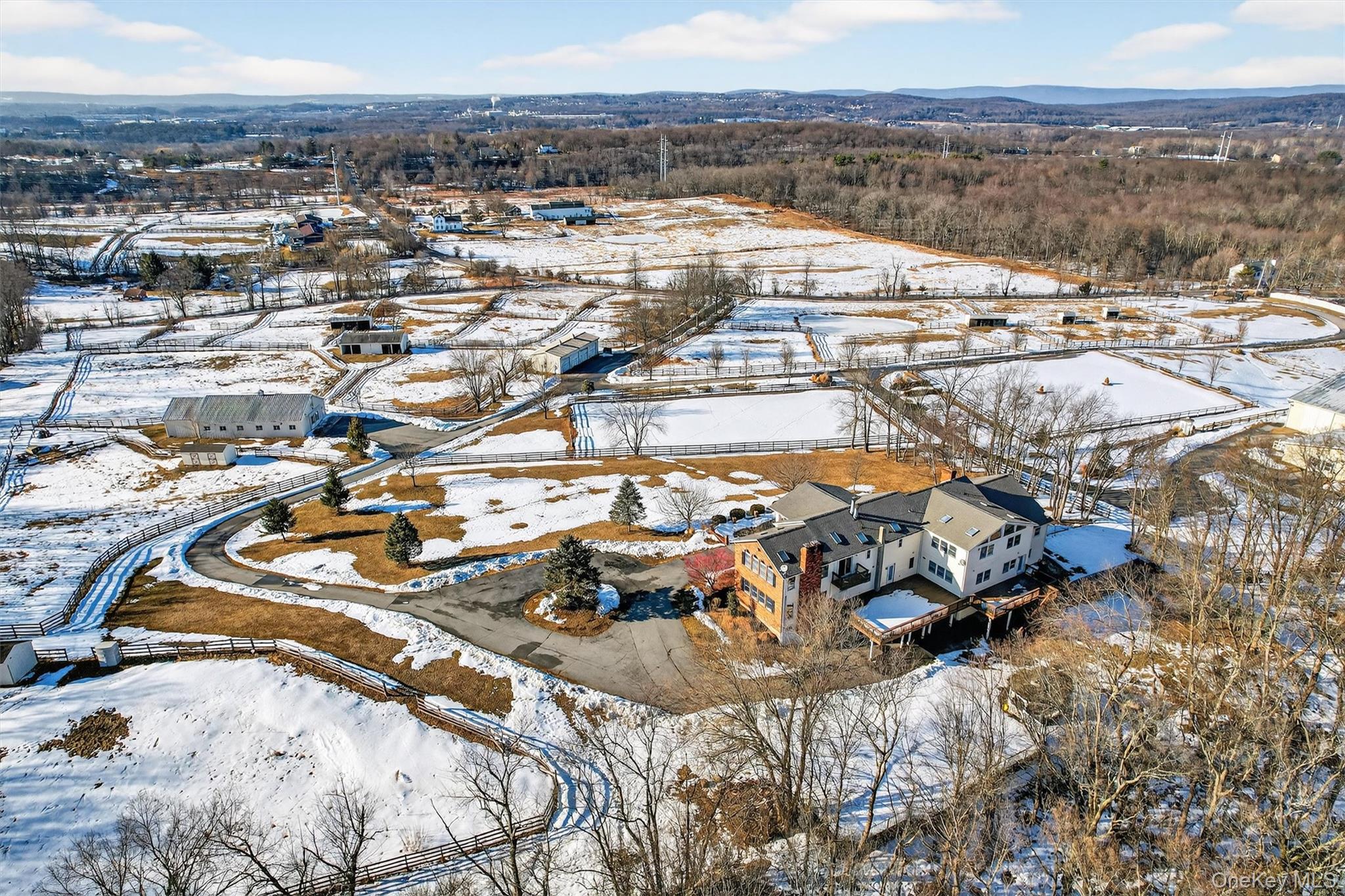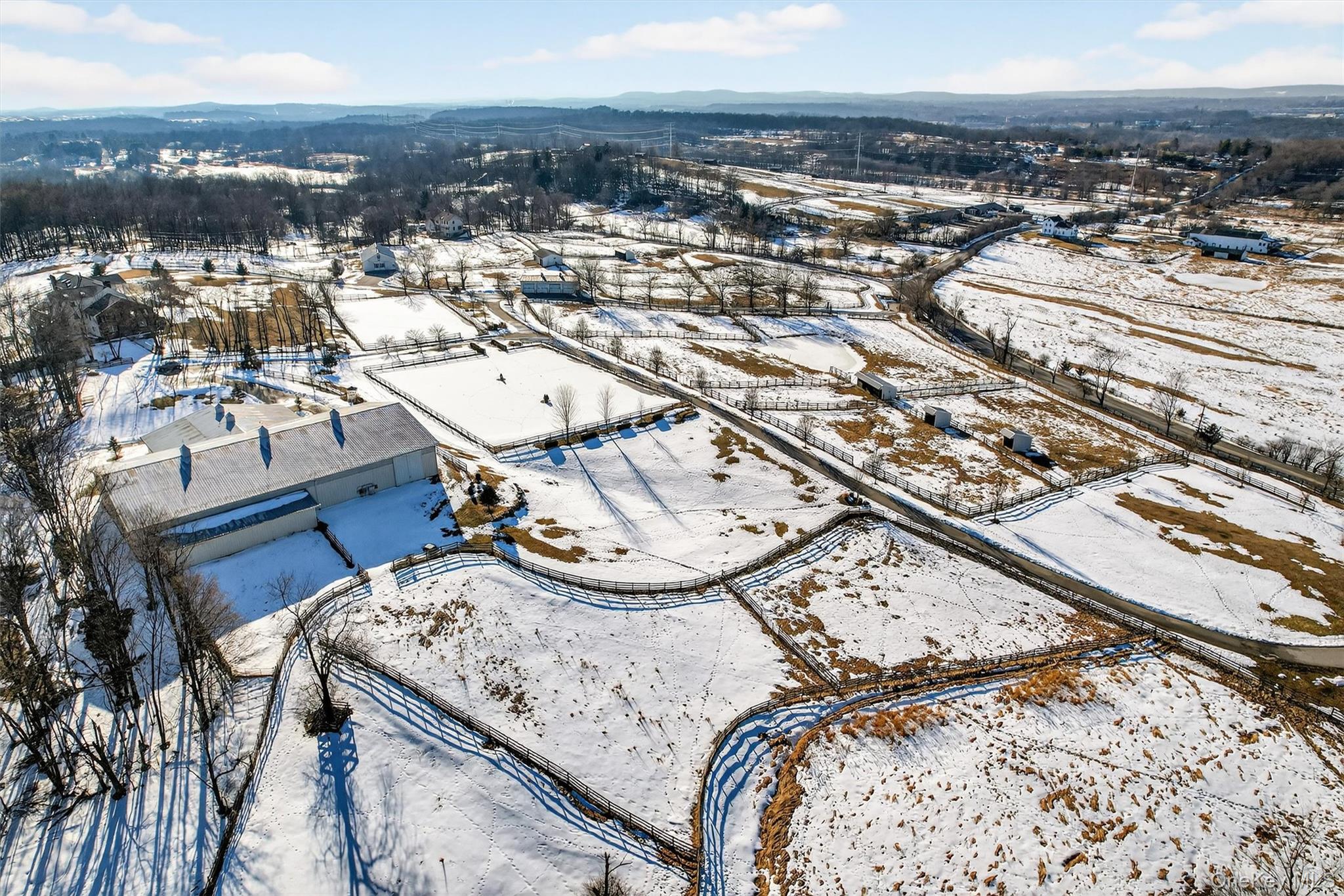 For your consideration is 285 Hill Road, a premier equine boarding, training and showing facility formerly known as Hilltop Equestrian Center and Seven Meadows Farm. Designed for function and beauty, it's a welcoming destination for both clients and guests. Numerous shows and clinics have been successfully hosted here over the years. The property includes a professional indoor arena complex, 2 outdoor rings, second barn, 21 paddocks, 4 shedrows, 3 run-ins, a 4 bay equipment garage, and a 6, 460 sf home to name a few of the many features this property offers. The spectacular indoor arena complex was built with both operational flow and refinement in mind. 8 massive Palladian windows give plenty of natural light and style to the 75x130 ring, new overhead lighting for evening lessons, sprinkler system, mirrored long side, pedestrian walkway allows foot traffic to flow, raised and heated viewing lounge to give spectators a comfy space to see the action. The attached barn has 2 brick aisleways, 13 matted stalls with swing out corner feeders, heated tack room and office, hot and cold wash stall, and a large hay loft. There are 2 outdoor sand rings with sprinkler systems, one with a hedgerow ingate - one of many classic touches around the property. The second barn, Morton built, has 15 matted stalls with swing out corner feeders, brick paver entrance and aisleway, a large heated office and plenty of adjacent turnout. There is water throughout the property. The 4 bay equipment garage is centrally located. From the top of the knoll, the stately 5 bedroom, 4 bathroom 6, 460 sq federal style home overlooks it all. The home is quite spacious, and the layout suits both everyday living and entertaining with walls of windows showcasing farm views and beyond, skylights, 5 fireplaces, an expansive kitchen, and a primary suite with 2 fireplaces and a sitting room. Do you need separate space for farm managers, trainers, extended family or guests? Take advantage of a private area with a separate entrance, second kitchen with family room, full bath and large bedroom. The backyard is fenced for your pets, and has a gazebo and firepit area for even more fun! This Orange County centrally located farm is set in a lovely, upscale neighborhood close to Stewart State Forest trails, HITS, many area rated and schooling shows, Minnewaska, Mohonk, and some great local trail spots. A short drive to downtown Goshen gives you plenty of restaurants to choose from. Close to Stewart Airport and NYAIC, 60 miles to NYC and 5 miles to NJ Transit station. Goshen School District Please see attached features list for more details. This is a rare and exceptional offering for the serious equestrian entrepreneur!