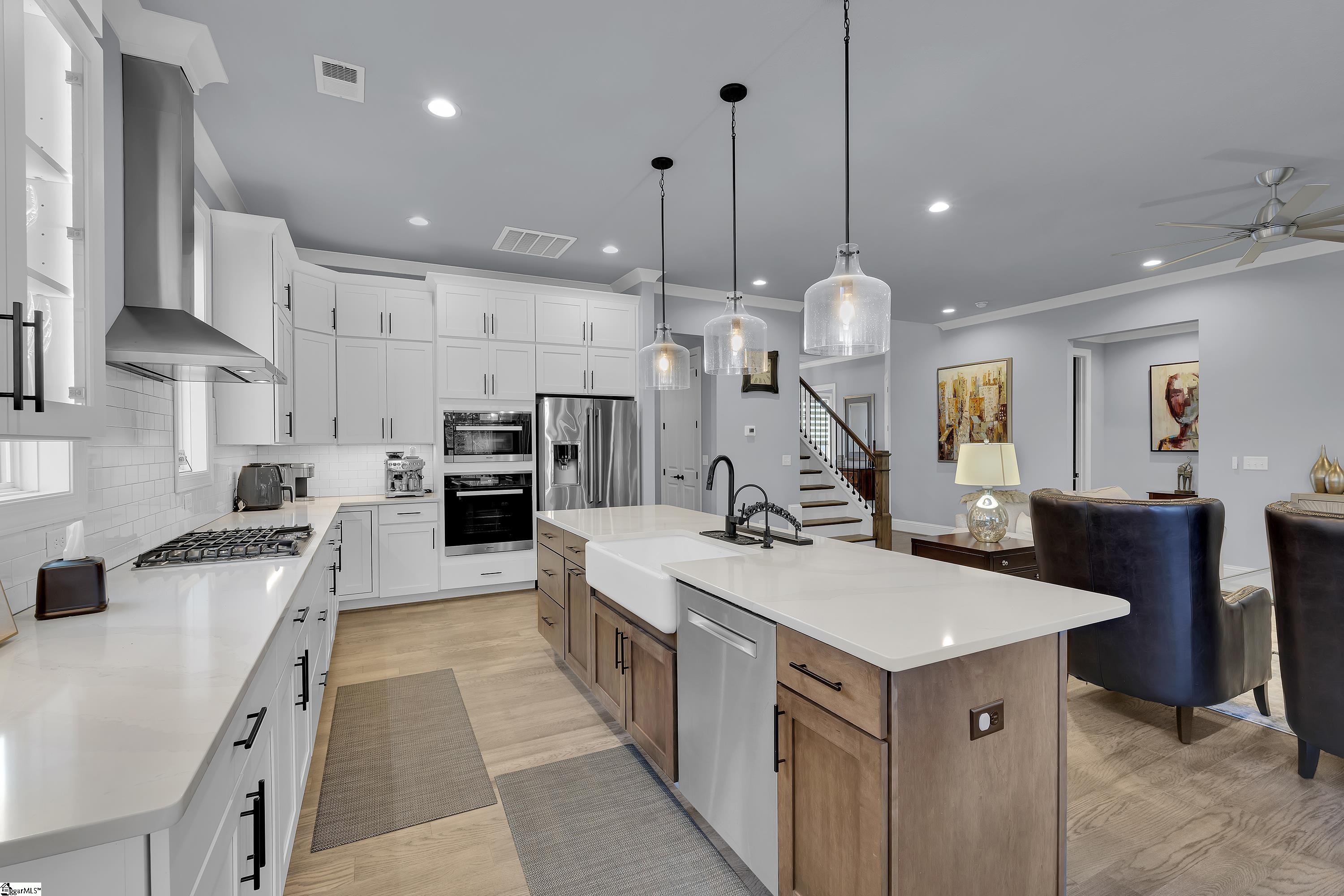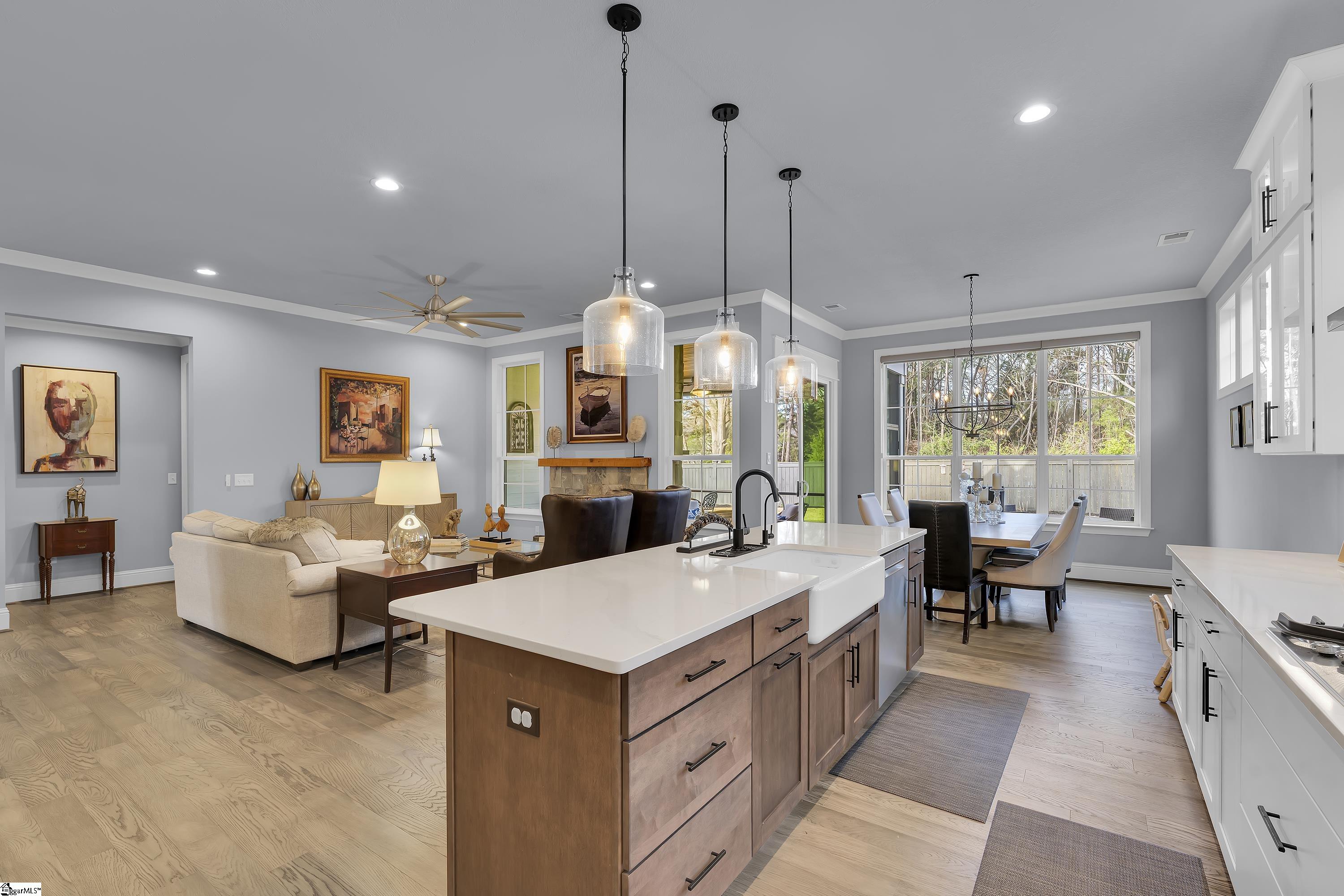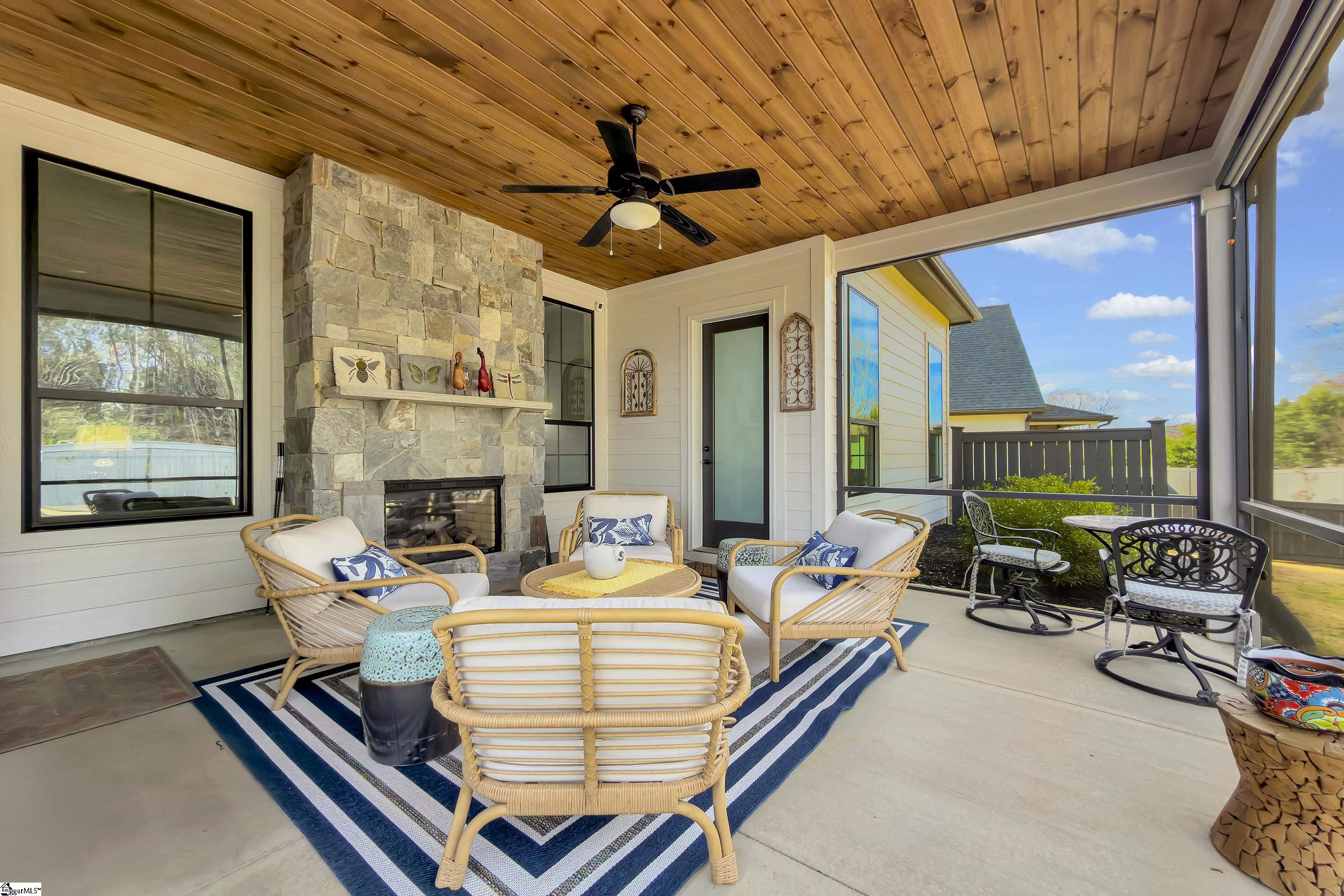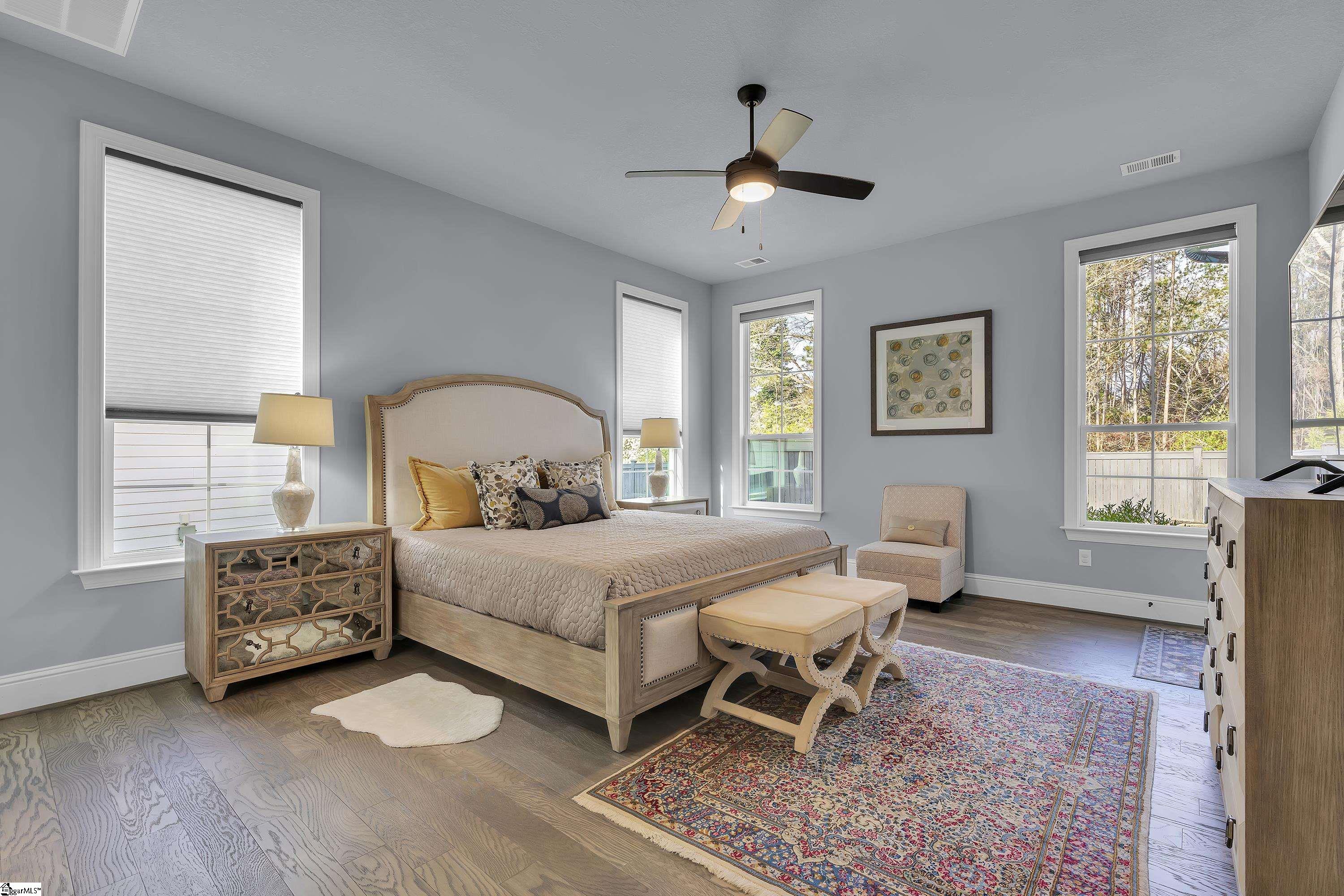 This beautifully appointed former model home showcases exceptional upgrades and a thoughtfully designed open floor plan. Featuring 4 bedrooms and 2. 5 baths, the layout includes a primary suite and guest bedroom conveniently located on the main level, with two additional bedrooms and a spacious loft upstairs. The inviting family room features a cozy fireplace with gas logs that opens through to the charming screened porch, creating the perfect indoor-outdoor living experience. Enjoy relaxing or entertaining on the screen porch with tongue-and-groove ceiling overlooking the fenced backyard and patio. The chef’s kitchen is truly a dream, complete with quartz countertops, a large island, stainless appliances, a walk-in pantry, and a premium Miele electric oven with dual steam capability. A reverse osmosis water system is conveniently installed under the kitchen sink. The luxurious primary suite offers a custom walk-in closet and spa-like bath featuring a soaking tub, large separate shower, and double sinks. Additional highlights include: Hardwood floors throughout the main level, laundry room with abundant cabinetry and utility sink, custom shades throughout the home - many with remote control, two-car garage with workstation and ceiling storage rack, and LeafFilter gutter protection system. Perfectly located in the desirable Five Forks area, this home is just minutes from shopping, dining, and everyday conveniences.