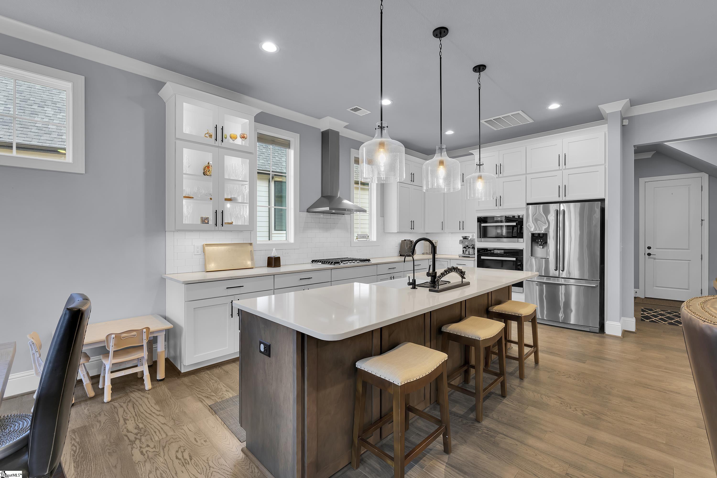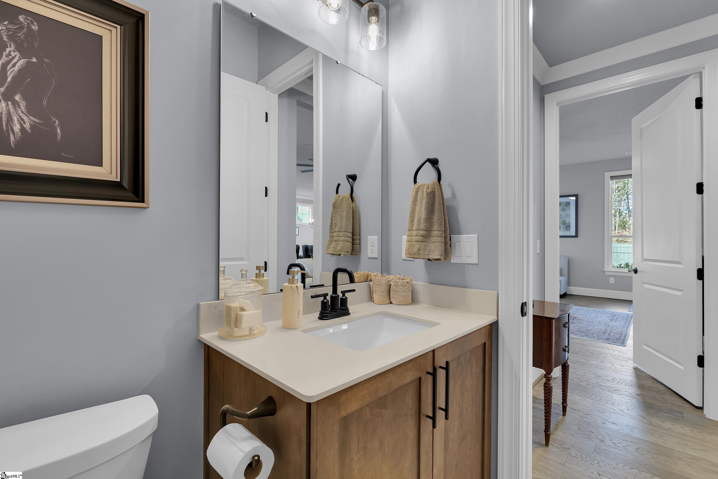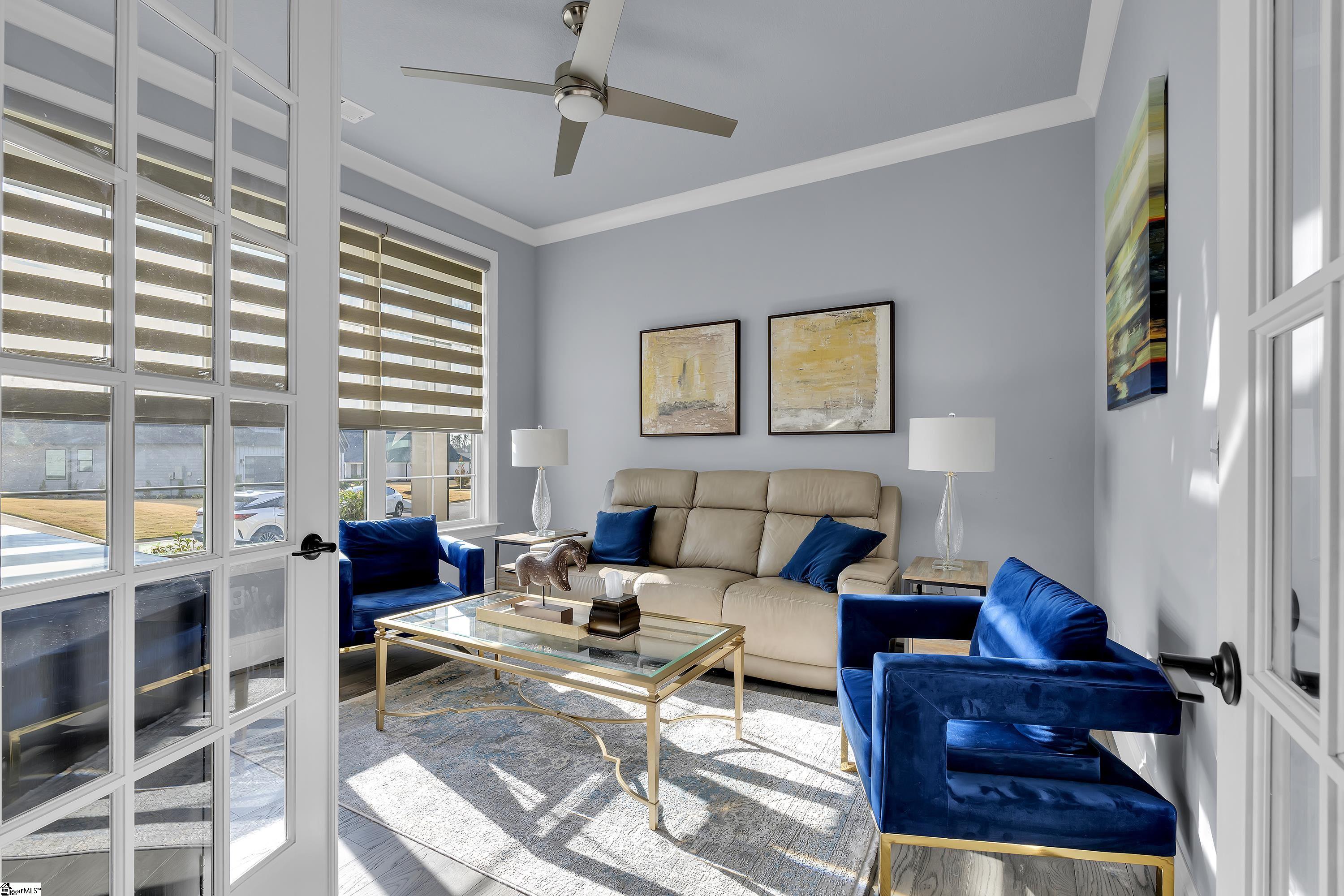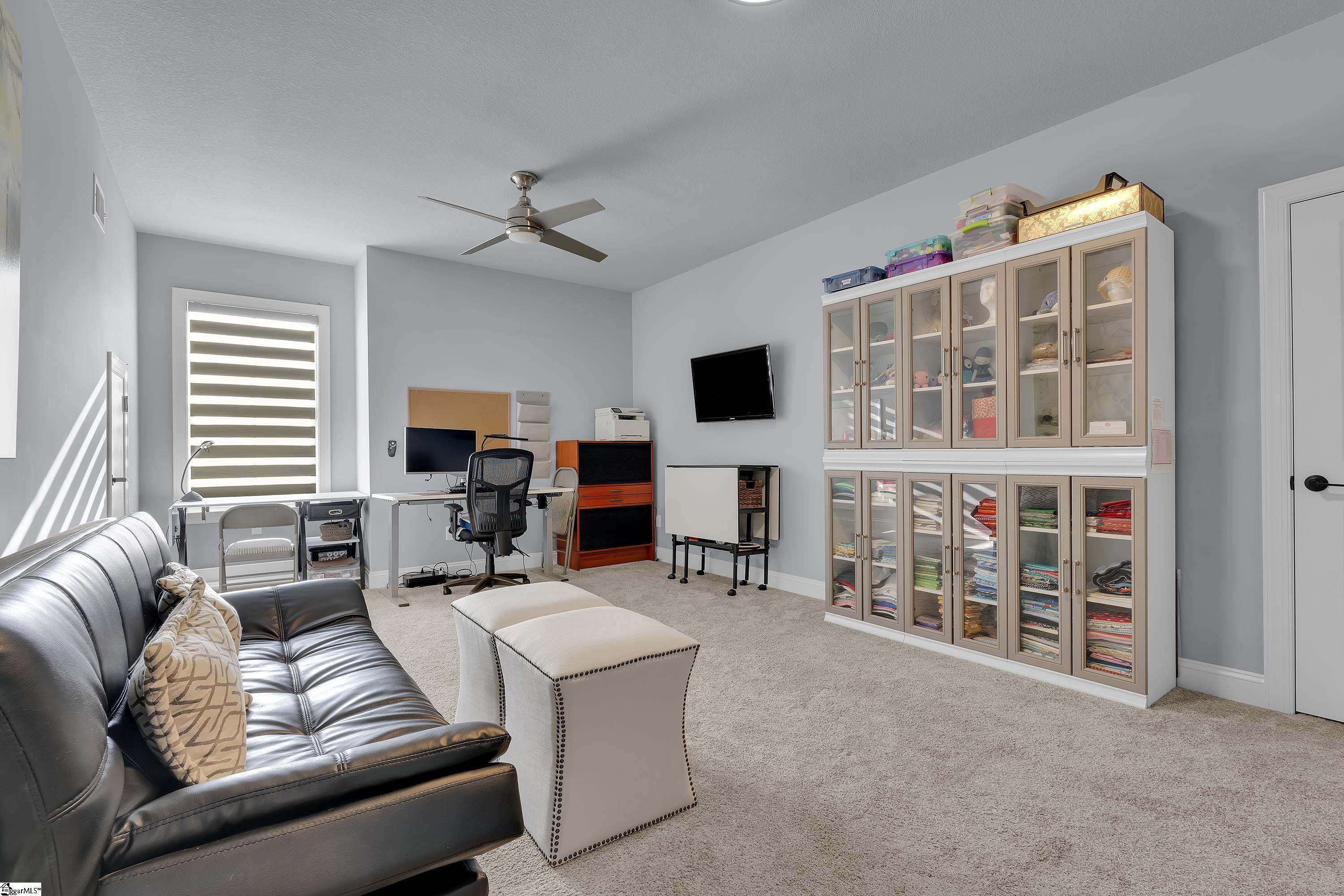 This beautifully appointed former model home showcases exceptional upgrades and a thoughtfully designed open floor plan. Featuring 4 bedrooms and 2. 5 baths, the layout includes a primary suite and guest bedroom conveniently located on the main level, with two additional bedrooms and a spacious loft upstairs. The inviting family room features a cozy fireplace with gas logs that opens through to the charming screened porch, creating the perfect indoor-outdoor living experience. Enjoy relaxing or entertaining on the screen porch with tongue-and-groove ceiling overlooking the fenced backyard and patio. The chef’s kitchen is truly a dream, complete with quartz countertops, a large island, stainless appliances, a walk-in pantry, and a premium Miele electric oven with dual steam capability. A reverse osmosis water system is conveniently installed under the kitchen sink. The luxurious primary suite offers a custom walk-in closet and spa-like bath featuring a soaking tub, large separate shower, and double sinks. Additional highlights include: Hardwood floors throughout the main level, laundry room with abundant cabinetry and utility sink, custom shades throughout the home - many with remote control, two-car garage with workstation and ceiling storage rack, and LeafFilter gutter protection system. Perfectly located in the desirable Five Forks area, this home is just minutes from shopping, dining, and everyday conveniences.