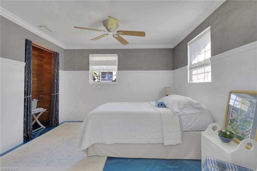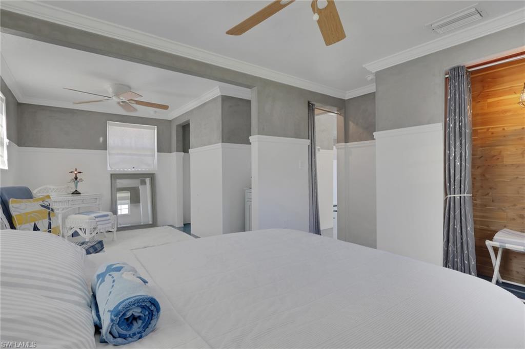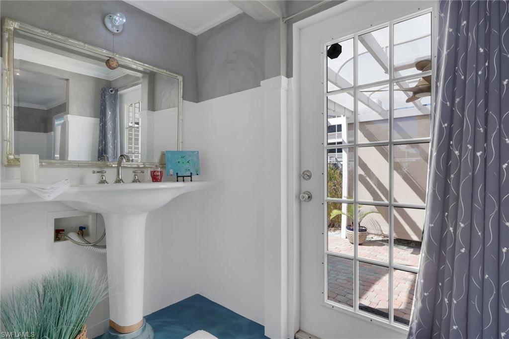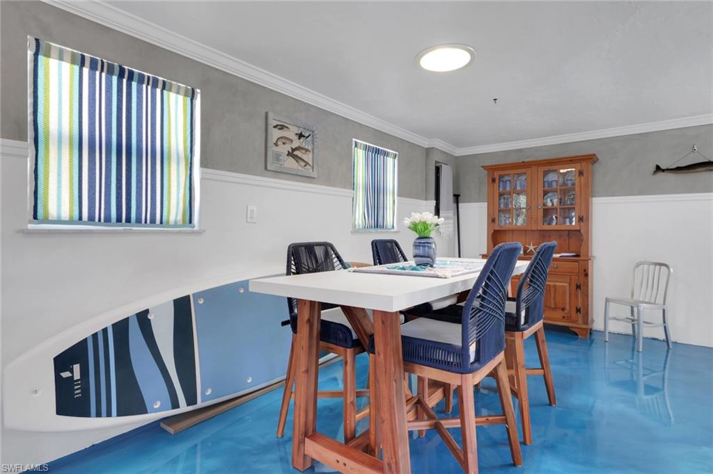The interior continues the refined coastal narrative with hand-glazed concrete walls and a remarkable 10-layer continuous poured epoxy floor in sapphire tones, evoking the layered hues of the ocean. The flexible layout includes two bedrooms plus a sun room that could function as a third sleeping area, a spacious primary suite with separate sitting area and dual closets, and a marble tile bath with hand-laid detailing. The kitchen features a restaurant-style stainless steel sink and console, custom concrete dining table, and solid wood cypress cabinetry, all conveying durability and design. Art glass doors and custom carved elements further elevate the aesthetic. Offered fully turnkey with furnishings included, this residence is primed for immediate enjoyment or income production in one of Naples’ few waterfront communities without restrictive rental limitations.