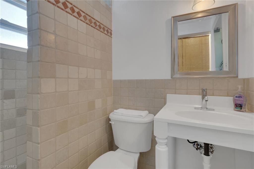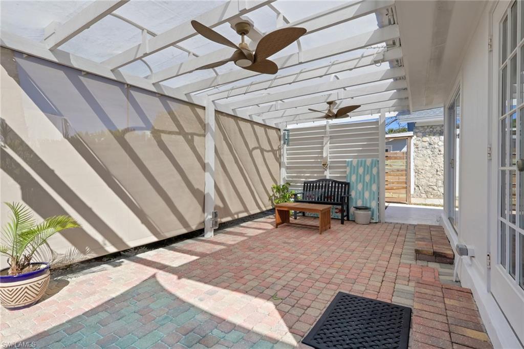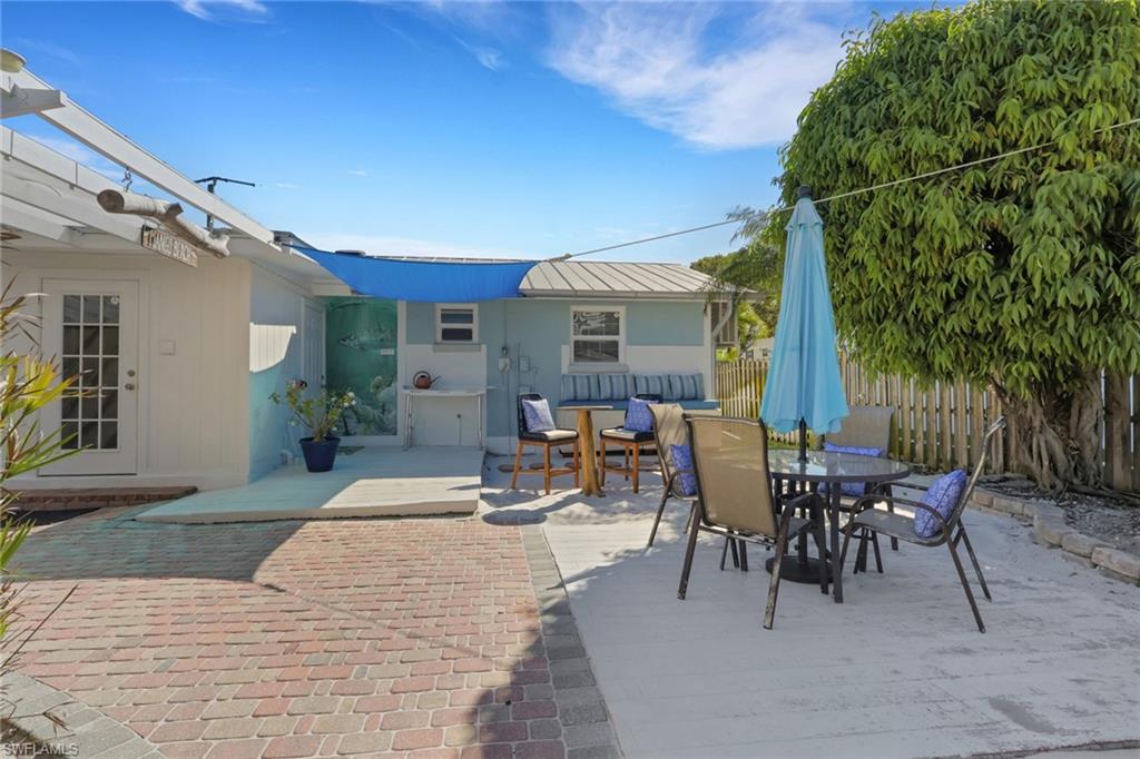 The Blue Cottage is a coastal mid-century showpiece set along Gulf Harbor’s widest canal, where nearly continuous seawall construction helps preserve depth and water clarity while offering direct, minutes-to-the-Gulf access via the Cocohatchee River. From the moment you enter through a private coco plum arbor, the home unfolds into a meticulously designed waterfront compound complete with a 10-ton sandy beach, extensive paver hardscape, and a dramatic 12’ x 18’ copper trimmed covered wood arbor with ceiling fans, lighting, retractable wall elements, and slatted shutters that can open seamlessly to the outdoors. A full dock with water and electric service, 10, 000-pound boat lift, fish cleaning station, storage boxes, and walkway access around the vessel make this an ideal property for serious boaters. A hand-painted fish mural by renowned Florida artist Jared Stinchcomb — known for his work at the Marco Island Historical Museum — creates a one-of-a-kind artistic focal point. Located beside the historic stone coral bait house from Gulf Harbor’s early days as a natural fishing estuary, the setting is rich in authentic Old Florida charm.