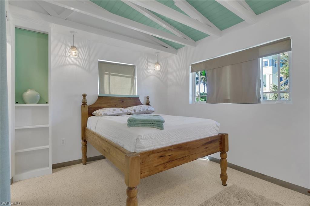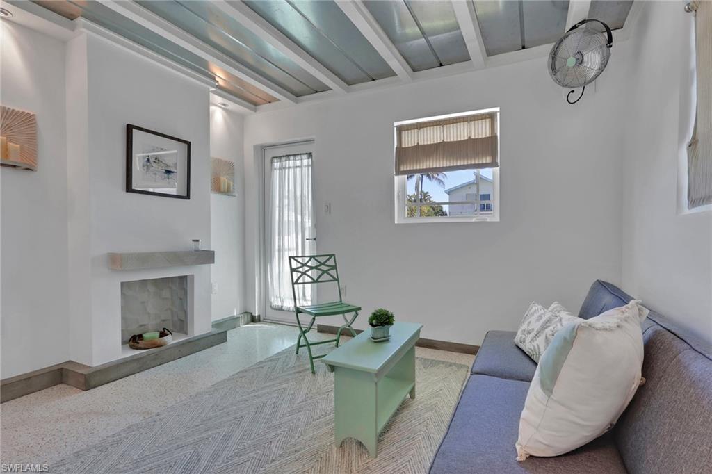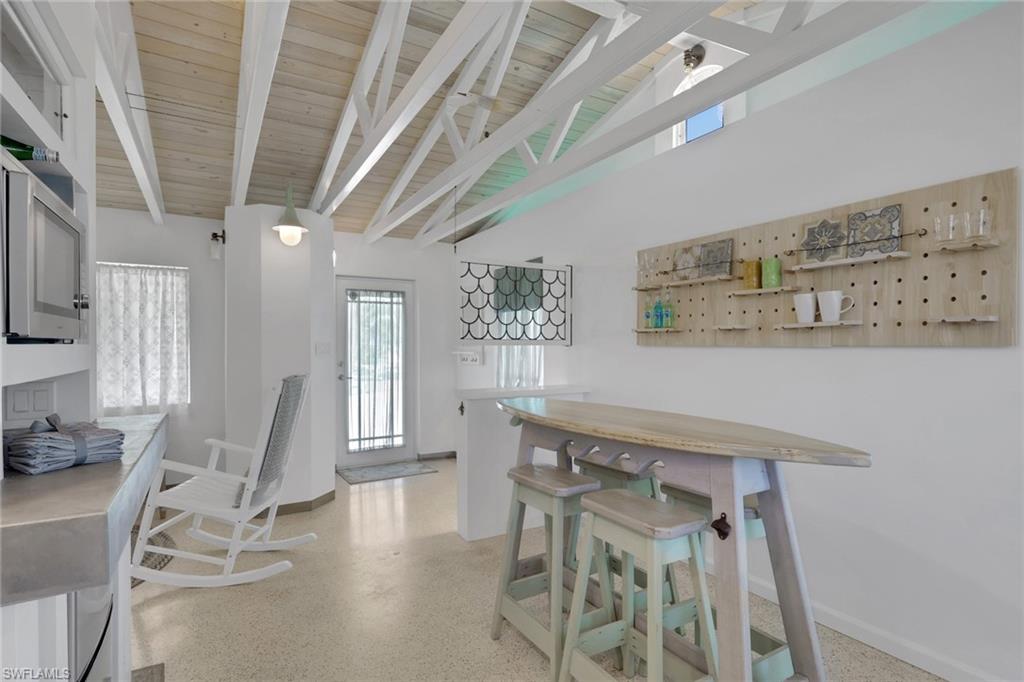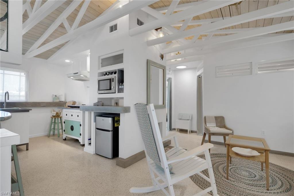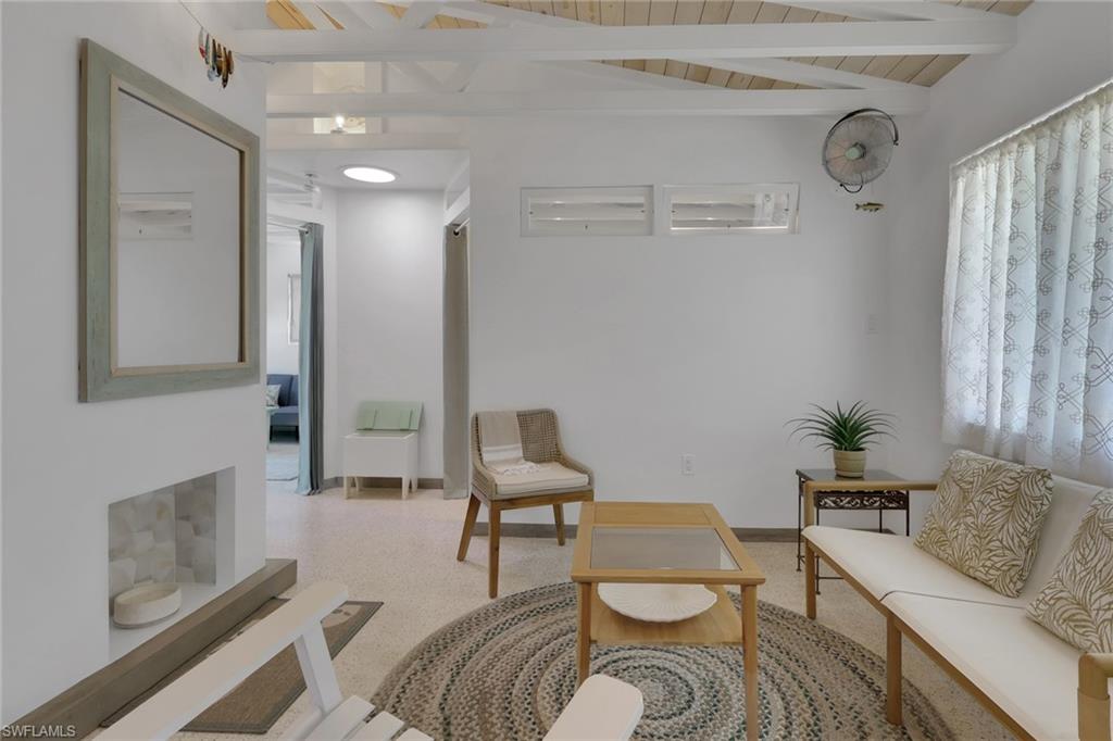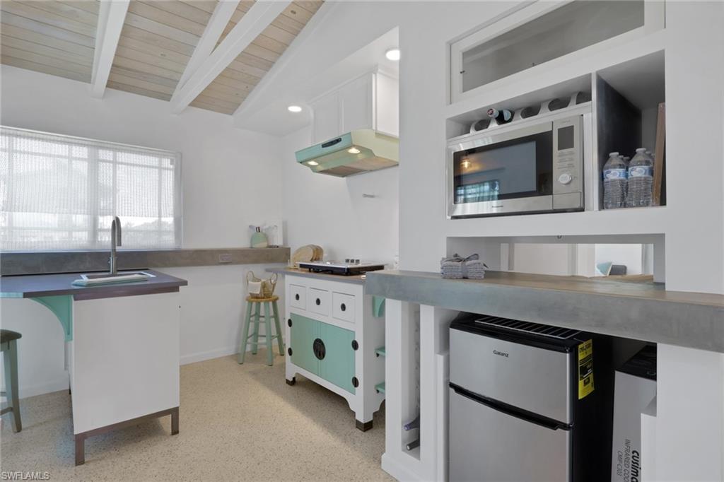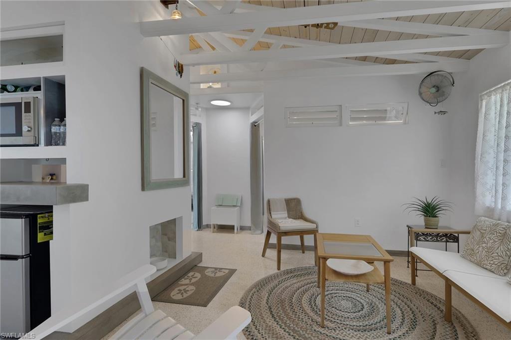 Inside, the coastal fishing cabin ambiance is elevated through exposed wrapped beams, horizontal whitewashed ceiling planks, and layered up lighting designed to emulate vintage gaslight warmth. Level 5 Cambria quartz countertops wrap the kitchen, complemented by custom cubbies with barrister doors for wine and specialty drinkware. Appliances include a three-burner induction cooktop, beverage refrigerator, convection oven with air fry and broil functions, and thoughtfully integrated workstation pass-through. Two fireplaces with concrete hearths are approved for insert conversion, while vaulted rod holders and curated mid-century furnishings enhance the thematic cohesion. The primary suite boasts a 12-foot vaulted ceiling, and the bath showcases dimensional tilework with a glass-wall shower and built-in cabinetry. Wall-mounted pivoting fans add both function and aesthetic detail. With no community rental restrictions and exceptional character rarely found on Naples waterfront, this cottage presents an outstanding opportunity as a personal retreat, guest overflow residence, or high-performing short-term rental investment.