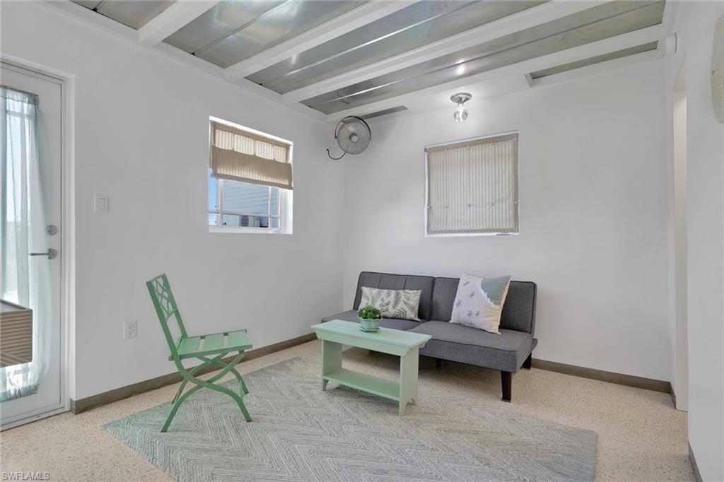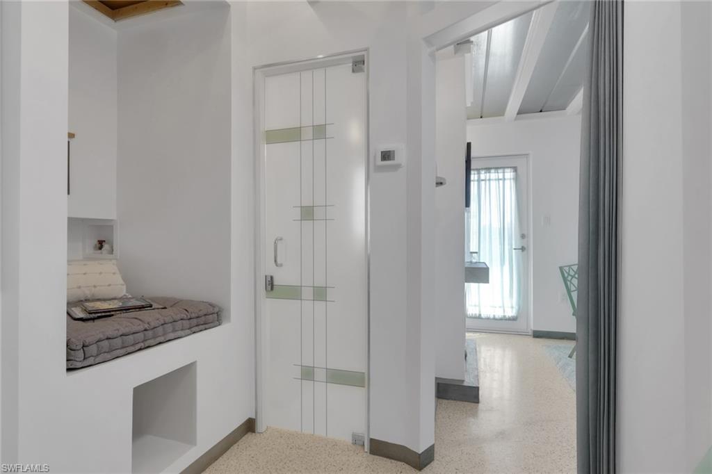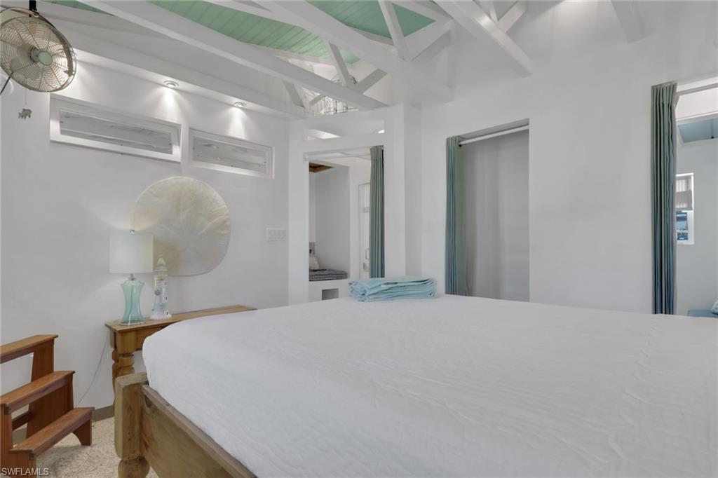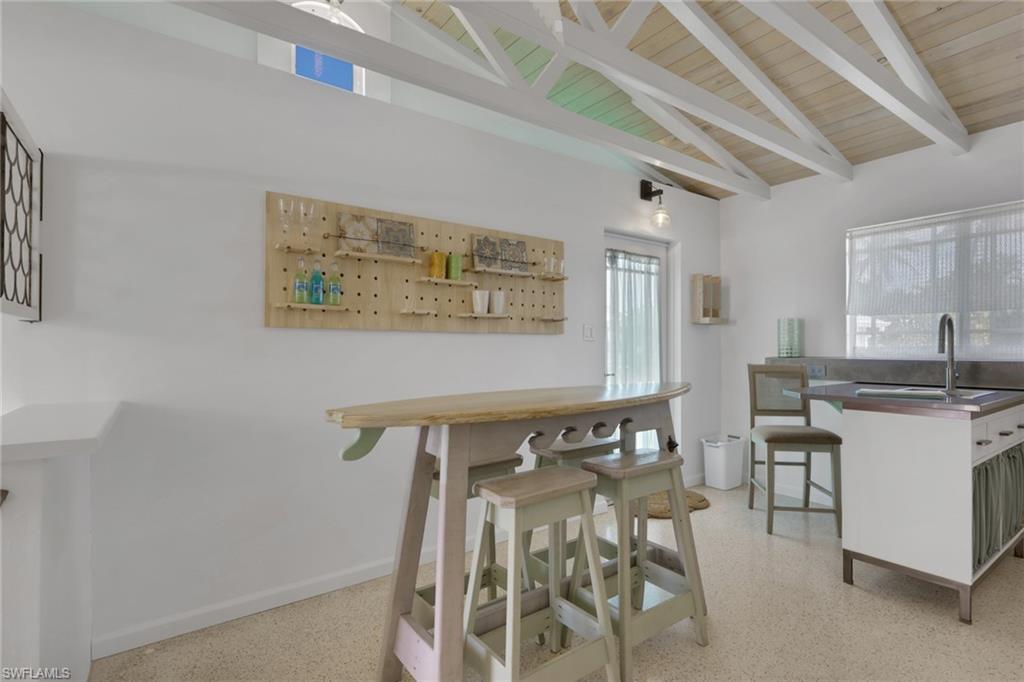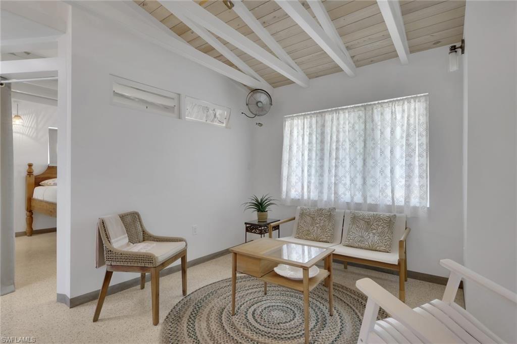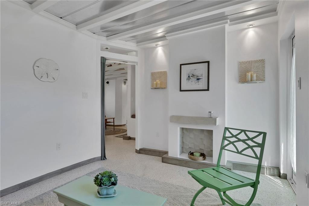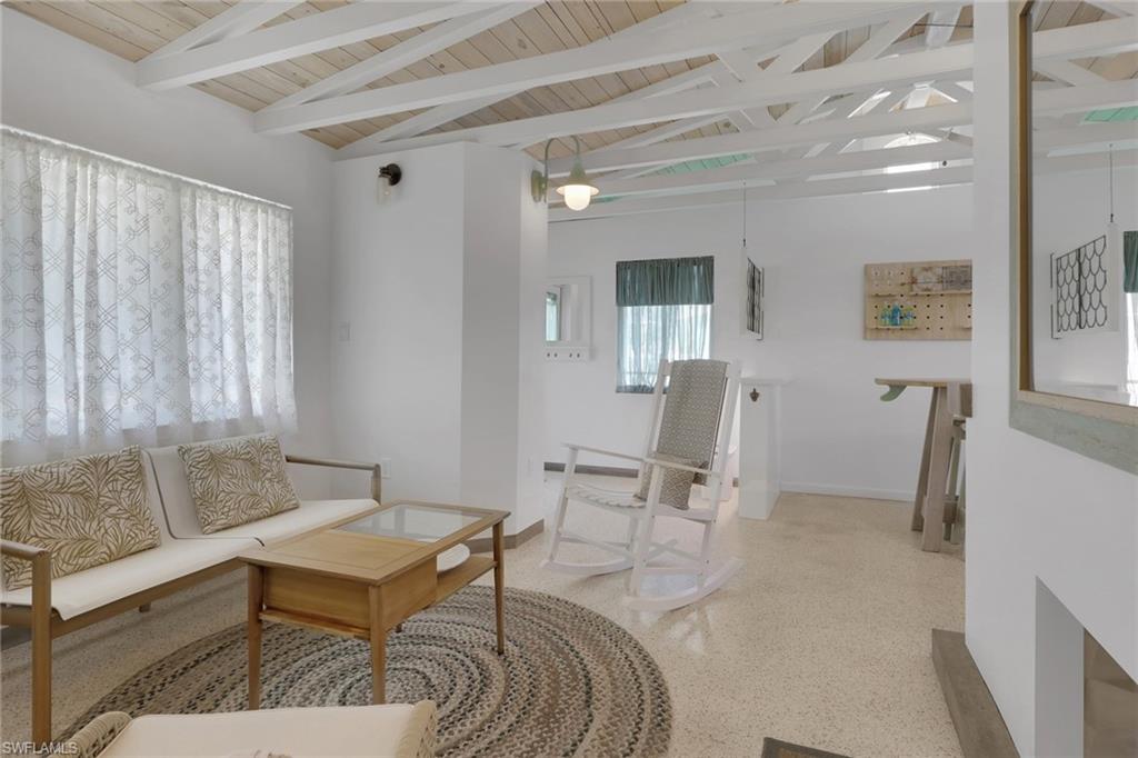 Inside, the coastal fishing cabin ambiance is elevated through exposed wrapped beams, horizontal whitewashed ceiling planks, and layered up lighting designed to emulate vintage gaslight warmth. Level 5 Cambria quartz countertops wrap the kitchen, complemented by custom cubbies with barrister doors for wine and specialty drinkware. Appliances include a three-burner induction cooktop, beverage refrigerator, convection oven with air fry and broil functions, and thoughtfully integrated workstation pass-through. Two fireplaces with concrete hearths are approved for insert conversion, while vaulted rod holders and curated mid-century furnishings enhance the thematic cohesion. The primary suite boasts a 12-foot vaulted ceiling, and the bath showcases dimensional tilework with a glass-wall shower and built-in cabinetry. Wall-mounted pivoting fans add both function and aesthetic detail. With no community rental restrictions and exceptional character rarely found on Naples waterfront, this cottage presents an outstanding opportunity as a personal retreat, guest overflow residence, or high-performing short-term rental investment.