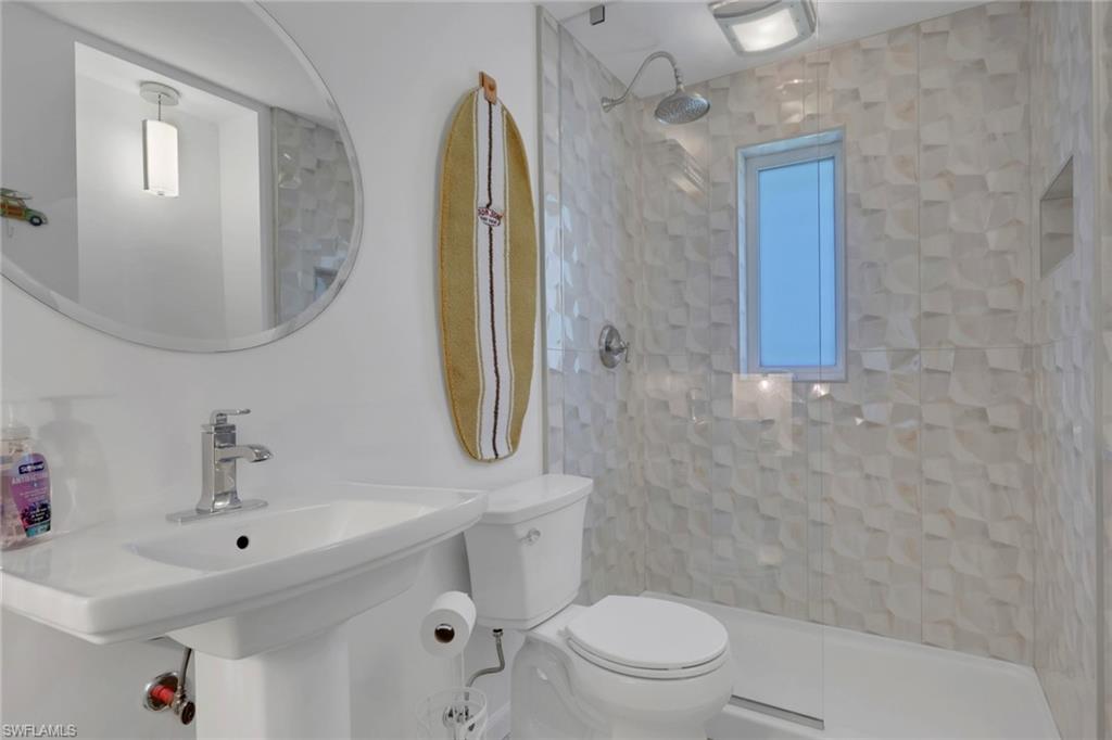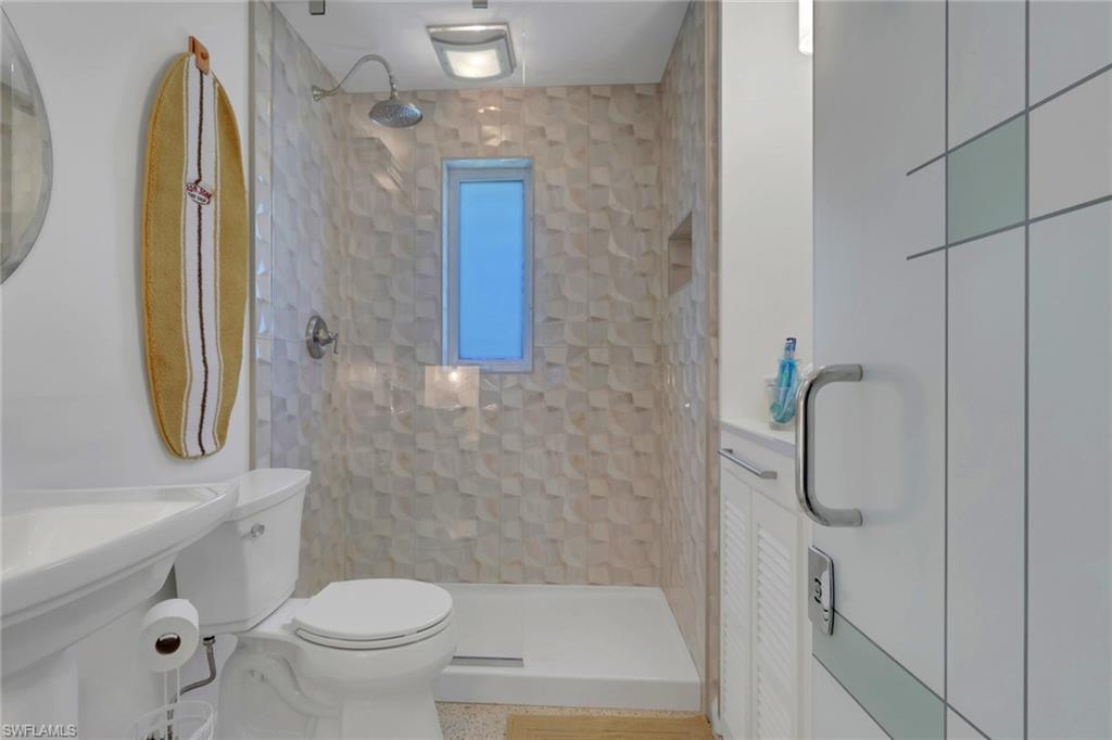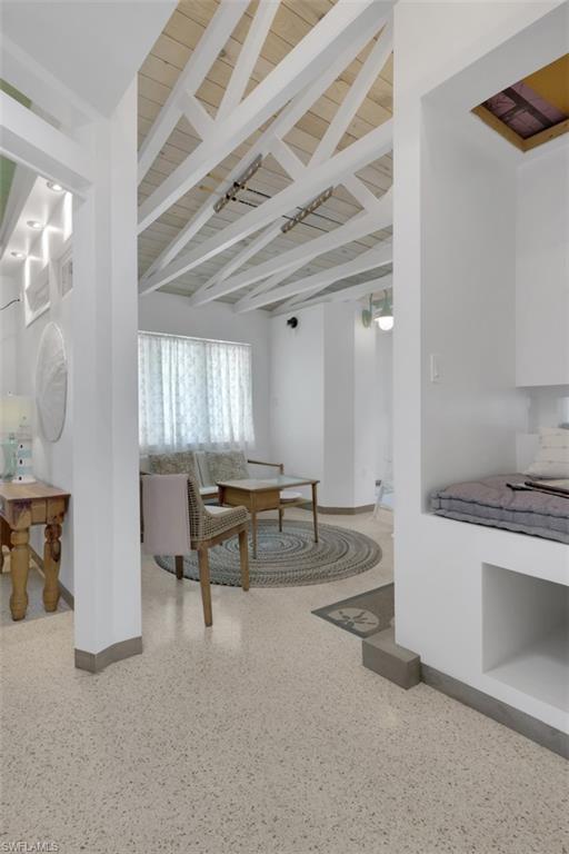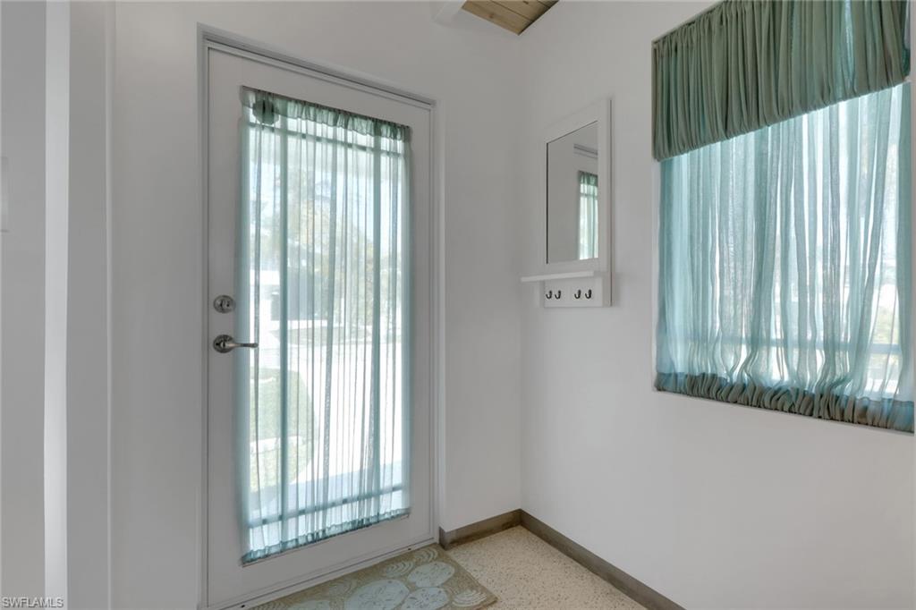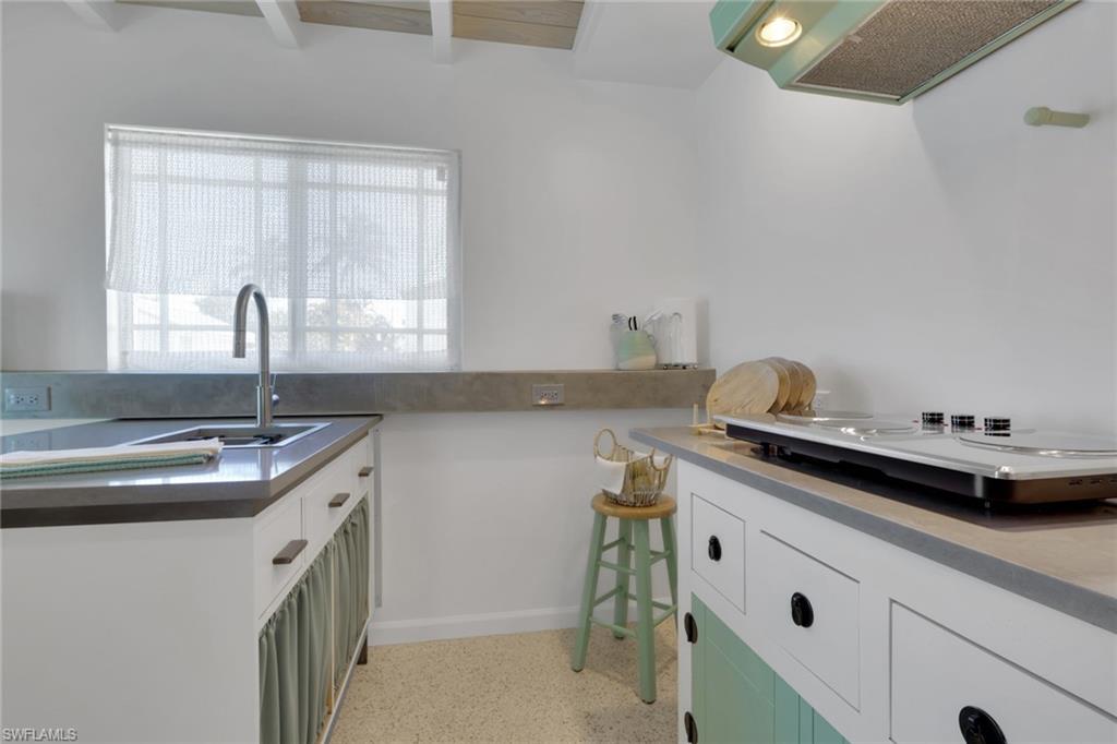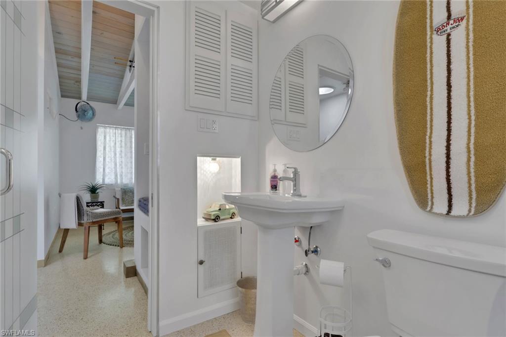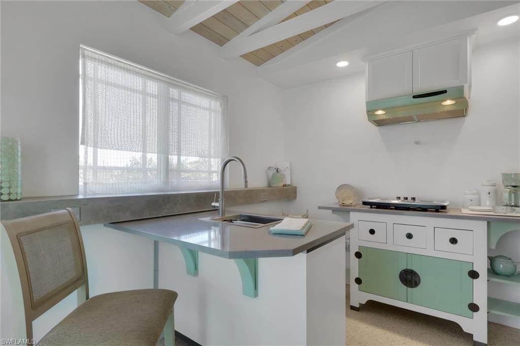 Inside, the coastal fishing cabin ambiance is elevated through exposed wrapped beams, horizontal whitewashed ceiling planks, and layered up lighting designed to emulate vintage gaslight warmth. Level 5 Cambria quartz countertops wrap the kitchen, complemented by custom cubbies with barrister doors for wine and specialty drinkware. Appliances include a three-burner induction cooktop, beverage refrigerator, convection oven with air fry and broil functions, and thoughtfully integrated workstation pass-through. Two fireplaces with concrete hearths are approved for insert conversion, while vaulted rod holders and curated mid-century furnishings enhance the thematic cohesion. The primary suite boasts a 12-foot vaulted ceiling, and the bath showcases dimensional tilework with a glass-wall shower and built-in cabinetry. Wall-mounted pivoting fans add both function and aesthetic detail. With no community rental restrictions and exceptional character rarely found on Naples waterfront, this cottage presents an outstanding opportunity as a personal retreat, guest overflow residence, or high-performing short-term rental investment.