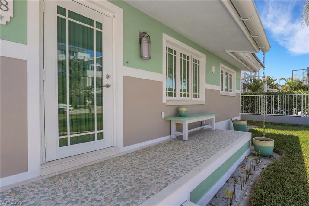 Positioned just one lot from the end of the canal, the Sand Dollar Cottage enjoys breathtaking views toward the Cocohatchee River while offering direct Gulf access within minutes. Rebuilt to reflect the original 1960s Mackle Brothers South Florida coastal philosophy, this residence blends architectural heritage with artful craftsmanship. Raised porches crafted from hand-laid sea glass, fossil stone, and mosaic elements create a striking welcome, complemented by 8-inch half-round architectural gutters and period-correct rain chains. A standing-seam roof of high-gauge metal, and PGT impact resistant windows and doors provide both style and peace of mind.