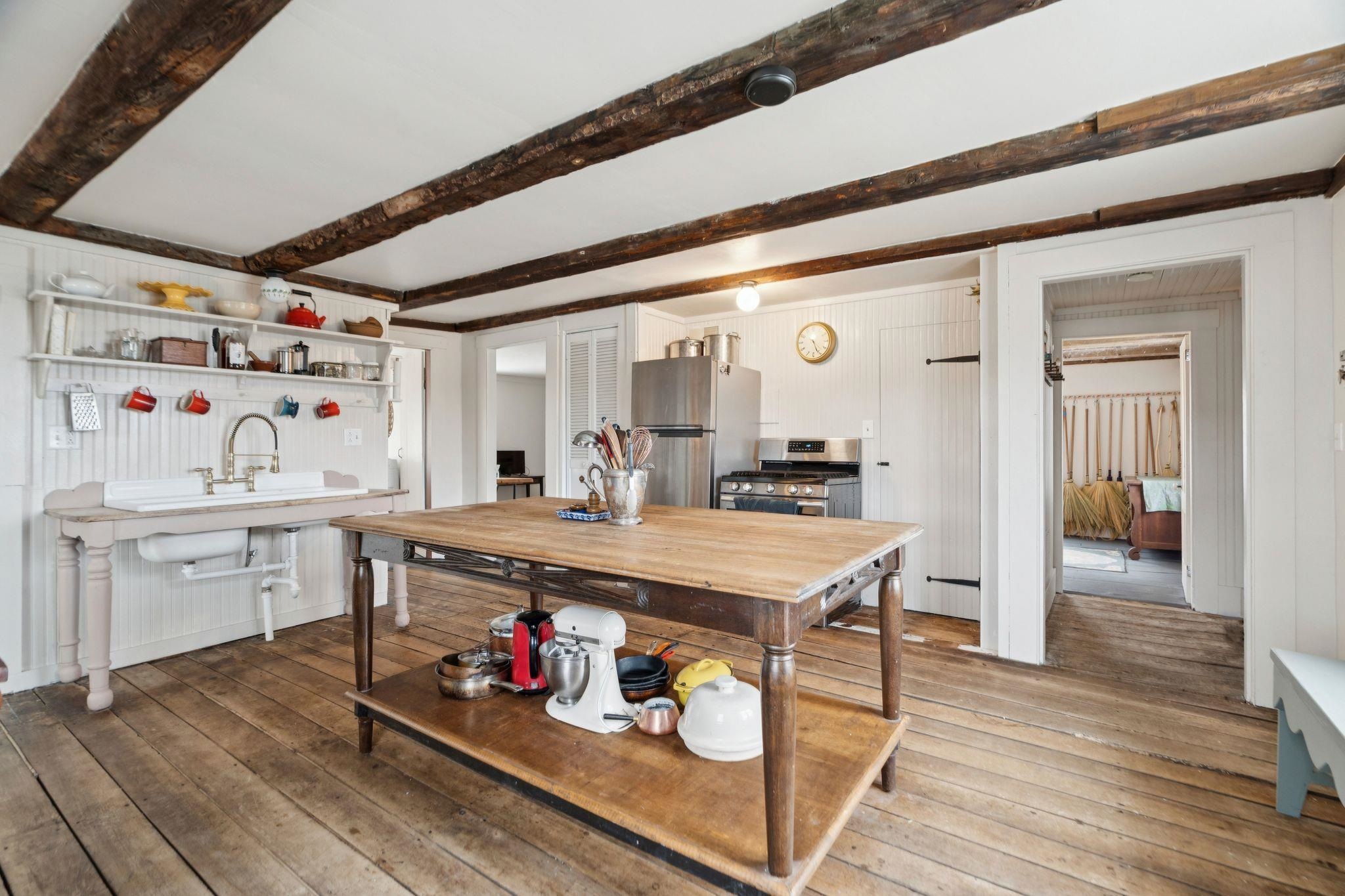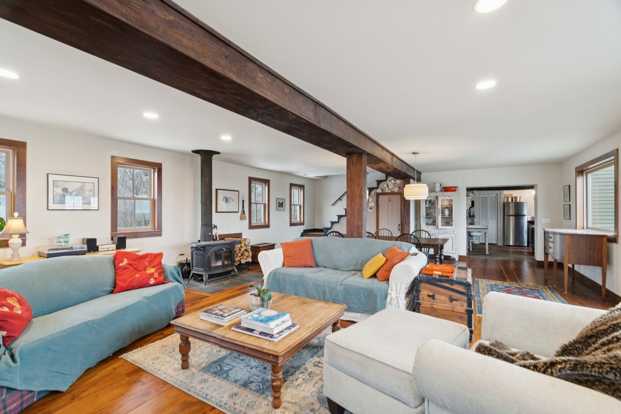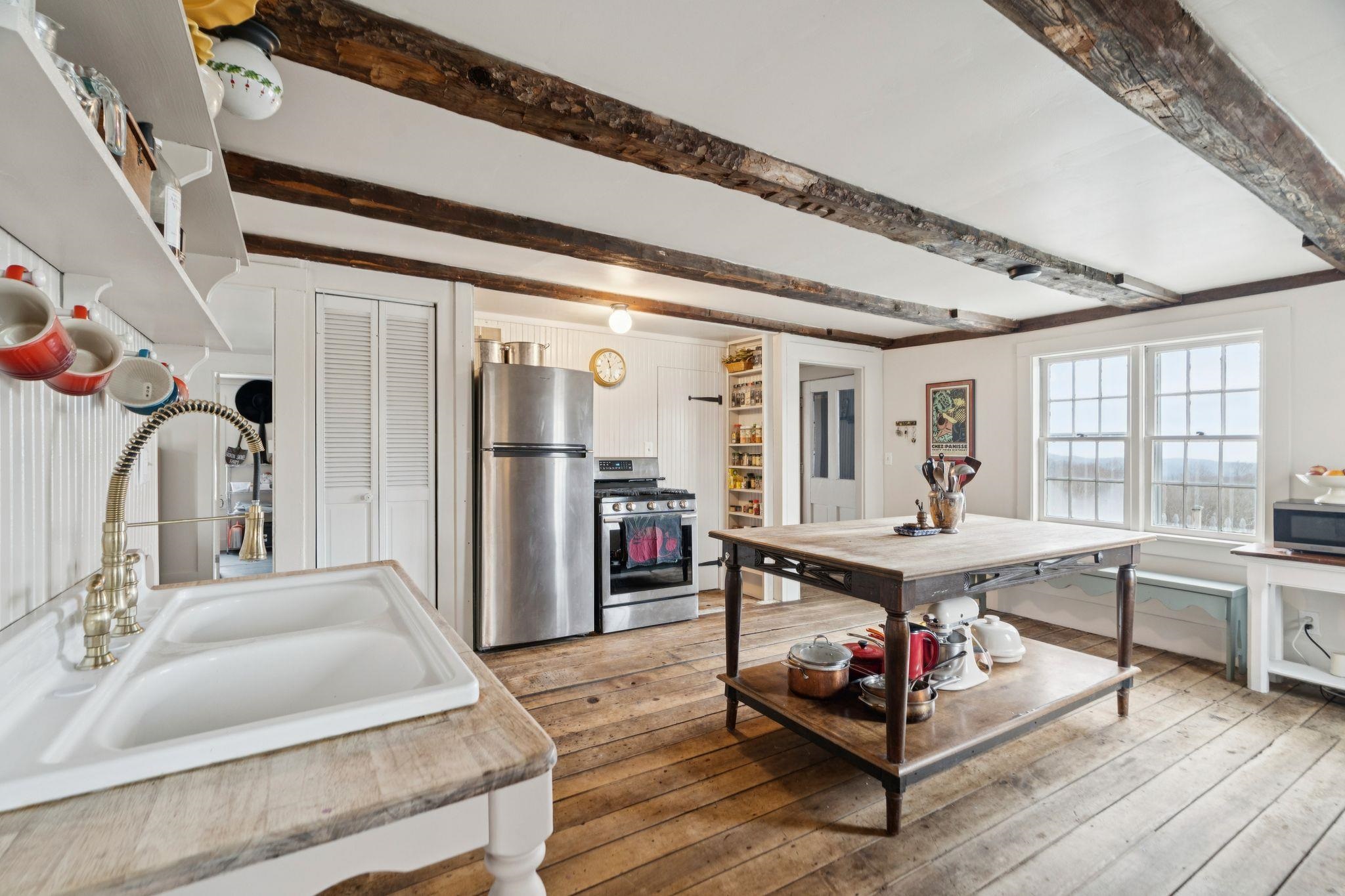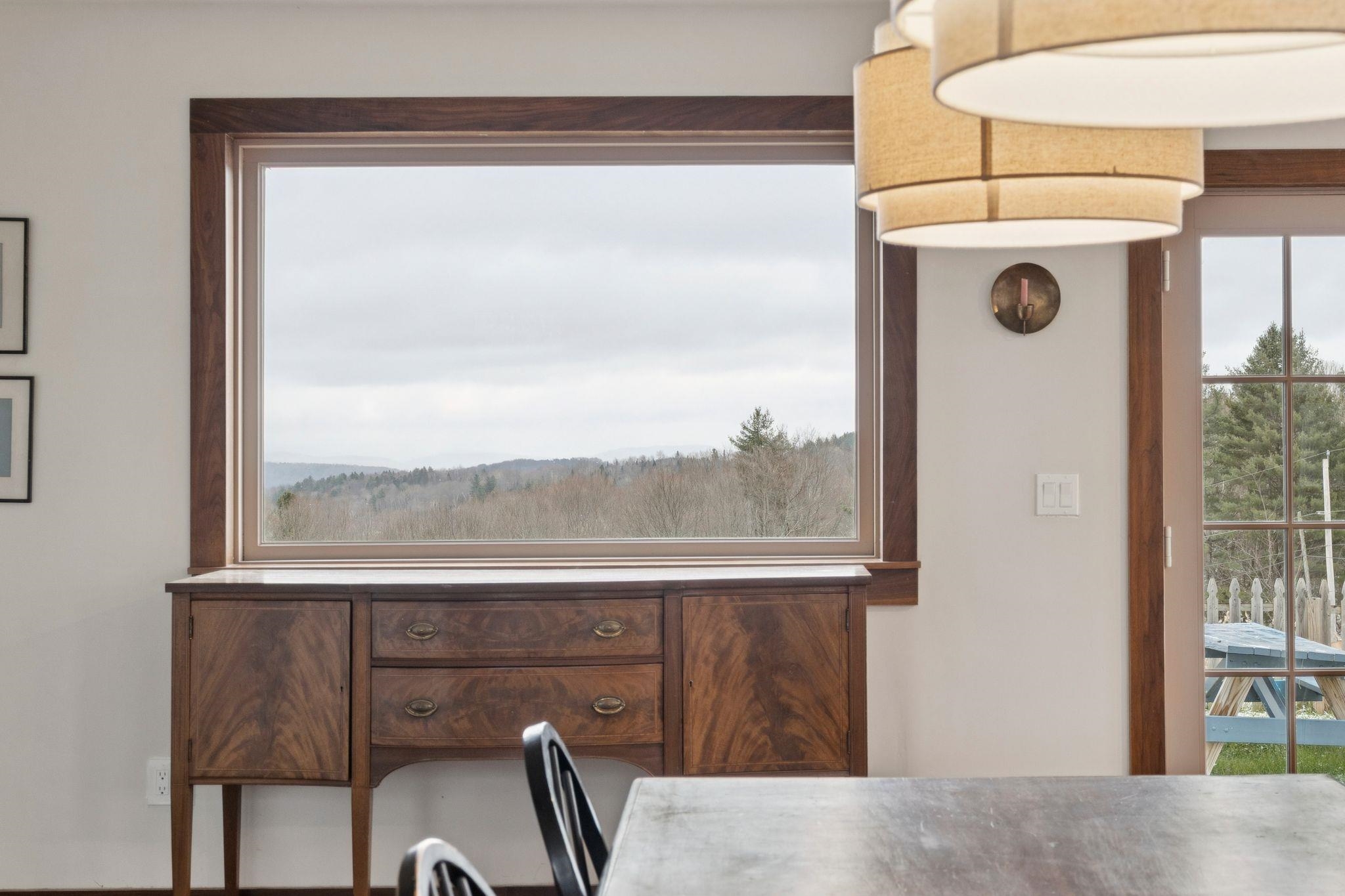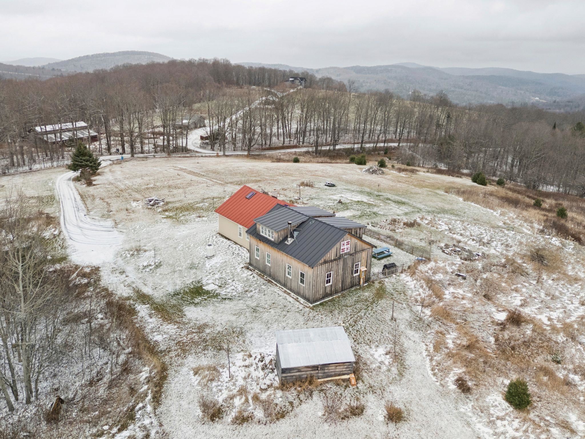 Experience the best of Vermont living on 10+ picturesque acres with sweeping panoramic views in every direction. This one-of-a-kind setting offers beauty, privacy, and a true country lifestyle, complete with breathtaking sunrises over the White Mountains of New Hampshire and stunning sunsets fading behind the Green Mountains. The property is a homesteader's dream, featuring established orchards with a variety of apples, both young and heritage, abundant wild blueberries and strawberries, and an impressive private road lined with young American Chestnut trees. Tucked into this peaceful landscape sits a charming post-and-beam Cape, rich in character, which was thoughtfully expanded with a new addition in 2022. Natural woodwork, exposed beams, and farmhouse-style details create a warm and timeless feel throughout. Many original floors remain, adding to the authenticity and charm, while tasteful modern updates blend seamlessly with the home's rustic features. The east-facing living and dining room capture morning light and long-range mountain views—an ideal space for gathering and appreciating the scenery year-round. The open kitchen includes a farmhouse sink, center island, and stainless steel appliances, balancing practicality with style. With three bedrooms and two baths, there’s space to spread out, host guests, or work from home with inspiring views as your backdrop. This property brings together land, character, and self-sustaining features in a spectacular location.