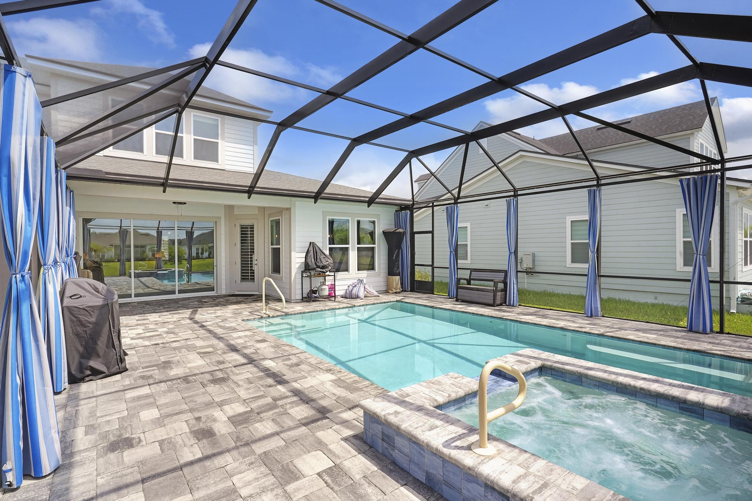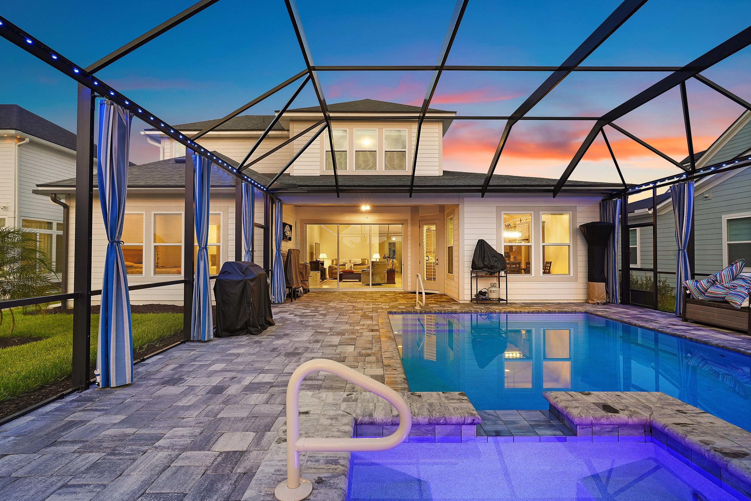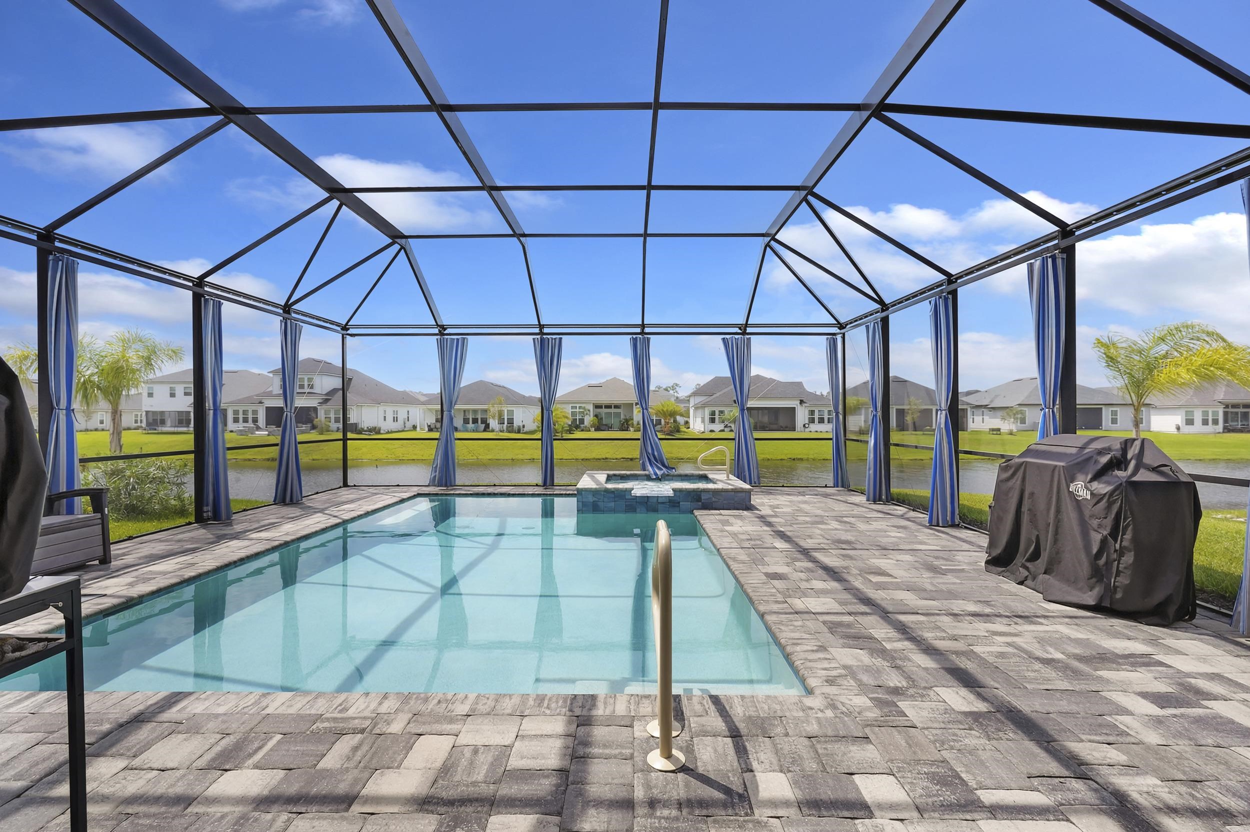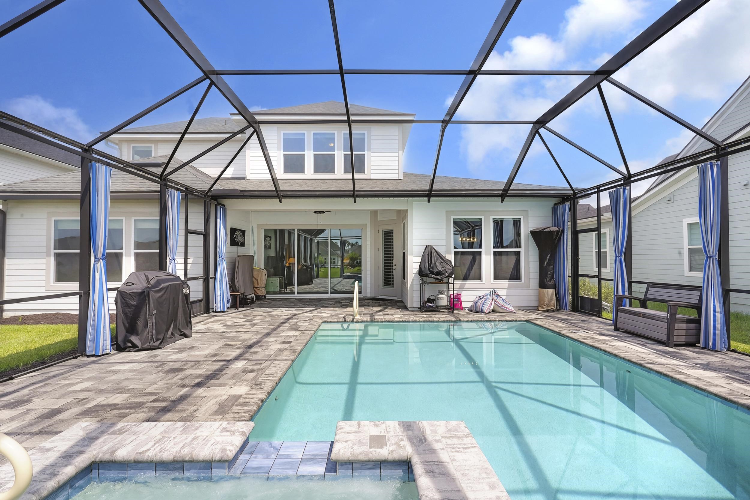 Built in 2023 by MasterCraft Builder Group, this beautifully upgraded 5-bedroom, 4-bath home offers 3, 239 sq. ft. of thoughtfully designed living space in the highly sought-after SilverLeaf community. Unlike many competing new construction homes, this property is fully completed and move-in ready, allowing you to skip the wait, avoid costly upgrades, and start enjoying your home immediately. Step inside to an open-concept floor plan featuring soaring ceilings, expansive living spaces, and abundant natural light that creates a bright, airy atmosphere throughout. The gourmet kitchen anchors the home with quartz countertops, custom cabinetry, an oversized island, walk-in pantry, and premium stainless-steel appliances—perfect for both entertaining and everyday living. The great room and dining area flow seamlessly, offering an ideal layout for gatherings. The private owner’s suite is a true retreat, showcasing a spa-inspired bathroom with dual vanities, a freestanding soaking tub, and an oversized walk-in shower with both a rain shower head and additional wall-mounted shower head. A spacious walk-in closet conveniently connects to the laundry room. A split-bedroom design ensures privacy for family and guests, while the upstairs bonus suite with a full bath provides flexible space for a guest retreat, home office, or media room. Where this home truly shines is outdoors. Step into your own private backyard oasis featuring a heated pool and spa-like sauna, designed for year-round relaxation and luxury living. This resort-style outdoor space creates the ultimate setting for entertaining, unwinding, and enjoying Florida living at its finest. Whether you're hosting sunset gatherings, enjoying a quiet morning by the pool, or creating a wellness-inspired retreat, this eutopic outdoor living experience elevates everyday life. Located in SilverLeaf, residents enjoy resort-style amenities including multiple pools, clubhouse, fitness center, playgrounds, dog parks, and scenic walking trails, all within close proximity to top-rated St. Johns County schools. Even better, this property requires NO CDD fees, providing exceptional value and lower long-term costs in one of the area’s premier communities.