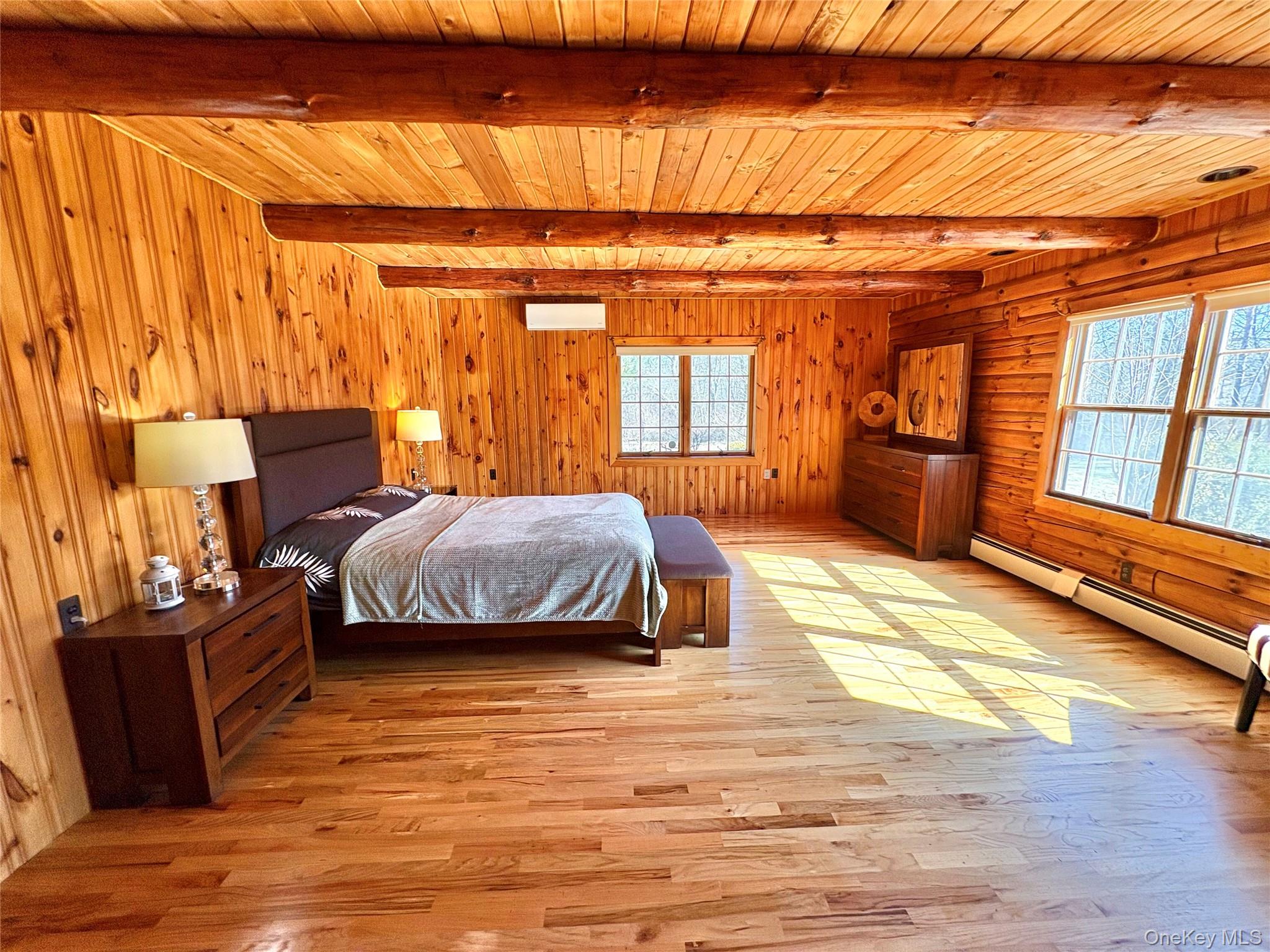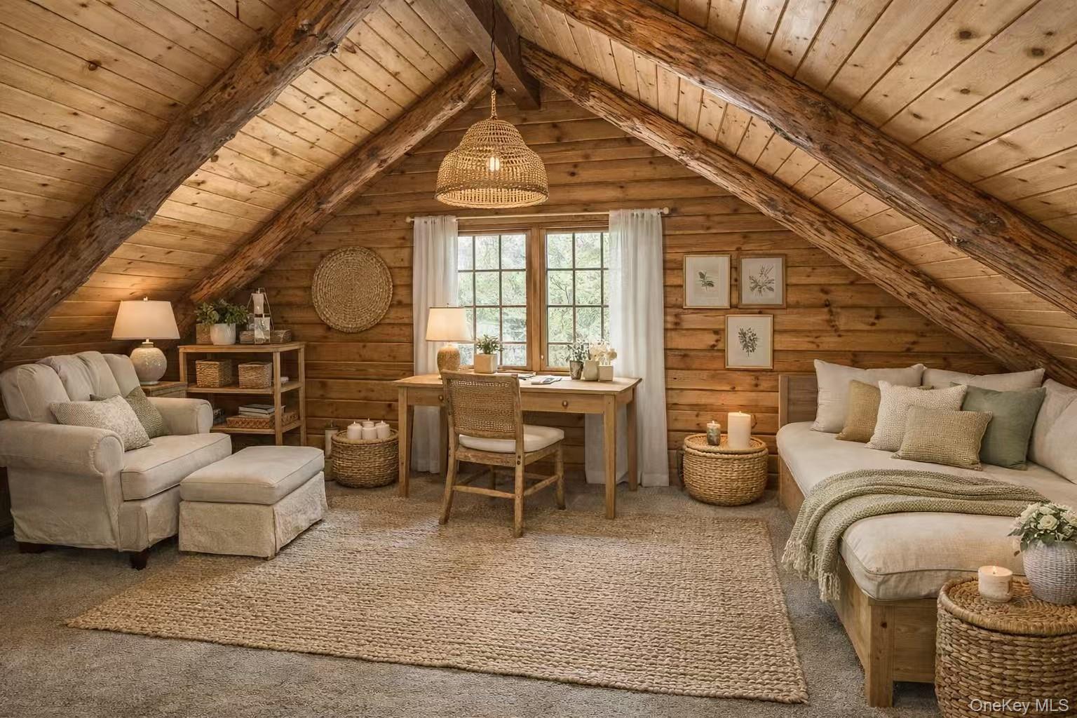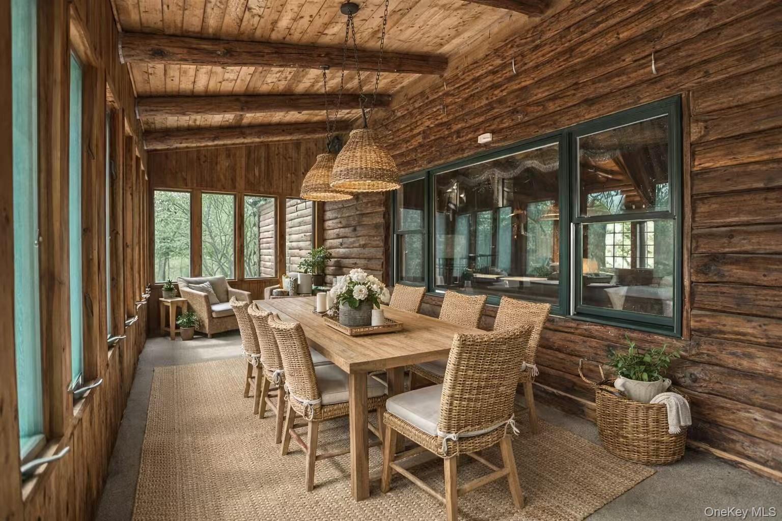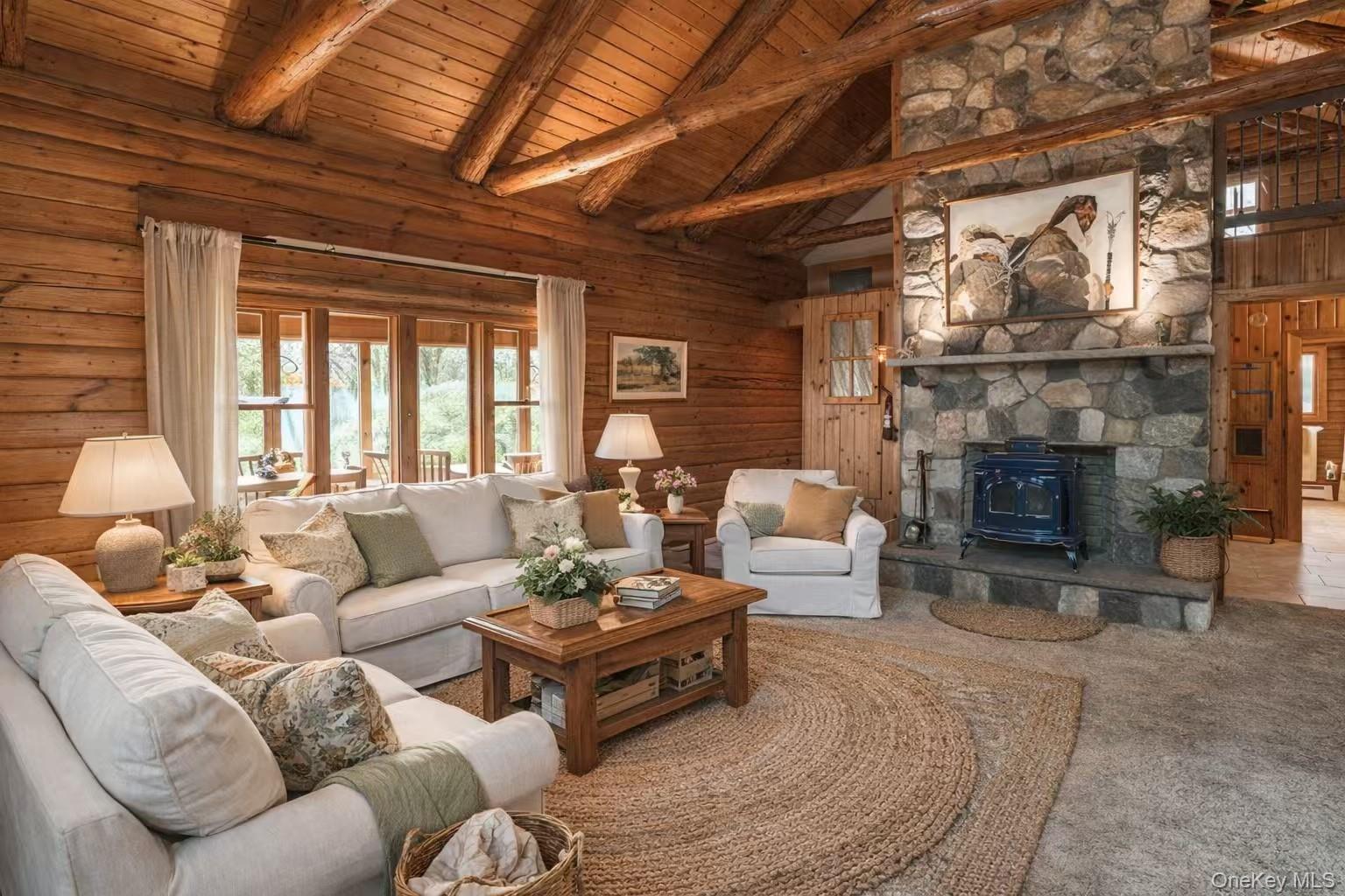 Seeking privacy and tranquility without complete seclusion? This charming log home sits on 15 acres surrounded by natural beauty (partially wetlands) and peaceful views of a neighboring lake. The expansive deck is ideal for entertaining and summer barbecues, while the three-season porch provides a cozy retreat in any weather. Inside, the great room impresses with vaulted ceilings, exposed beams, and a striking stone fireplace, creating a warm and inviting gathering space. It flows seamlessly into a modern eat-in kitchen featuring stainless steel appliances and custom cabinetry with elegant leaded-glass details. Three bedrooms on the first floor, along with a versatile loft above, offer flexible living options for guests, work, or recreation. Conveniently located just minutes from shopping, approximately three miles from Orange Regional Hospital, and about 45 miles (roughly a 1–1. 5 hour drive) from New York City, this special property offers a wonderful balance of comfort, charm, and peaceful country living. Note: The last five images are virtually staged. The property will be delivered either semi-furnished or vacant and broom-cleaned.