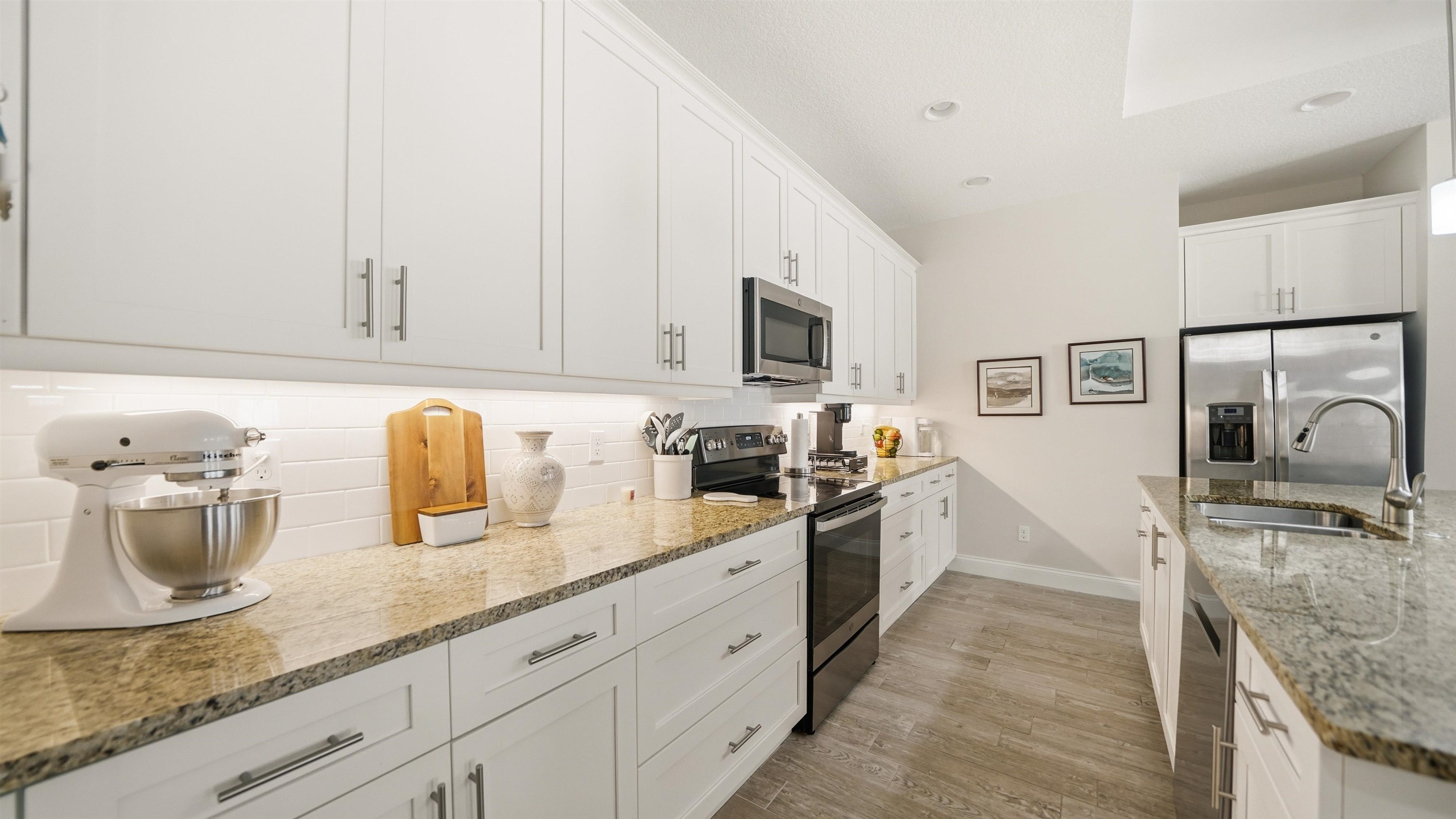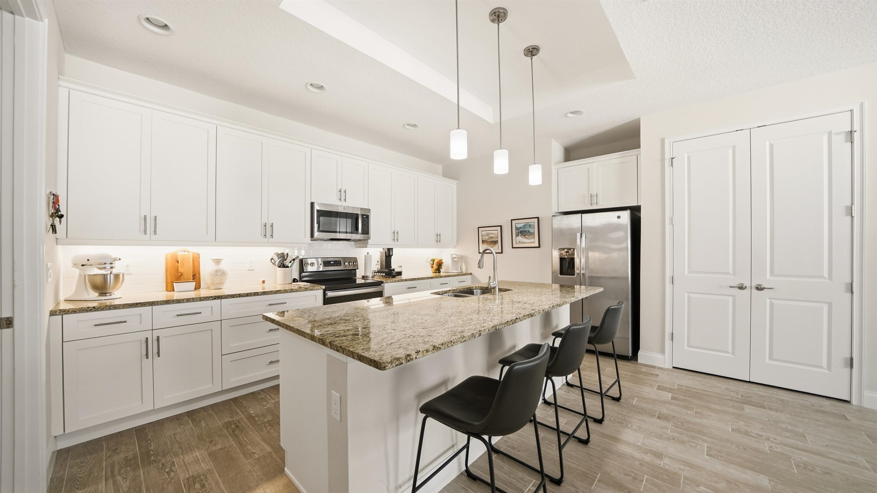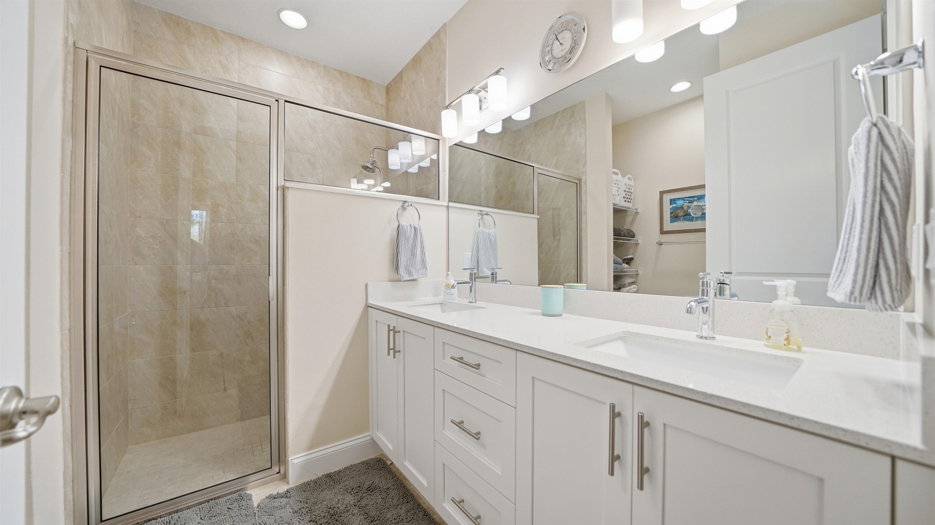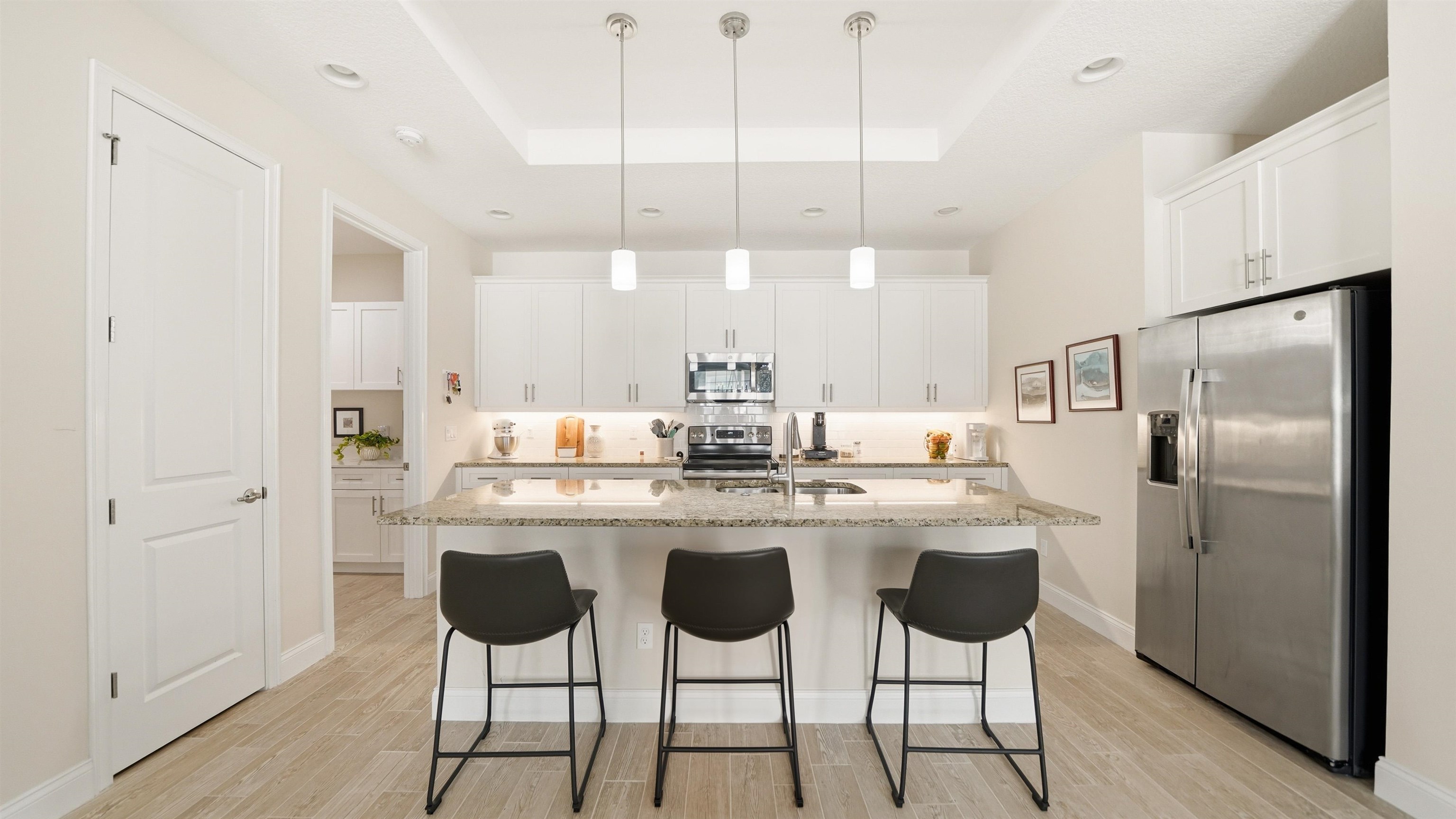 Welcome to 74 Wrendale Loop in the sought-after Huntington Villas within Hunter’s Ridge—an inviting 55+ community designed for comfortable, low-maintenance living and an active lifestyle. This beautifully maintained home offers approximately 1, 600 square feet of thoughtfully designed living space and has been lightly lived in as a part-time residence, making it feel exceptionally fresh and well cared for. The unique layout features two spacious master suites which are perfect for hosting guests or providing privacy for visiting family, along with an additional half bath for convenience. Everything about this home is high-end! Inside, you’ll find stylish and durable tile plank flooring throughout the entire home, combining modern aesthetics with easy maintenance and durability. The gorgeous kitchen is a standout, featuring elegant white shaker cabinetry, granite countertops, and a large island, with plenty of workspace for cooking and entertaining. Both bathrooms are upgraded with sleek quartz countertops and glass shower doors. Functionality meets convenience in the large utility room, which includes a washer and dryer along with matching cabinets that provide extra storage and organization. Step outside to the private lanai, where you can relax and enjoy peaceful preserve views—an ideal spot for morning coffee or unwinding at the end of the day. Living in Huntington Villas means more than just owning a beautiful home—it’s a lifestyle. Residents can enjoy a vibrant, social atmosphere with a variety of activities and events designed to keep you engaged, active, and connected with neighbors if you choose. The community also offers fantastic amenities, including two pools (Huntington Villas' own 55+ pool and Huntington Ridge's community pool), clubhouse, and fitness center. The HOA provides exceptional value and convenience, covering internet, cable, landscaping, pest control, community amenities, exterior power washing, and house and roof maintenance—allowing you to spend less time on upkeep and more time enjoying everything this wonderful community has to offer. If you’re looking for a move-in ready home in a welcoming 55+ community with beautiful surroundings and low-maintenance living, 74 Wrendale Loop is the perfect place to call home. All information pertaining to the property is deemed reliable, but not guaranteed. Information to be verified by the Buyer. Be advised that cameras may exist recording audio and video inside/outside the property, such as ring doorbells. Photos are digitally enhanced and could be altered, please verify.
