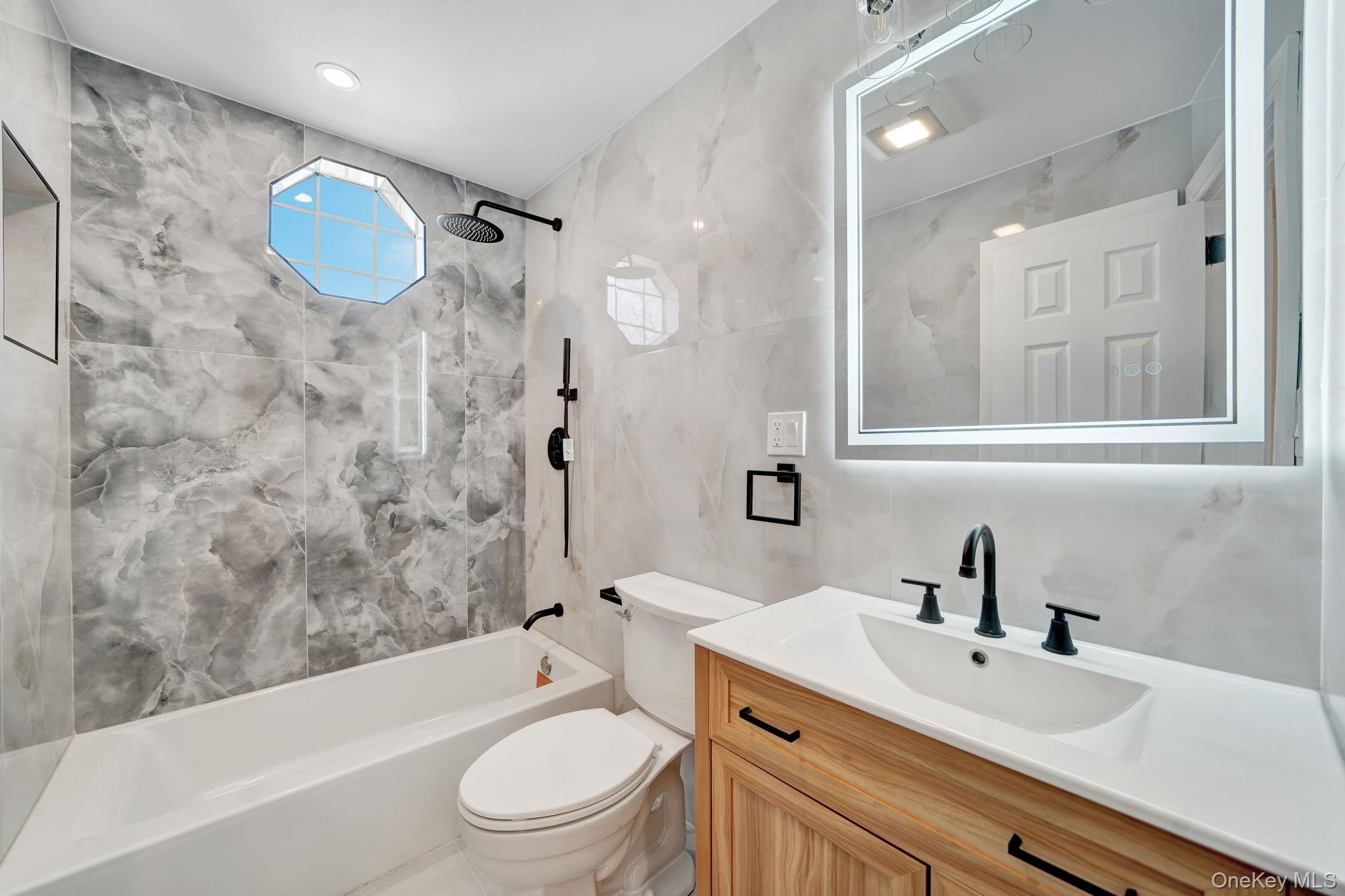 Welcome to 40 Durhamoc Ln! Beautifully renovated 5-bedroom, 3-bath split-level located in the desirable Sunset City section of North Babylon. The home features refinished hardwood floors throughout and porcelain tile on the ground level. The new kitchen offers heated floors, quartzite countertops, new cabinetry, and stainless-steel appliances. The upper level includes three spacious bedrooms and a renovated full bathroom. The first floor features a private in-law bedroom with an en-suite bath, ideal for extended family or guests. The lower level offers a large family/recreation room, a fifth bedroom, wet bar, and laundry area—possible mother/daughter with proper permits. Enjoy outdoor living with a newly paved front walkway, 12×34 patio, and oversized fully fenced yard. Recent updates include a new blacktop double driveway, new entrance door, fully renovated interior with energy-efficient recessed lighting, new kitchen, new Navien heating system, and new baseboards—too many upgrades to list. Conveniently located near shopping on Deer Park Ave, Babylon Village, local beaches, and the LIRR (approx. 3. 5 miles to Deer Park Station and 3. 3 miles to Babylon Station).