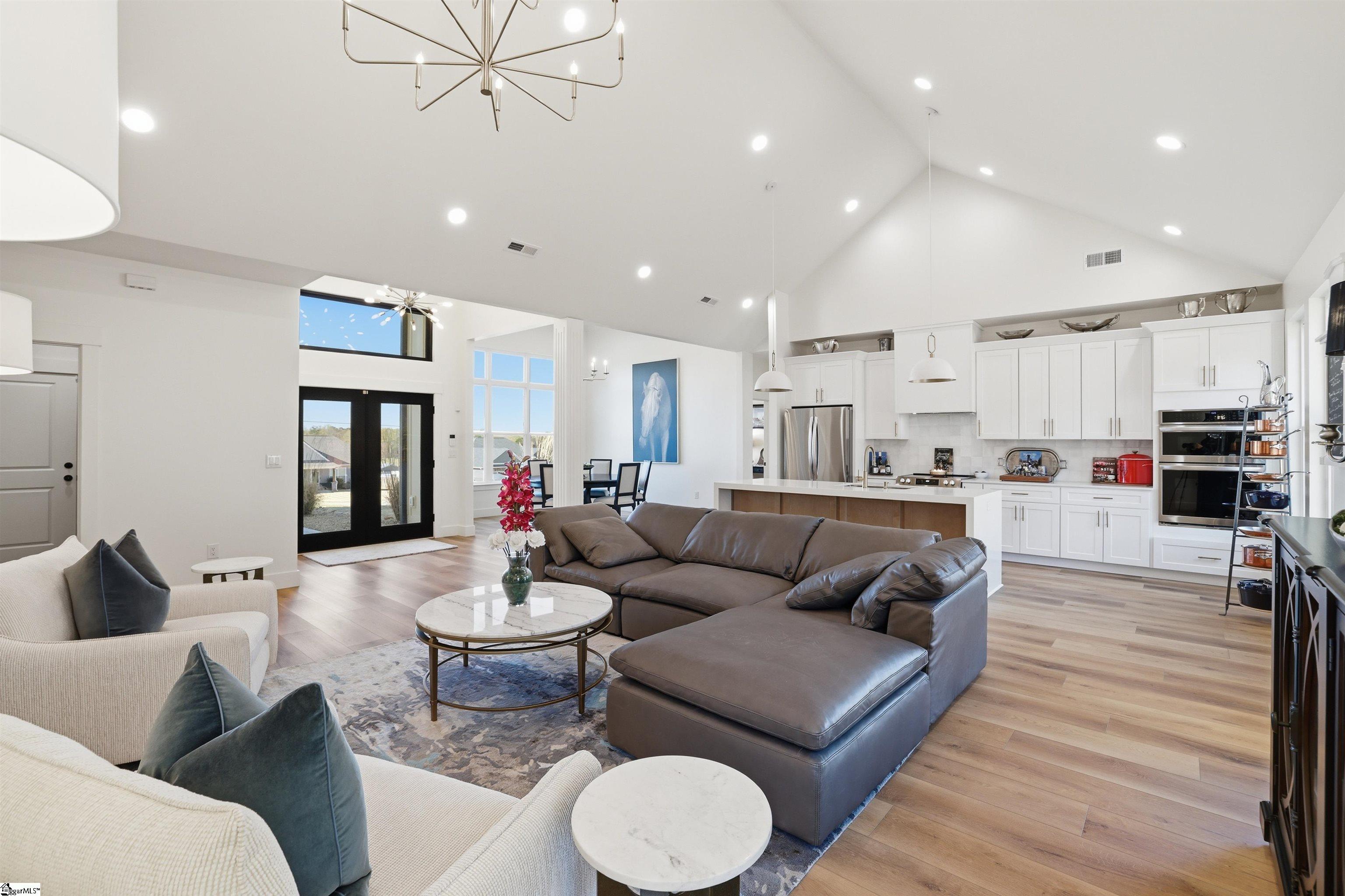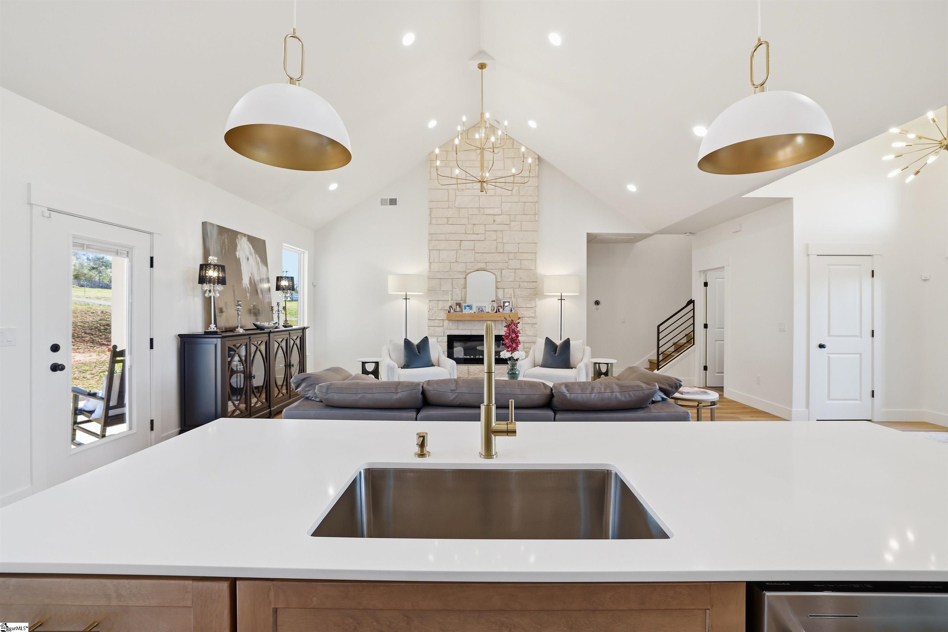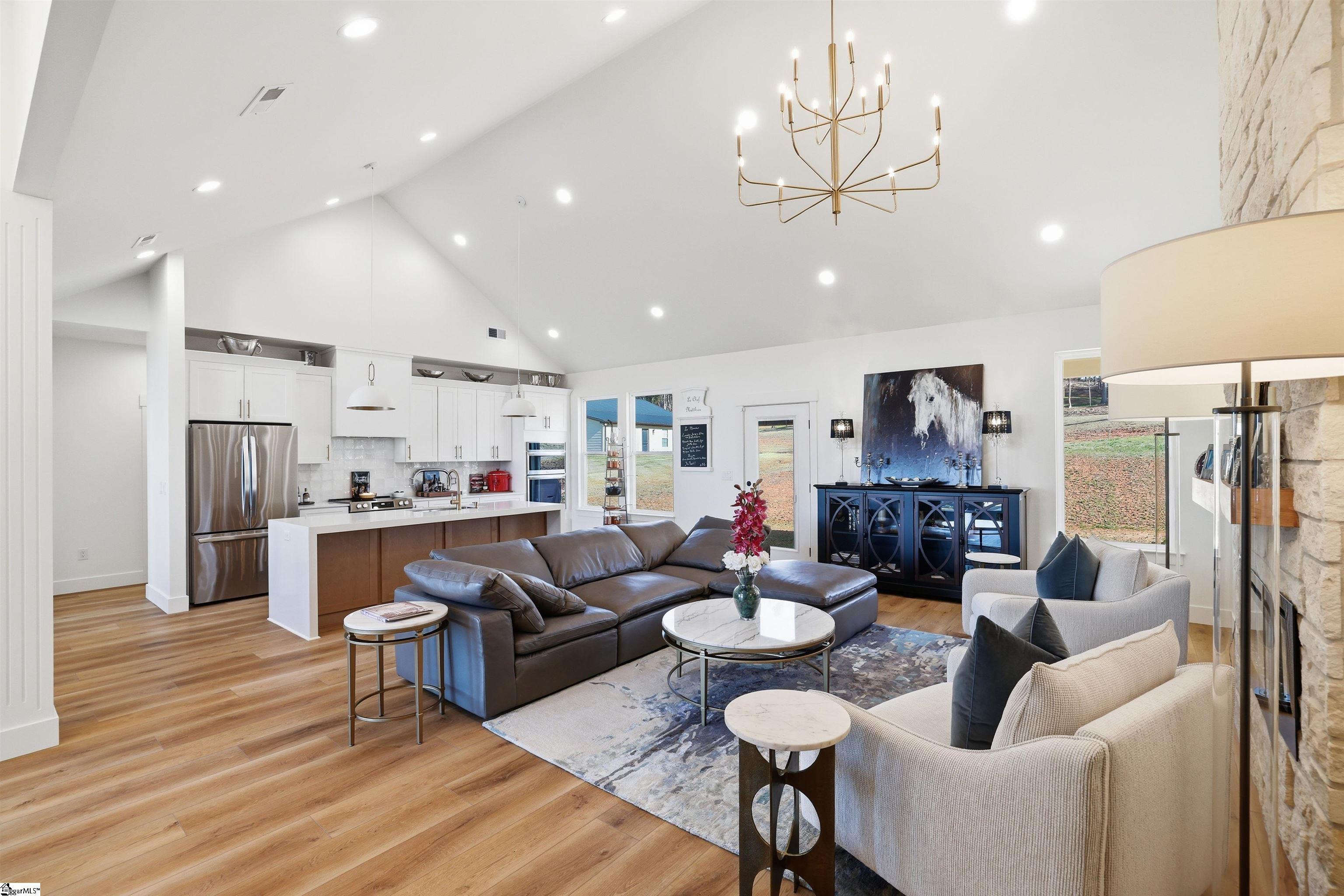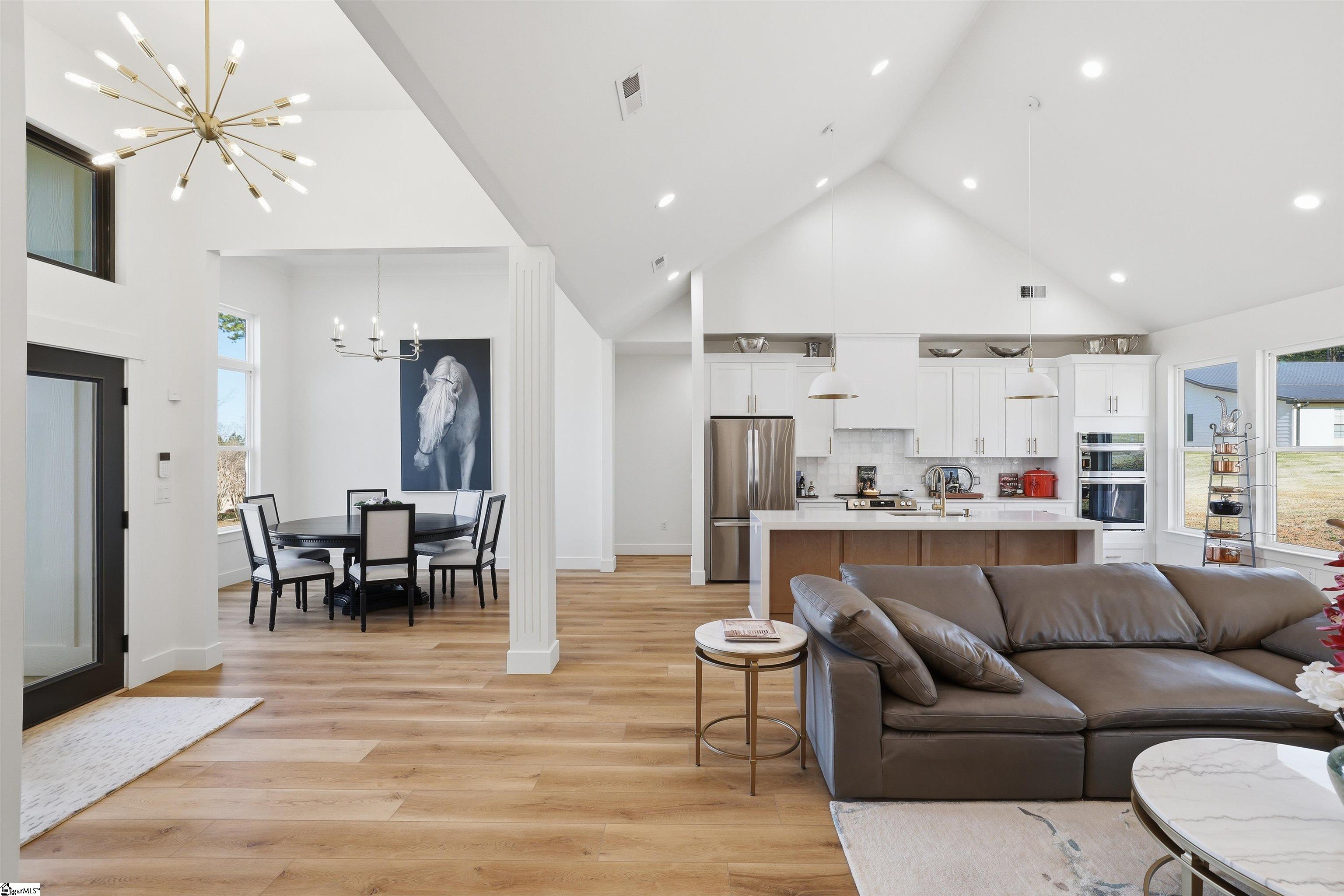 Like-new architectural contemporary residence completed November 2024 and enhanced with curated post-construction upgrades, 4 bedrooms, 2 baths, 2192 square feet on 0. 57 acres. The open-concept main level features cathedral ceilings rising approximately 15'6" in the living and kitchen areas and a dramatic floor-to-ceiling architectural fireplace serving as the visual centerpiece of the living room. The gourmet kitchen includes a quartz waterfall-edge island designed for entertaining that seats 4, tall architecturally scaled cabinetry, luminous contemporary backsplash, professional slide-in range, refined LG double-oven configuration, and high-end KitchenAid dishwasher with stainless-steel interior and advanced drying technology. Kohler Burnished Moderna Gold fixtures complete the refined aesthetic. The primary suite includes a sitting area and spa-inspired bath with black marble-style tile, white veining, and burnished gold Schluter trim. The guest bath features serene porcelain tile extending from tub to ceiling with silver Schluter trim and a modern glass splash panel above the tub. Two spacious main-level bedrooms accommodate king-size beds. A nearly 400 sq ft flex suite above the garage offers versatility as a bedroom, media room, or additional living space with independent mini-split climate control. Additional highlights include epoxy-finished oversized garage, transferable lifetime termite bond, covered rear porch, private driveway turnaround, security system, and smart thermostat.