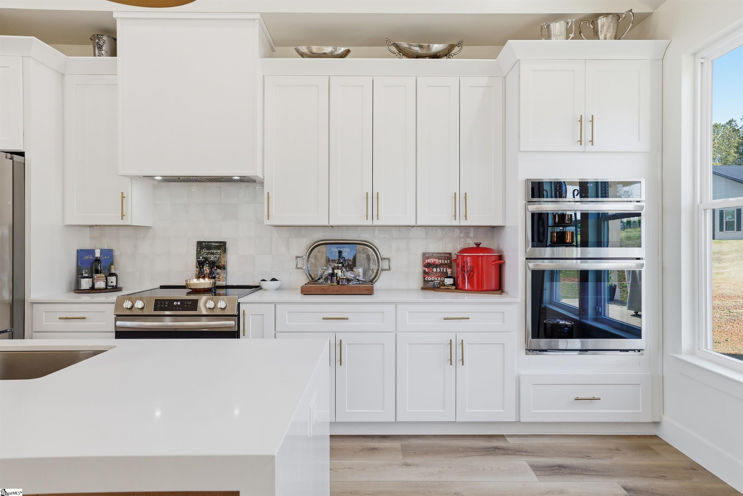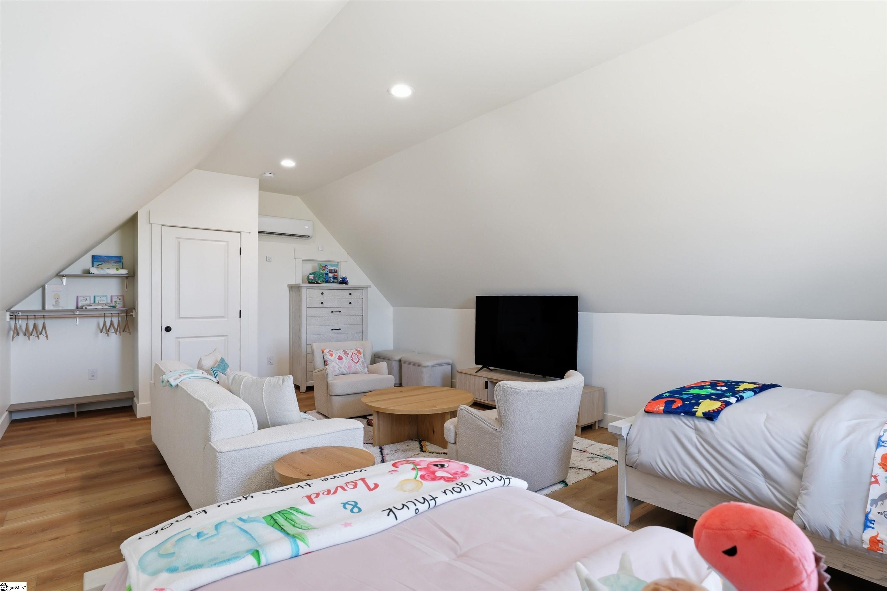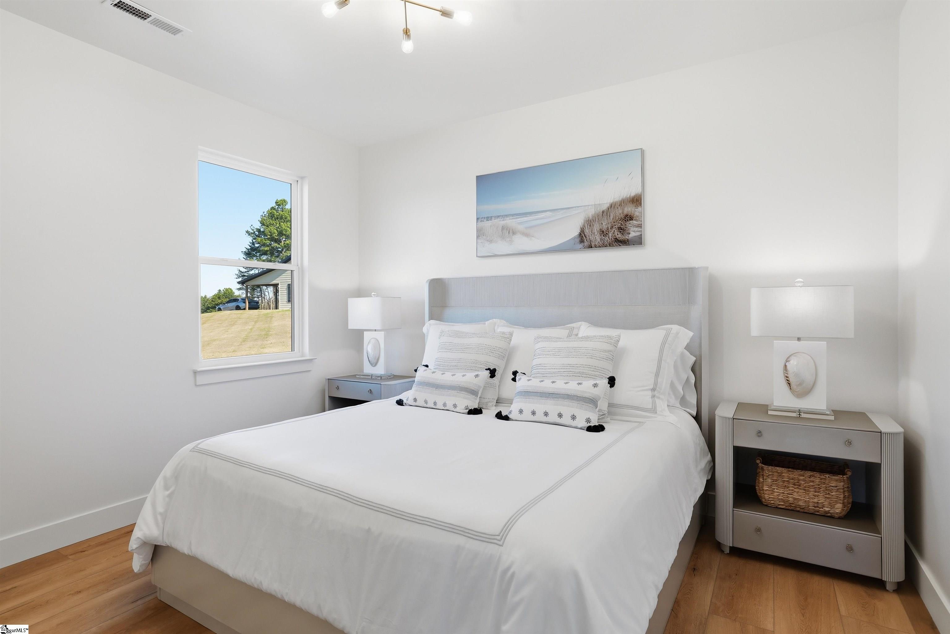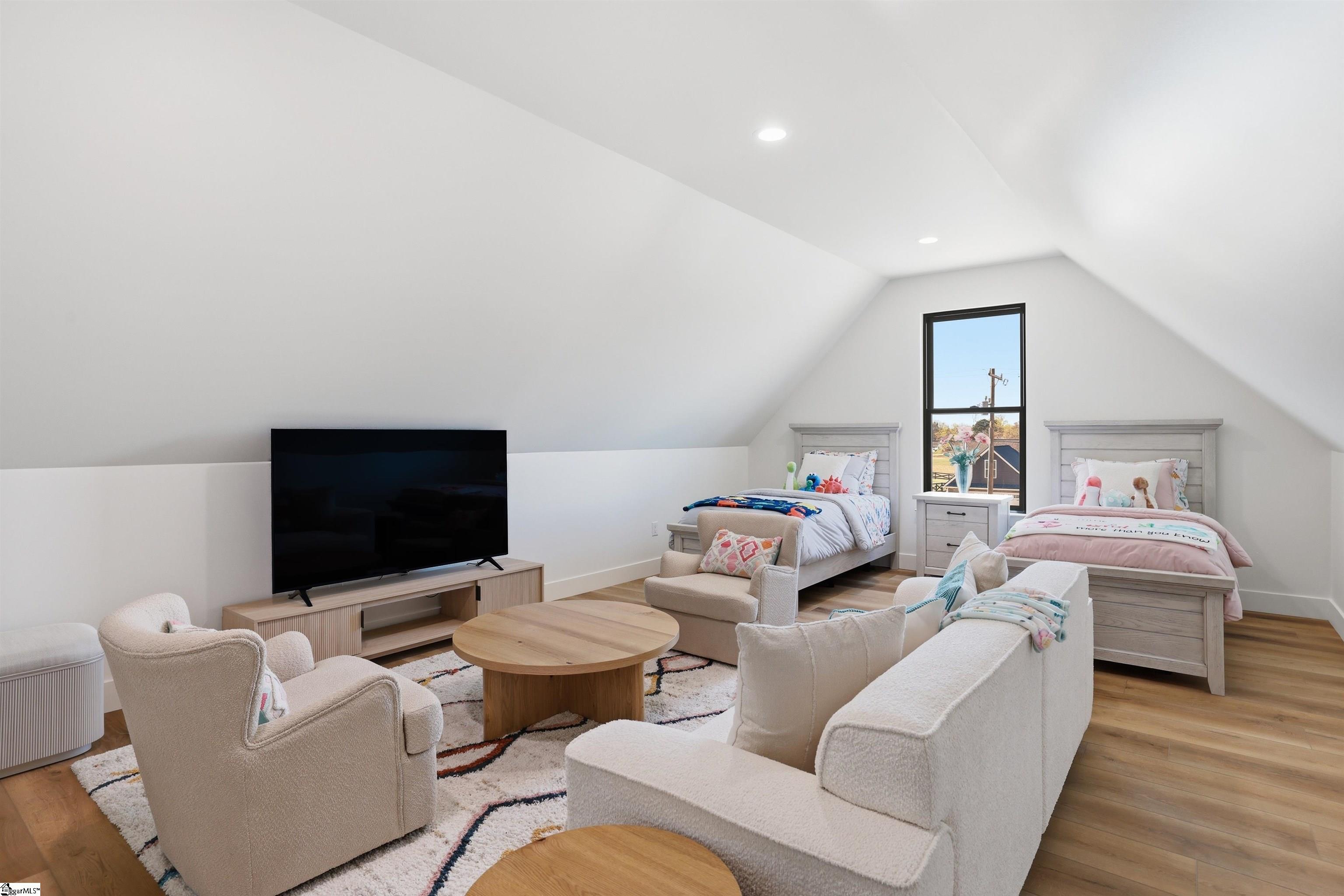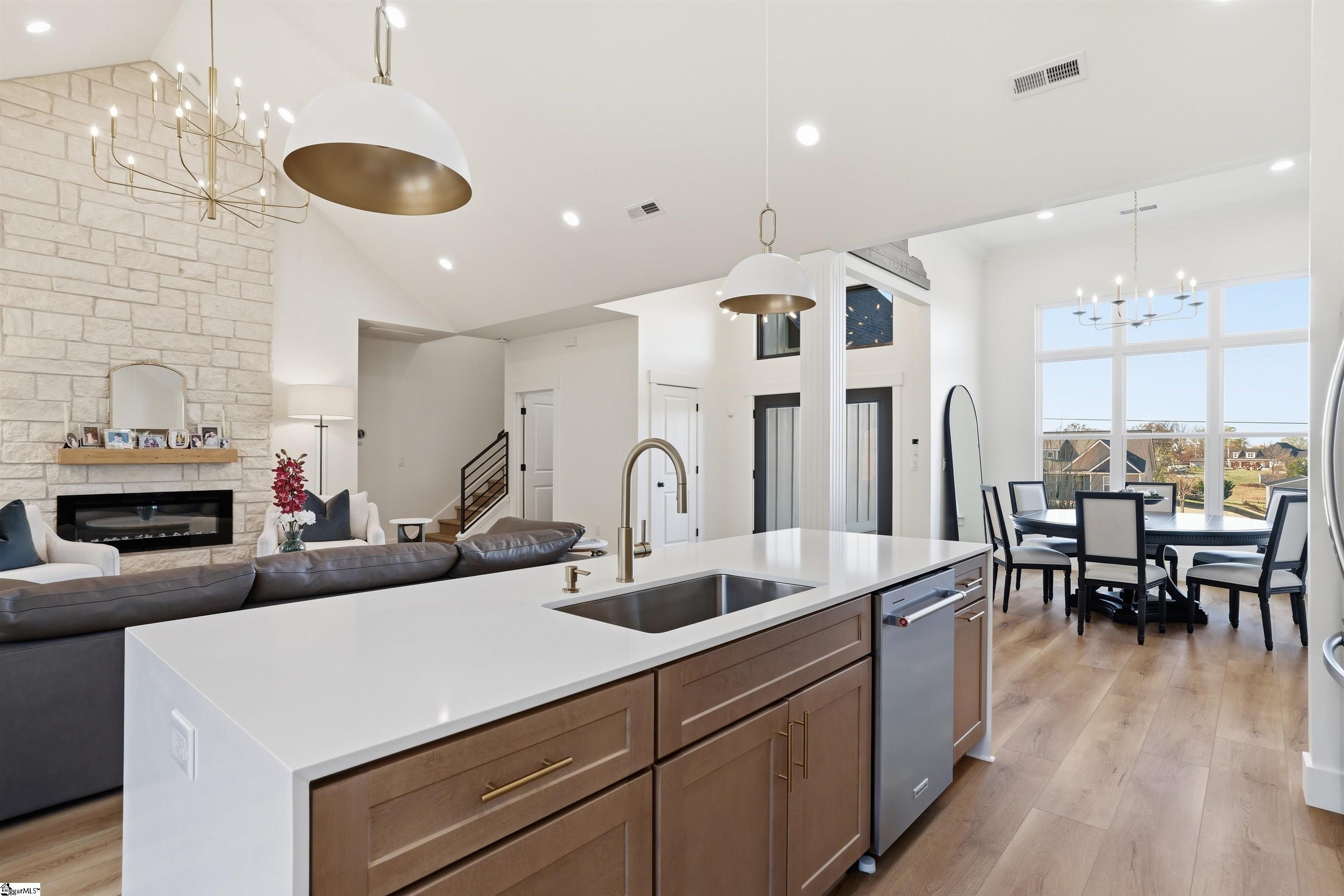 Like-new architectural contemporary residence completed November 2024 and enhanced with curated post-construction upgrades, 4 bedrooms, 2 baths, 2192 square feet on 0. 57 acres. The open-concept main level features cathedral ceilings rising approximately 15'6" in the living and kitchen areas and a dramatic floor-to-ceiling architectural fireplace serving as the visual centerpiece of the living room. The gourmet kitchen includes a quartz waterfall-edge island designed for entertaining that seats 4, tall architecturally scaled cabinetry, luminous contemporary backsplash, professional slide-in range, refined LG double-oven configuration, and high-end KitchenAid dishwasher with stainless-steel interior and advanced drying technology. Kohler Burnished Moderna Gold fixtures complete the refined aesthetic. The primary suite includes a sitting area and spa-inspired bath with black marble-style tile, white veining, and burnished gold Schluter trim. The guest bath features serene porcelain tile extending from tub to ceiling with silver Schluter trim and a modern glass splash panel above the tub. Two spacious main-level bedrooms accommodate king-size beds. A nearly 400 sq ft flex suite above the garage offers versatility as a bedroom, media room, or additional living space with independent mini-split climate control. Additional highlights include epoxy-finished oversized garage, transferable lifetime termite bond, covered rear porch, private driveway turnaround, security system, and smart thermostat.