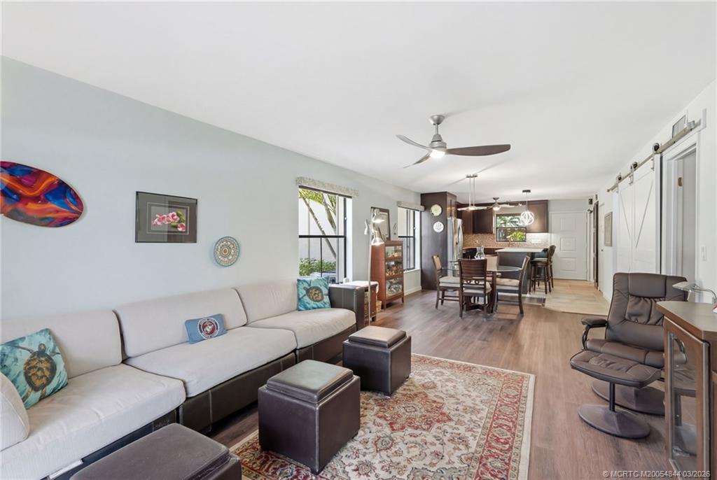 An open concept 2-bedroom 2 bath first floor unit is now available in the sought after South River community. The unit has been remodeled, and kitchen walls have been removed to create an open, flowing space into the dining and the living areas. The 2 bathrooms have been upgraded as well. The a/c was replaced in 2019 and the water heater in 2025. The electric throughout the unit has been updated. As you enter the unit, you will be impressed at the large space before you. There are laminate wood floors throughout most of the unit. Barn doors are used for many of the room's entrances.