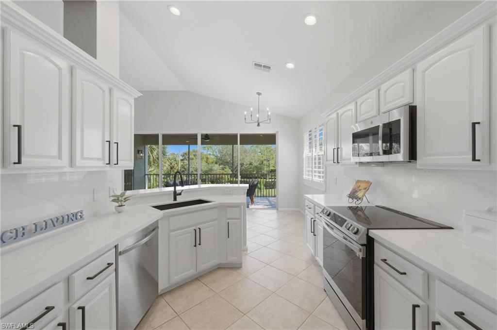 Live just minutes from the beach in this stunning top-floor condominium offering over 2000 square feet of living space and a spacious 200sqft screened lanai with lake views. Inside, the open floor plan is filled with natural light and highlighted by vaulted ceilings, a separate breakfast area and formal dining space. The remodeled kitchen showcases elegant quartz countertops, white cabinetry, and newer appliances. The primary suite offers direct lanai access, a remodeled bathroom featuring both a soaking tub and separate shower, plus a custom designed walk-in closet by California Closets. Two additional bedrooms provide flexible space for guests, family, or a home office. Priced under $600, 000, this home offers one of the best locations in Naples—just two miles from Waterside Shops and Mercato and less than three miles from the beach. Autumn Woods is a gated, family-friendly community offering tennis, pickleball, basketball courts, a playground, fitness center, two community rooms, and two heated pools, including a clubhouse pool with lap lanes. Residents enjoy more than 26 acres of natural preserves, scenic lakes, and walking paths. Great school district! Cedar Ridge buildings have been recently refreshed with new roofs, fresh exterior paint, updated lighting, and enhanced landscaping. Whether you're looking for a full-time residence or a seasonal retreat, this home offers the perfect blend of comfort, convenience, and the Naples lifestyle in one of Naples’ most desirable gated communities.