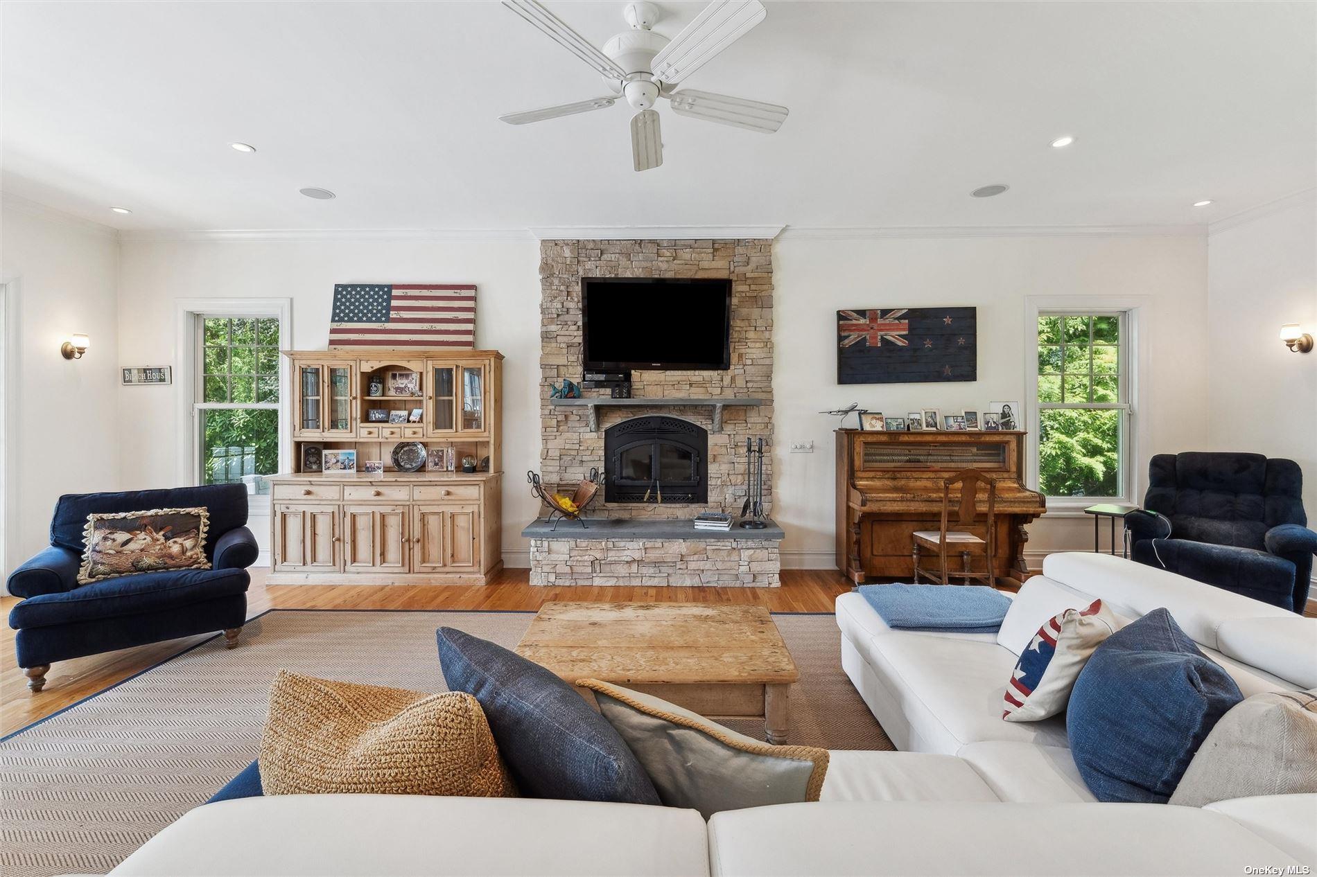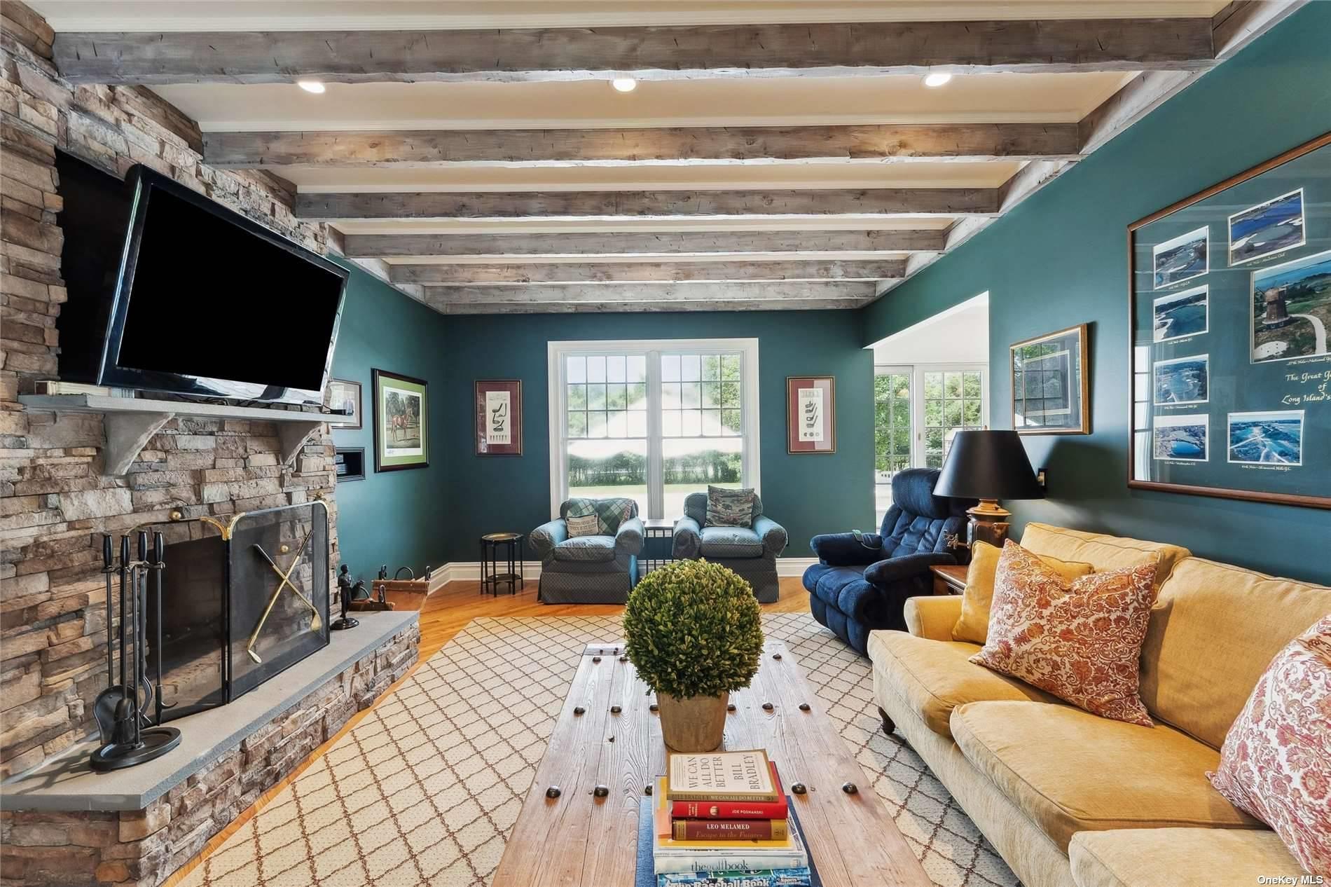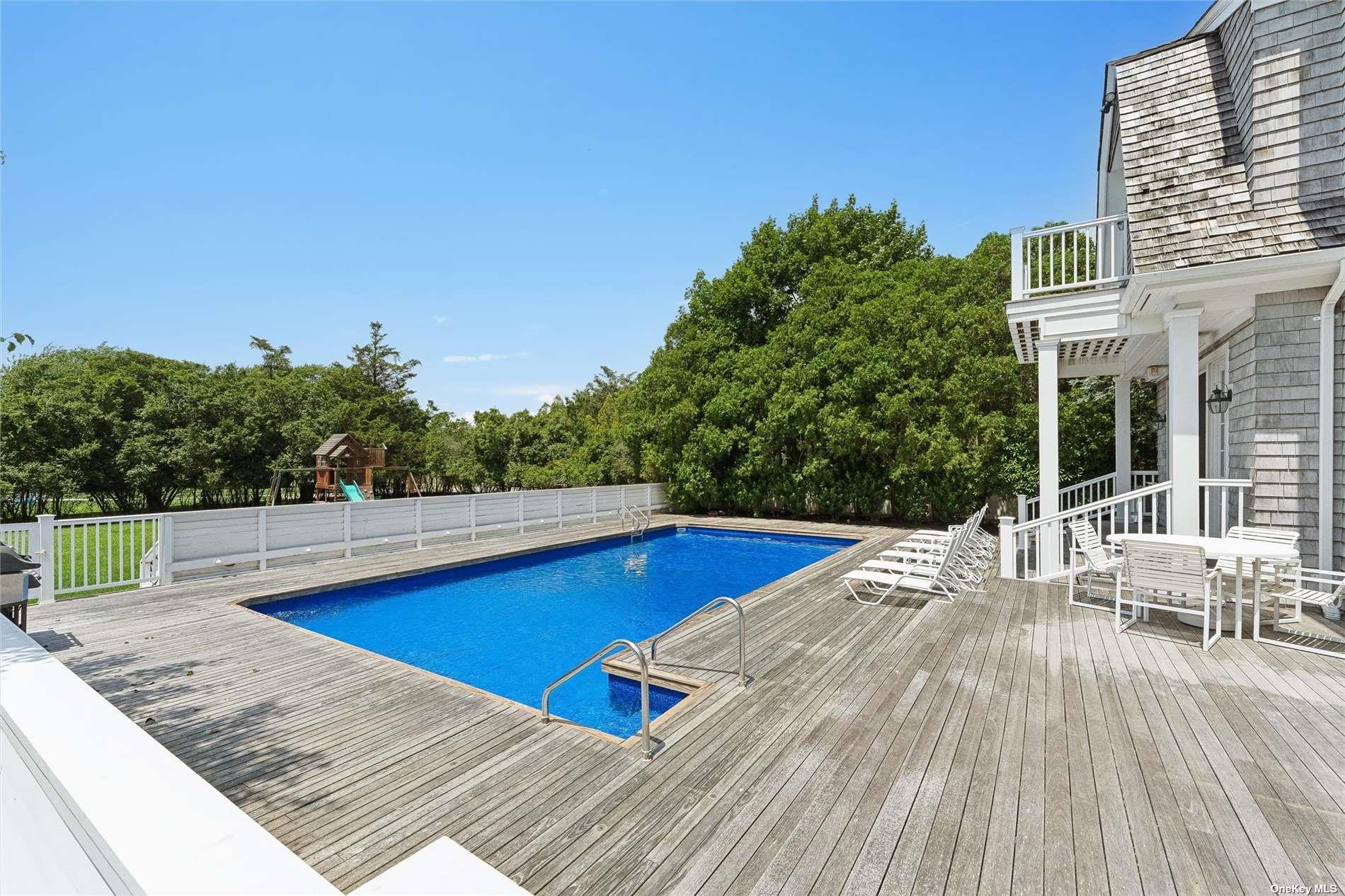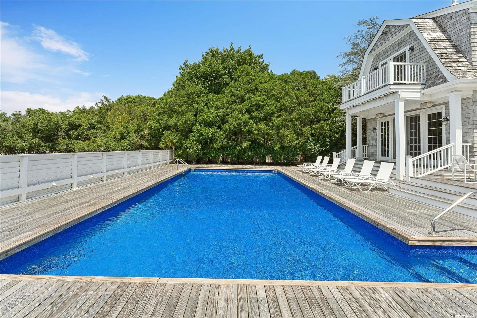 Experience quintessential Hamptons style in Remsenburg, at this coveted location just south of South Country Road. The custom estate was built in 2004, and is nestled on nearly an acre, offering 4, 000+/- SF of living space. Curb appeal abounds with the charming covered front porch & cedar shingle exterior. The first floor boasts seamless flow from the double height, entry foyer to a formal living room, dining room, and an open great room with a stunning stone surround, wood-burning fireplace, and French doors leading to the expansive back deck and pool area. The chef's kitchen features custom wood cabinets, granite countertops, dual sinks, and top-of-the-line appliances including Sub Zero refrigerator, Bosch & Thermador dishwashers, Thermador double ovens & gas range, and Sub Zero drink fridge. Adjacent is a sunken den with a wood-burning fireplace and closely located full bath with walk-in shower, perfect for guests. Upstairs, the ensuite bedroom features a balcony overlooking the backyard and a bathroom with a luxurious walk-in steam shower. A Jack & Jill bedroom setup offers convenience with separate shower and vanity access. Another bedroom includes a gas-burning fireplace and ensuite bath with shower/tub combination. The master suite is a retreat with a gas-burning fireplace, dual walk-in closets, a spa-like bath with double vanities, 2-person 30 jet soaking tub, walk-in steam shower, and access to a private balcony. Outdoors, enjoy nearly 1 acre of lush grounds with a play set, oversized deck, pool, and jacuzzi. Additional features include a Belgium block lined gravel driveway, radiant heated floors (tile), central vacuum, home security alarm, built-in speakers, a 1. 5 car attached garage, and low Remsenburg taxes. Don't miss out on this exceptional opportunity. Schedule your showing today!,