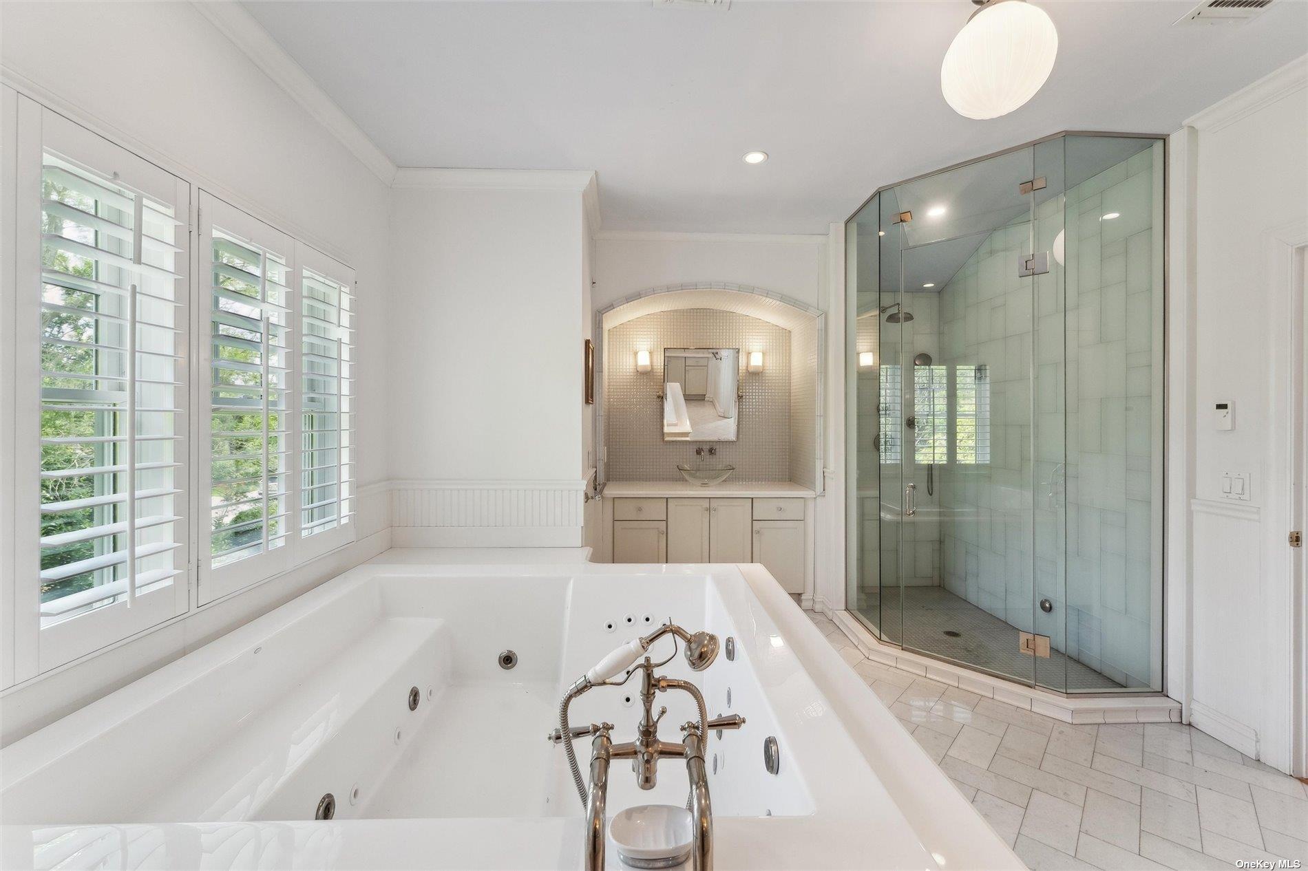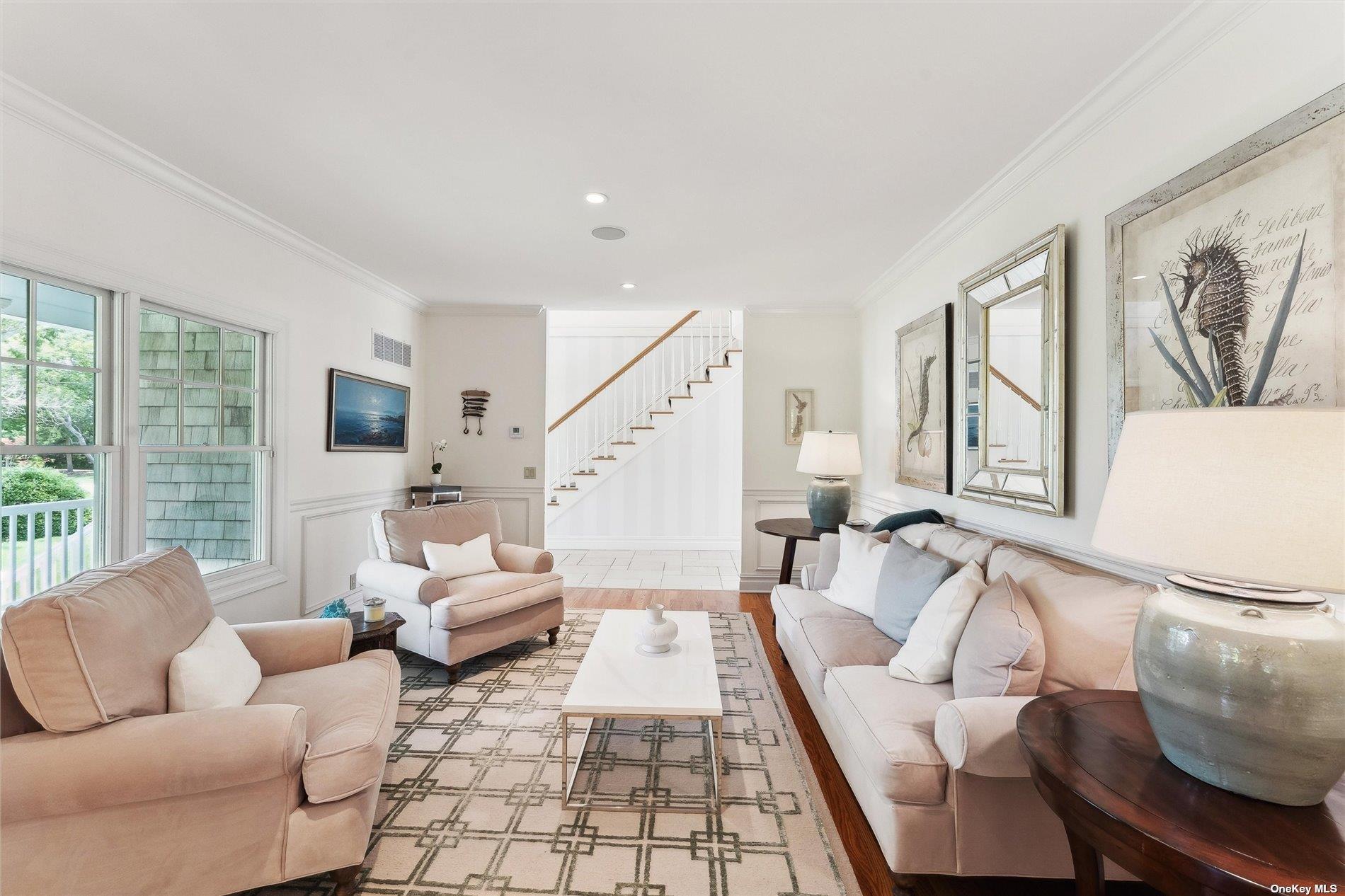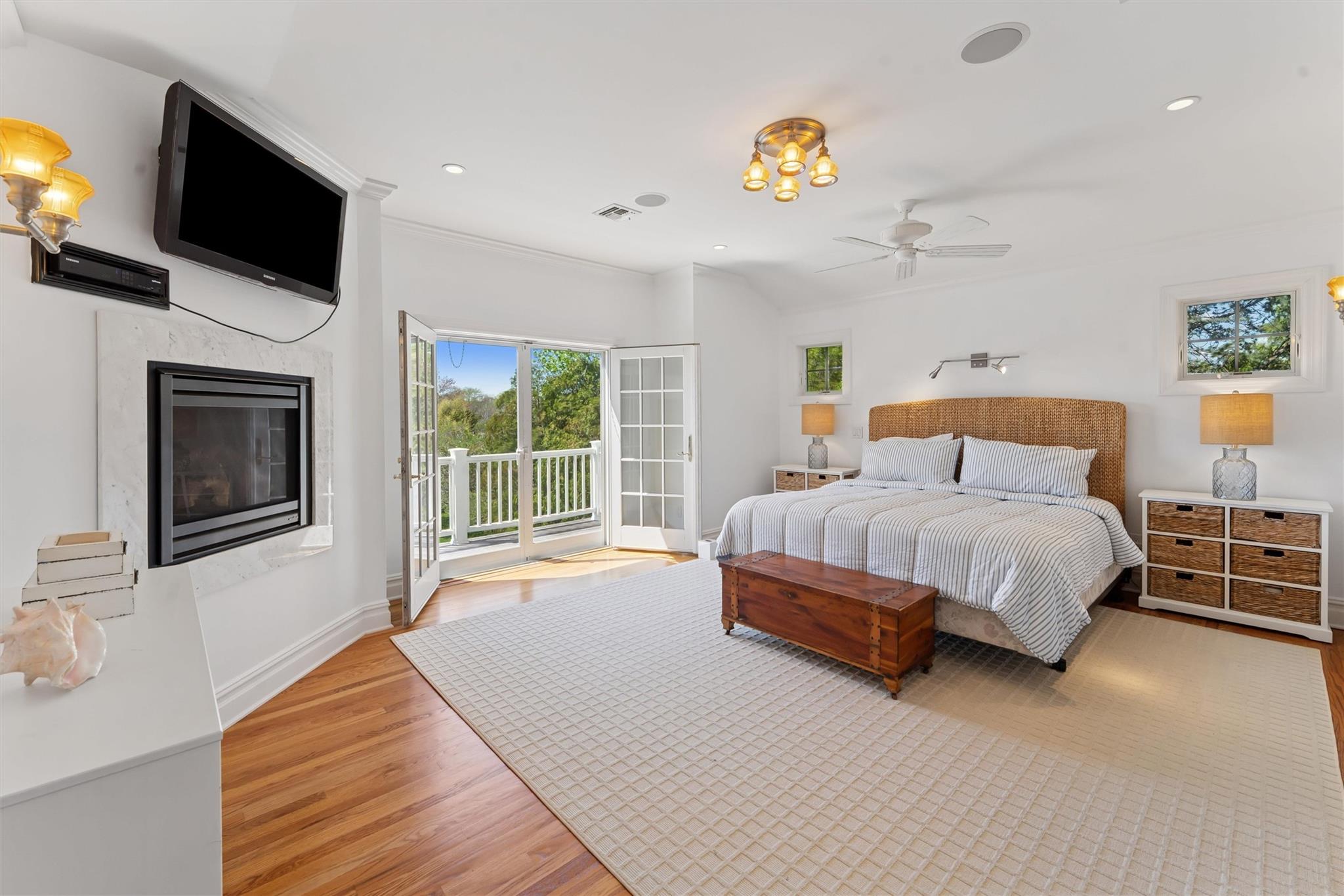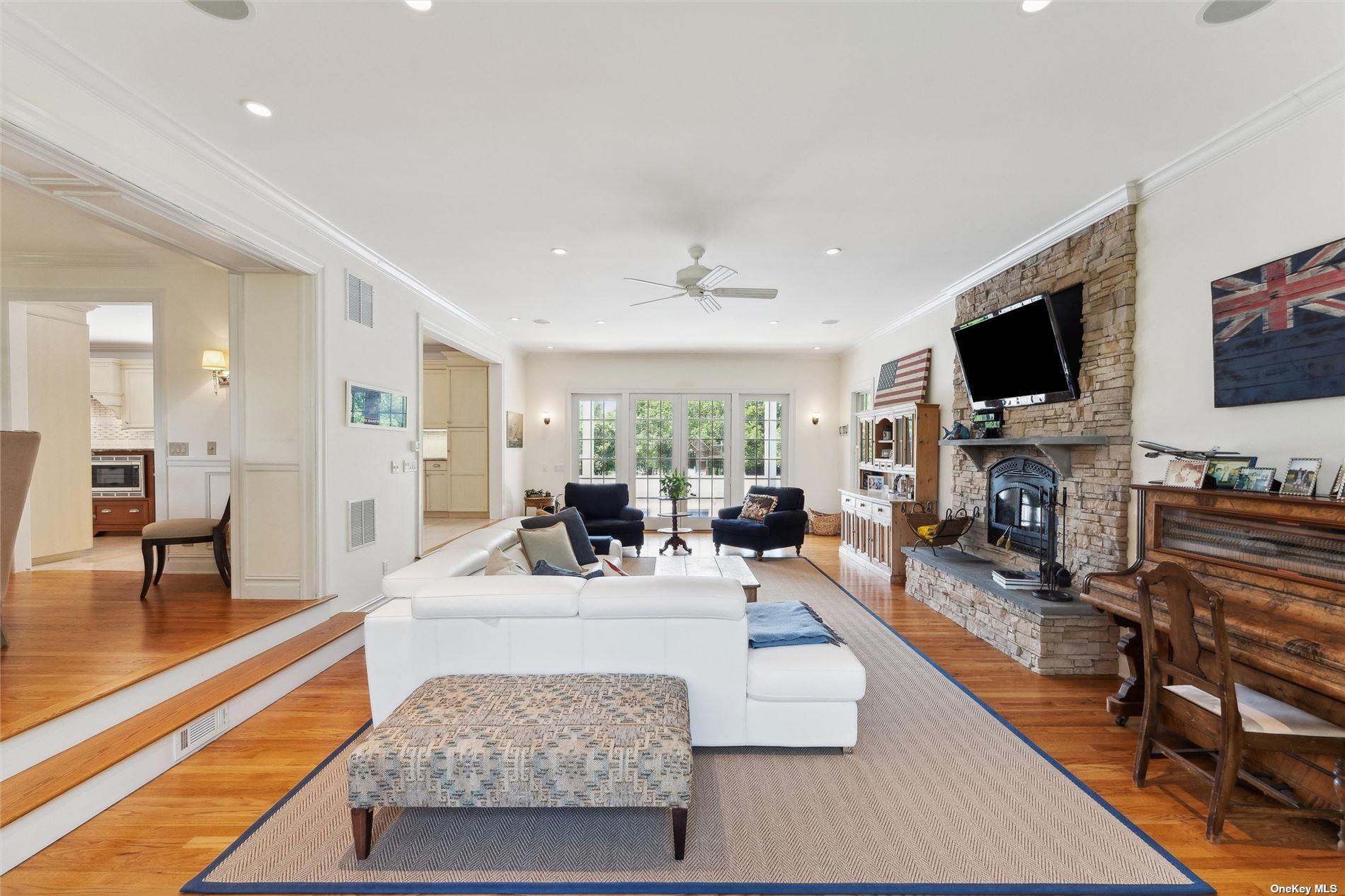 Experience quintessential Hamptons style in Remsenburg, at this coveted location just south of South Country Road. The custom estate was built in 2004, and is nestled on nearly an acre, offering 4, 000+/- SF of living space. Curb appeal abounds with the charming covered front porch & cedar shingle exterior. The first floor boasts seamless flow from the double height, entry foyer to a formal living room, dining room, and an open great room with a stunning stone surround, wood-burning fireplace, and French doors leading to the expansive back deck and pool area. The chef's kitchen features custom wood cabinets, granite countertops, dual sinks, and top-of-the-line appliances including Sub Zero refrigerator, Bosch & Thermador dishwashers, Thermador double ovens & gas range, and Sub Zero drink fridge. Adjacent is a sunken den with a wood-burning fireplace and closely located full bath with walk-in shower, perfect for guests. Upstairs, the ensuite bedroom features a balcony overlooking the backyard and a bathroom with a luxurious walk-in steam shower. A Jack & Jill bedroom setup offers convenience with separate shower and vanity access. Another bedroom includes a gas-burning fireplace and ensuite bath with shower/tub combination. The master suite is a retreat with a gas-burning fireplace, dual walk-in closets, a spa-like bath with double vanities, 2-person 30 jet soaking tub, walk-in steam shower, and access to a private balcony. Outdoors, enjoy nearly 1 acre of lush grounds with a play set, oversized deck, pool, and jacuzzi. Additional features include a Belgium block lined gravel driveway, radiant heated floors (tile), central vacuum, home security alarm, built-in speakers, a 1. 5 car attached garage, and low Remsenburg taxes. Don't miss out on this exceptional opportunity. Schedule your showing today!,
