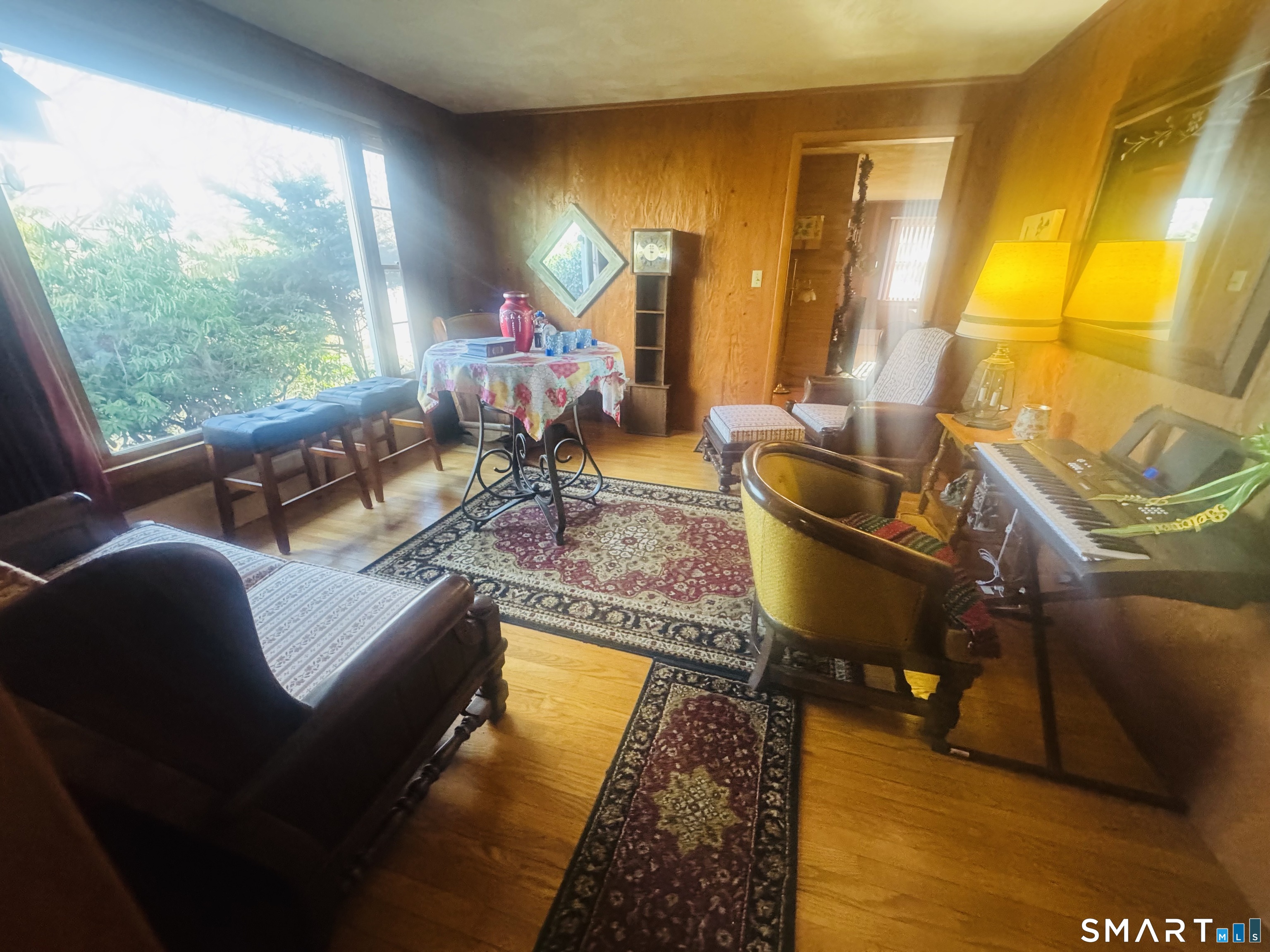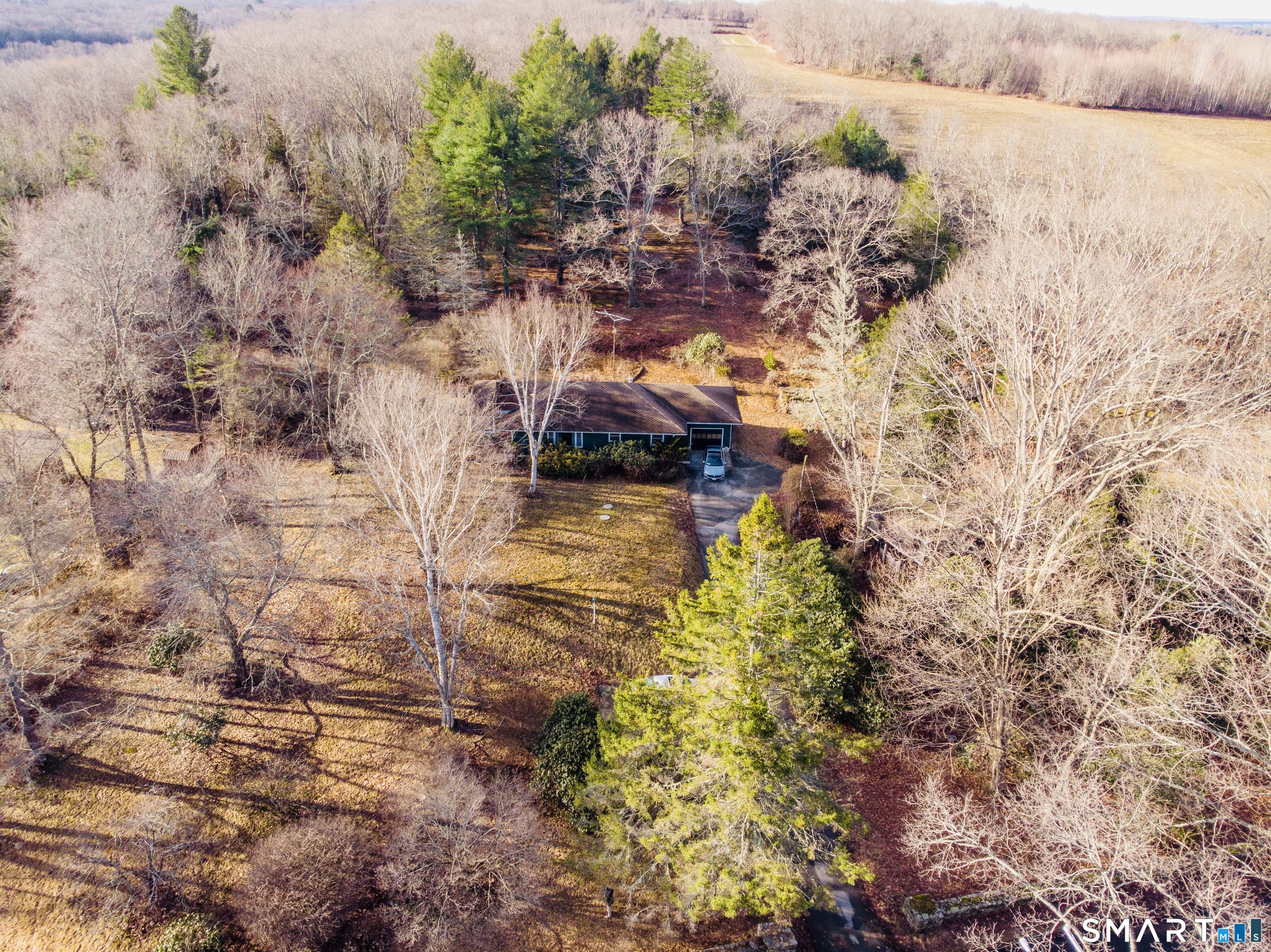 Beautiful stone wall boundary has a paved driveway leading to a sprawling ranch on PRIVATE 2. 5 acres with a 2022 NEW 1000 gallon septic and leachfield! 2 spacious bedrooms possibility of making a 3rd with the den. GORGEOUS hardwood flooring in large fireplace living room with bright windows for natural light and door that goes out to 20 x5 covered porch. Appliance eat in kitchen next to den. 2007 Roof with 50 year architectural shingles. 520 foot screened porch area for entertaining in the spring/summer evenings. Attached 1 car garage. 1 full bathroom (peeling paint on walls). ALMOST 1500 sq ft. 2025 water pump & holding tank and newer boiler starter. ***Looking for a quick closing!***
