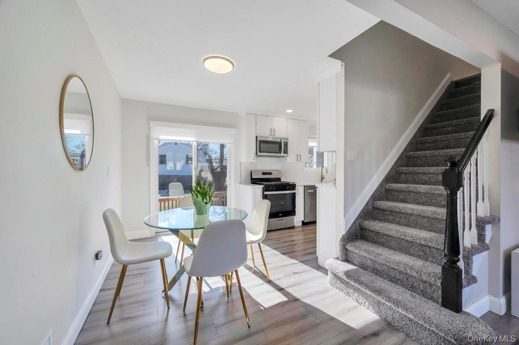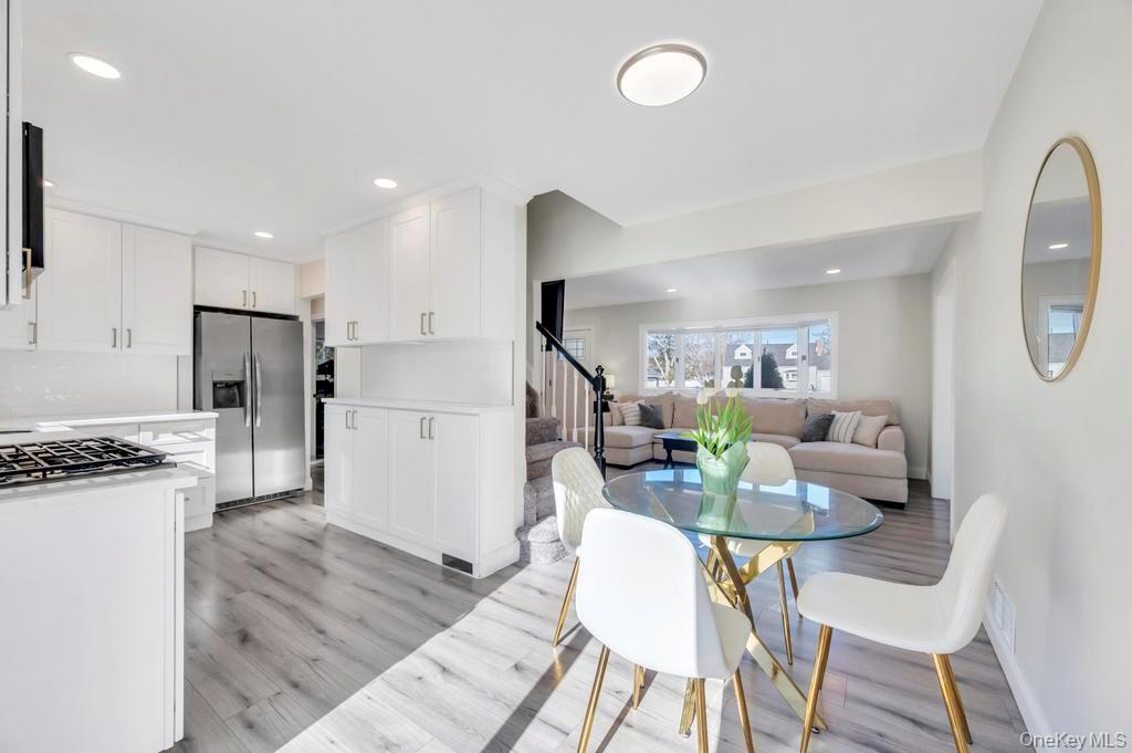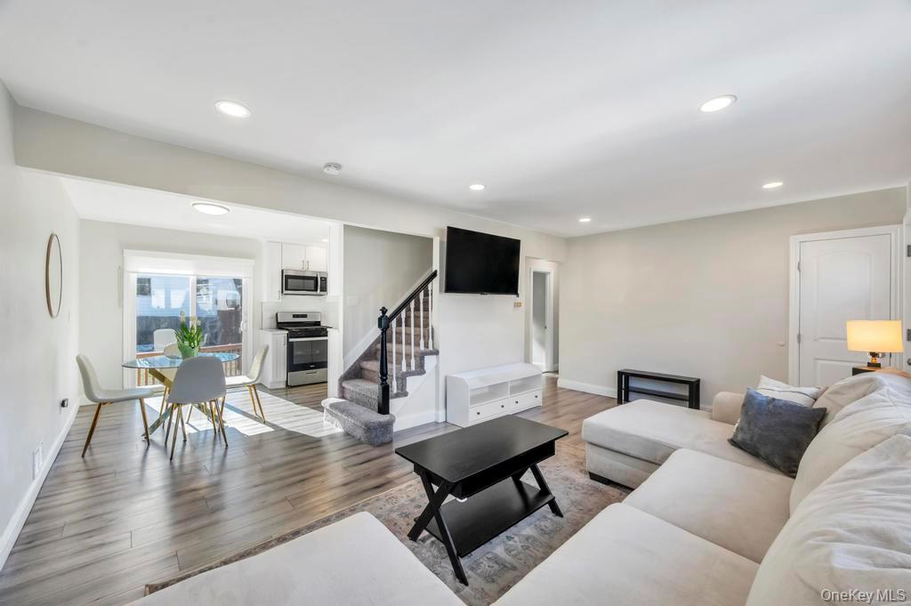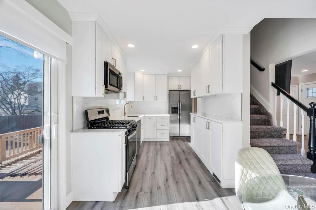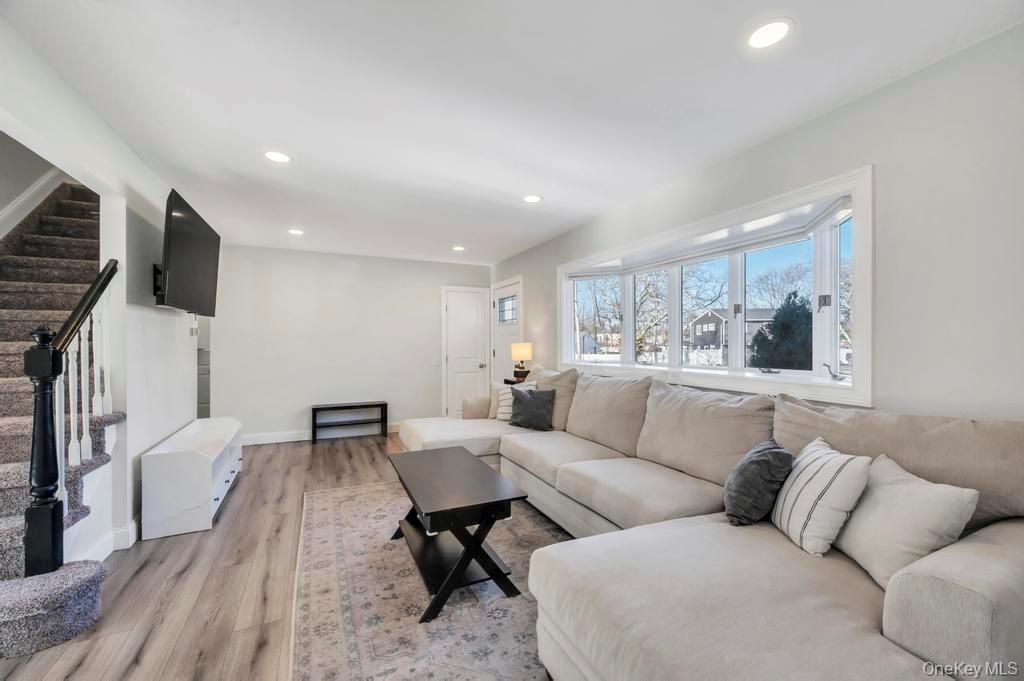 Charming, completely 2022 renovated 4 bedroom expanded Cape located in the Comsewogue School District and within minutes of the vibrant Port Jefferson Village. Interior features of the home include a newer kitchen with quartz countertops, gray wood vinyl floors, dining room with vaulted ceilings, updated baths, recessed lighting, and finished basement. The first floor includes a large Primary bedroom with additional bedroom and bathroom. The second floor offers two more generous sized bedrooms. Exterior features include asphalt driveway with Belgian block edging with new front landing, newer wood deck, and beautiful landscaping.