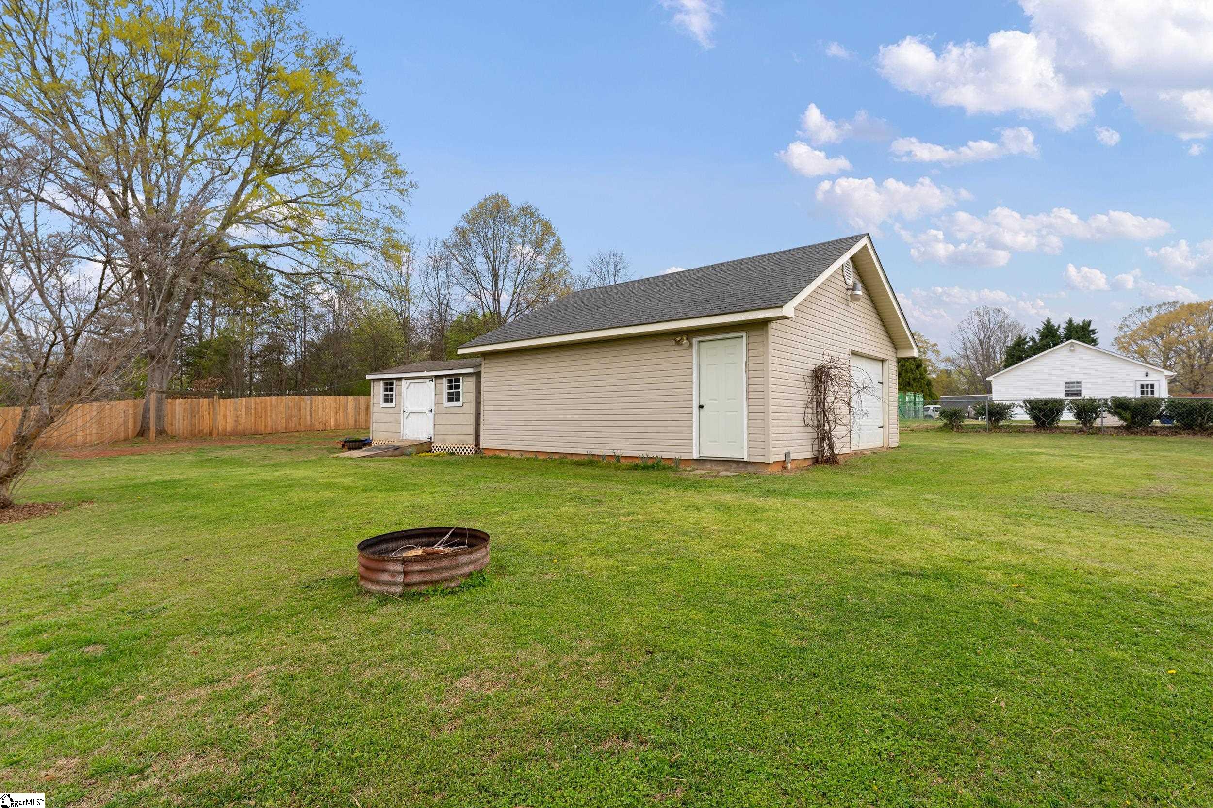 Charming, well maintained, move-in ready three-bedroom, two bath home, split floor plan on. 68 acres with 2-car attached garage. This large, flat yard is fenced and includes a 23x23 detached garage/workshop (features built-in workbenches and shelving!) as well as a second detached out-building/She or He Shed for projects and storage and NO HOA. Located minutes from I-85 in the heart of Boiling Springs, minutes behind shopping and professional offices, 2 minutes from Va-Du-Mar McMillan Park popular for pickleball, tennis courts, trails and other fun sports! A welcoming front porch and foyer lead into the great room featuring a beautiful knotty pine vaulted ceiling that enhances the home’s character and natural light. The great room provides rear door access onto a 21 x 15 deck, then proceeds on to a large intricately bricked patio providing additional space for enjoying the outdoors and seasonal plantings. The home has new heating and air system and all new duct work! The street ends in a cul de sac, so no passing through traffic! If you are looking for single story living in a quiet neighborhood, this is one you want to check out.