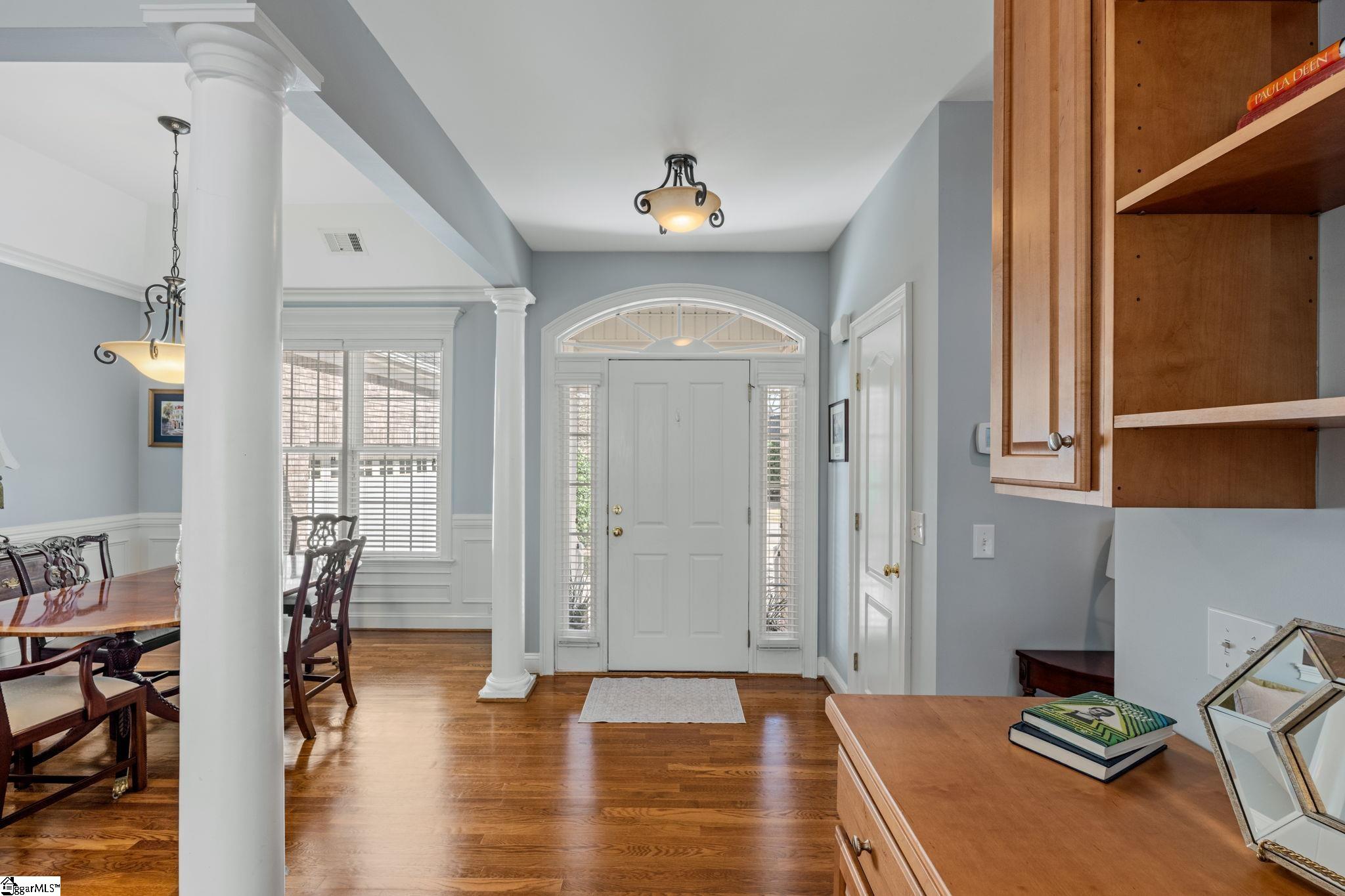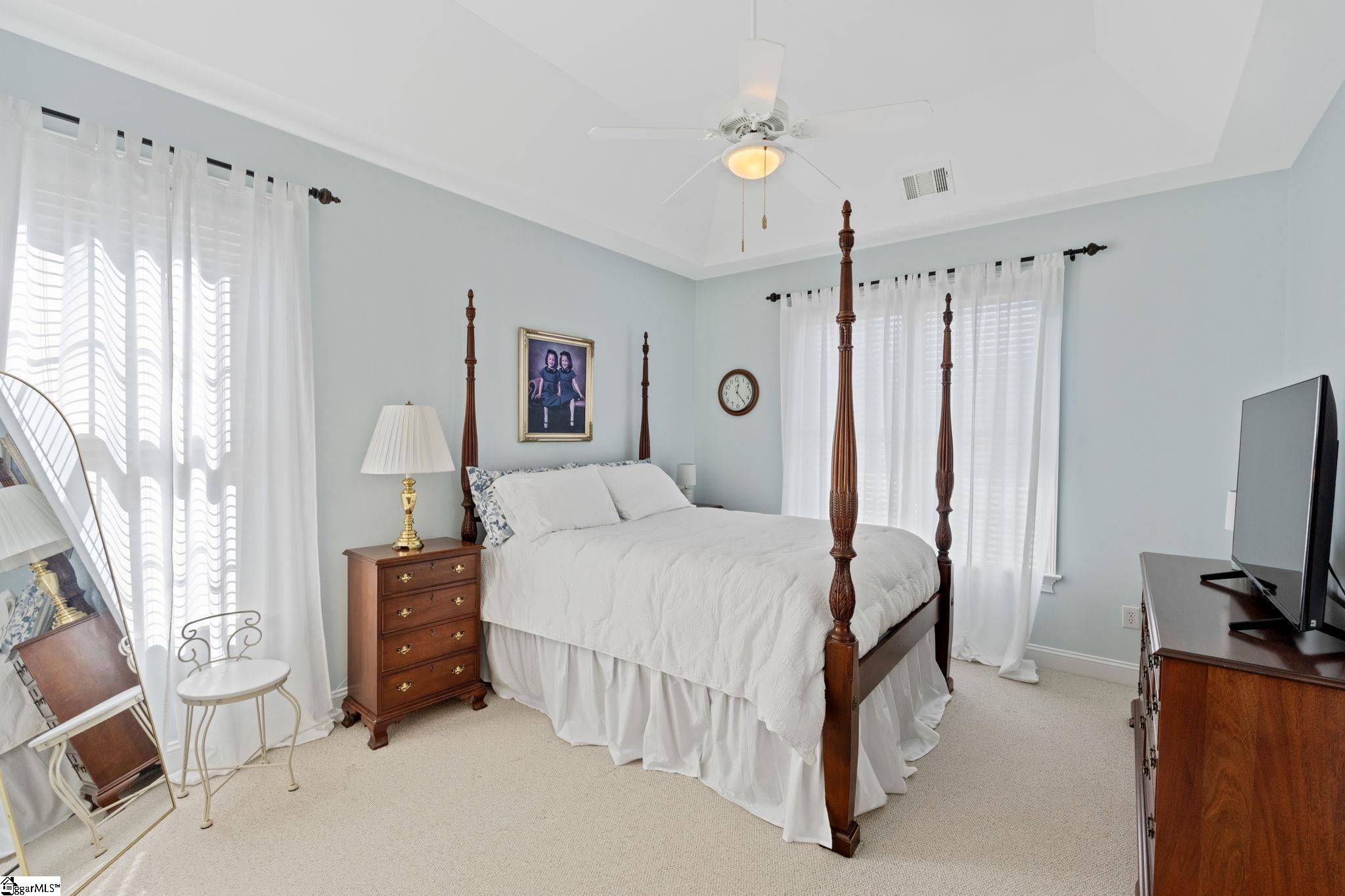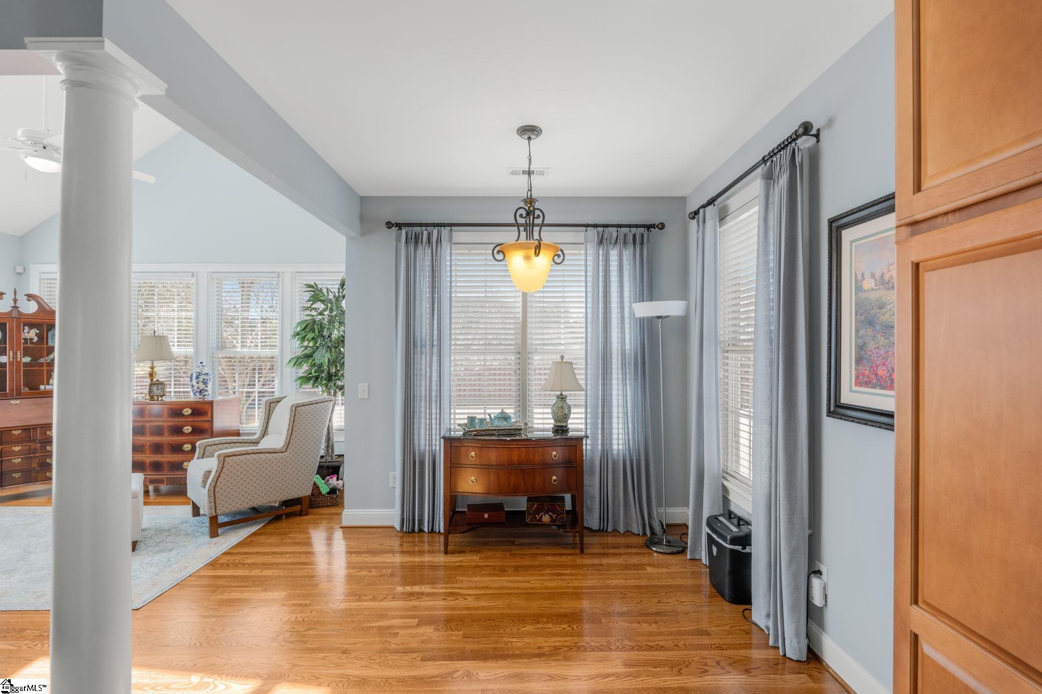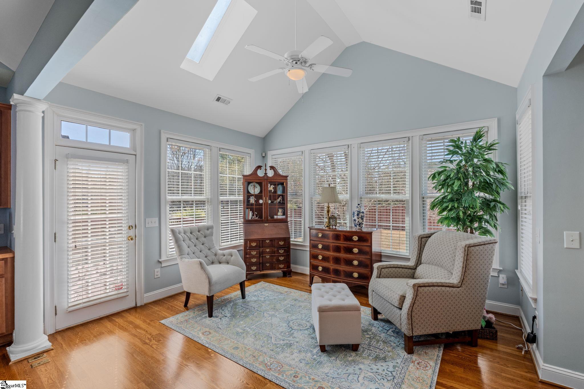 Beautiful 3 bedroom 2 bath, 1. 5-story home with an open floor plan and vaulted ceilings in the main living area. The living room features a cozy gas log fireplace with built-in bookshelves and flows seamlessly into the dining room, sunroom, and breakfast area. The kitchen offers granite countertops, stainless steel appliances, and a gas range. The primary suite on the main includes dual vanities, a garden tub, separate shower, and walk-in closet. Two additional bedrooms and a full bath are also on the main level. Upstairs flex room over the garage is perfect for a media room, playroom, or home office. Enjoy hardwood floors in the main living areas, a deck off the sunroom, and a large flat fenced backyard perfect for entertaining, pets, or play. Beautifully landscaped neighborhood with sidewalks and tree-lined streets!