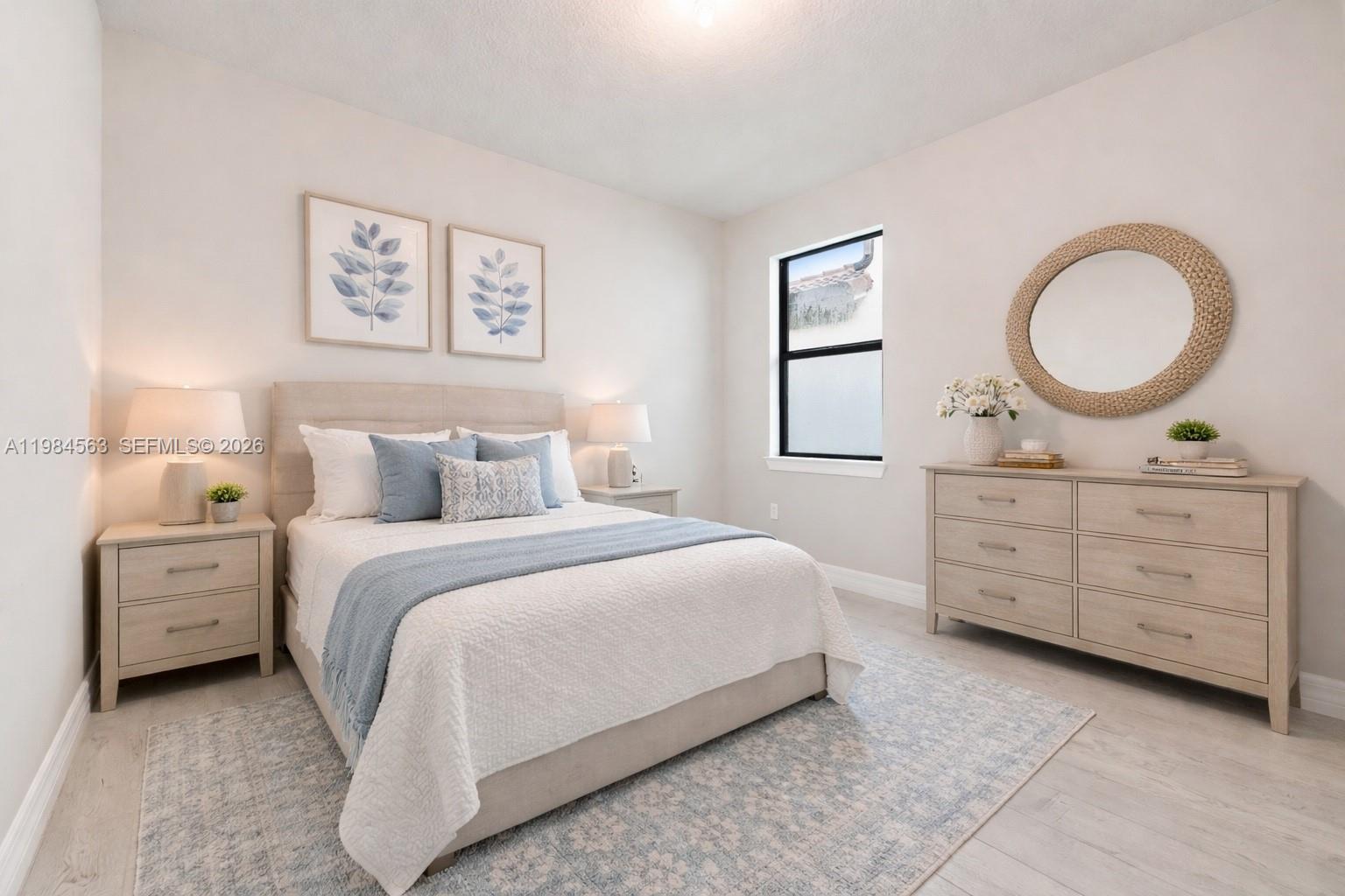 This detached single-family home features 4 bedrooms and 2 full bathrooms, offering a bright, open-concept layout with high-end finishes throughout. The home showcases a designer kitchen with sleek cabinetry, stainless steel appliances including a gas stove, and an oversized island perfect for entertaining. Additional highlights include recessed lighting, plank-style tile flooring throughout, and sliding glass doors leading to a private backyard with serene lake views. A 2-car attached garage completes the home.