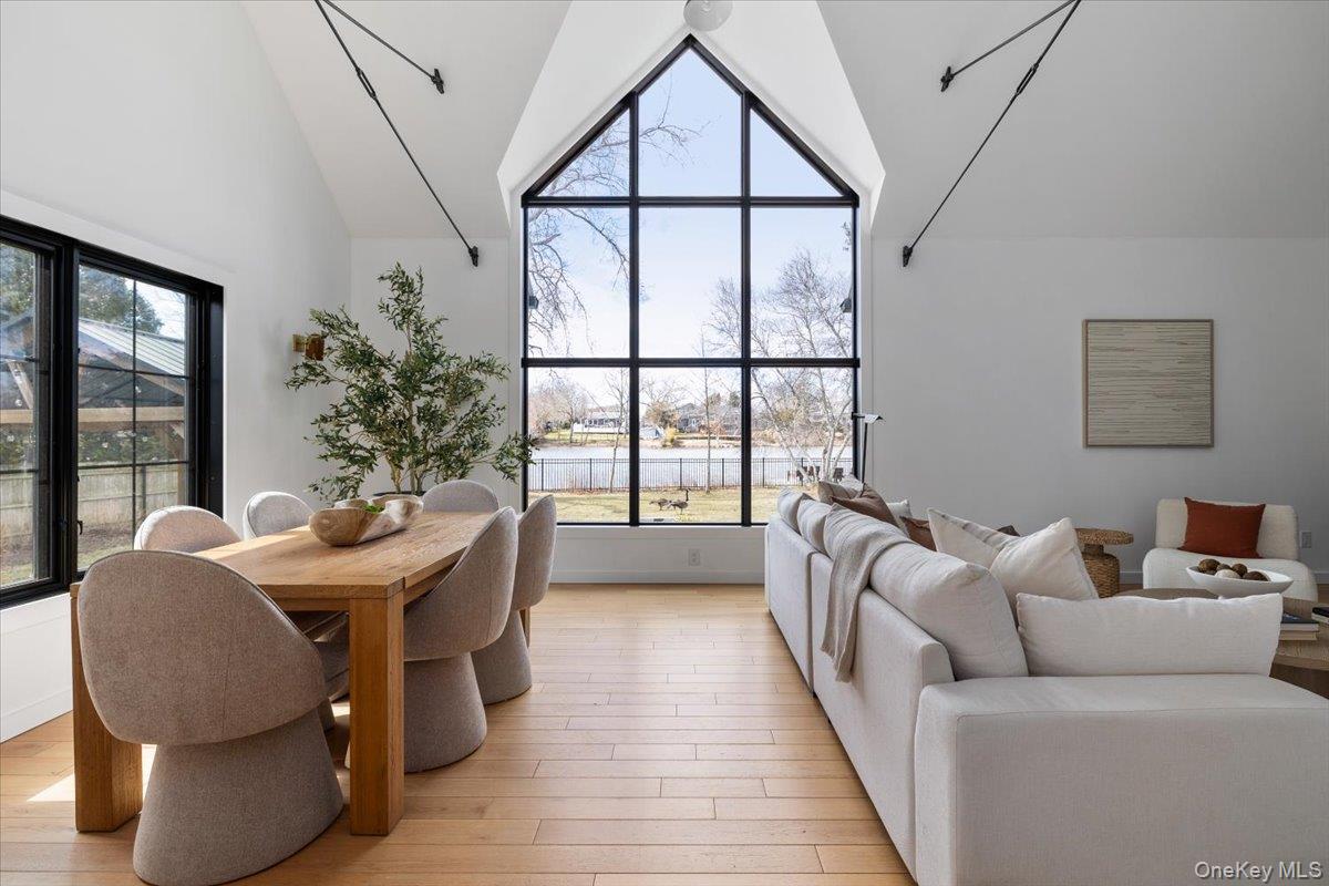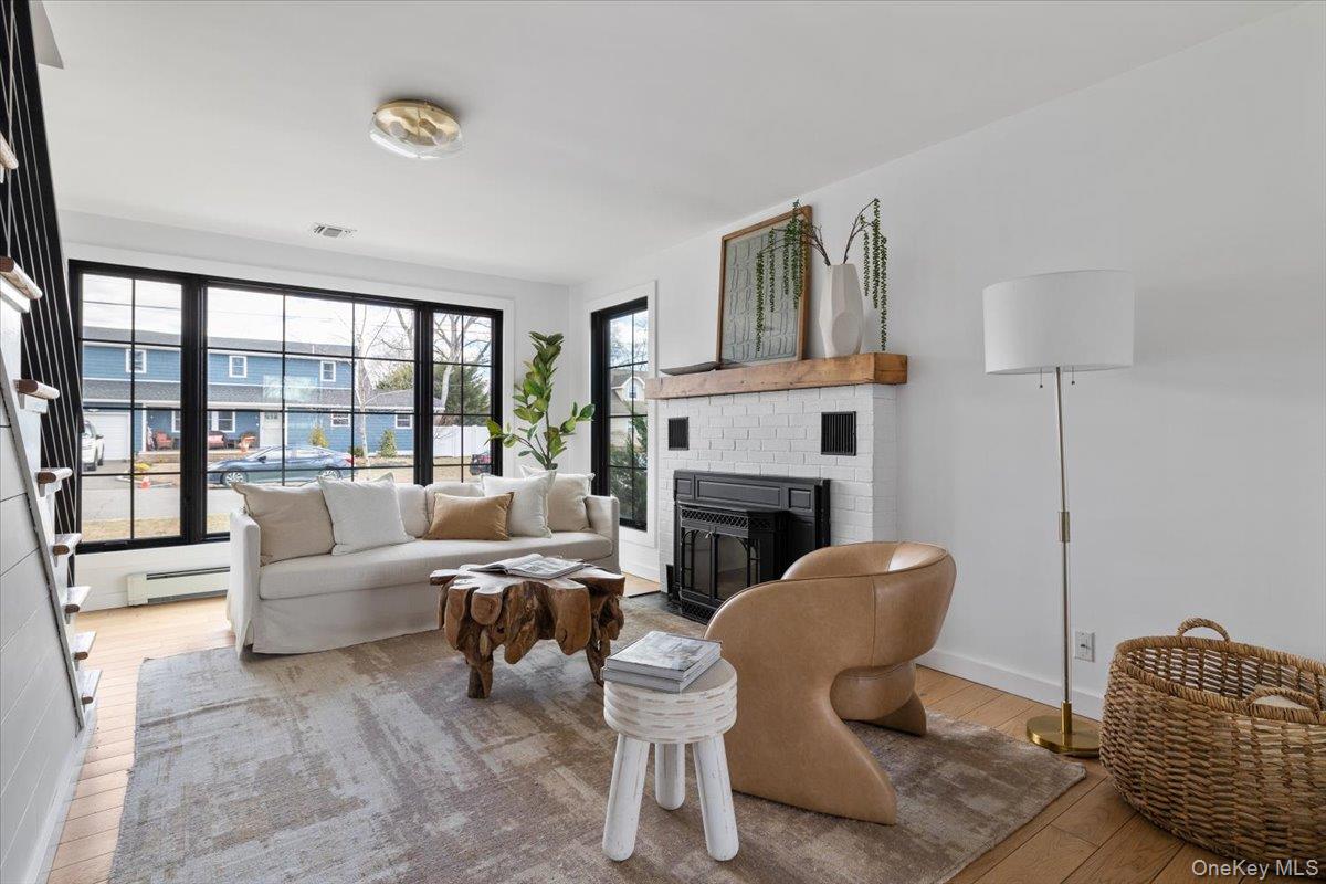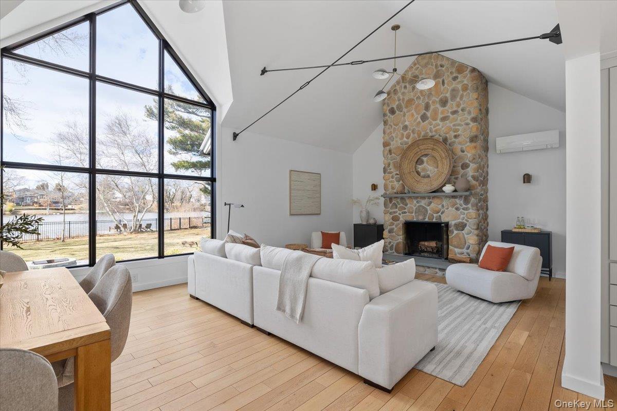 Fully renovated lake front oasis in Patchogue. Over 100 feet of lake frontage with a private dock. The home features a spacious primary bedroom on the main level, white oak floors, massive ceiling heights, and high end appliances including a Bertazzoni induction oven. The living room features a 13 foot custom window with breathtaking views of Patchogue Lake. Additional features include a Trex deck, Diamond cabinets, and 2 wood-burning fireplaces. The home is a true entertainer's paradise that is gently complimented by gorgeous sunsets and the charming lake breeze.