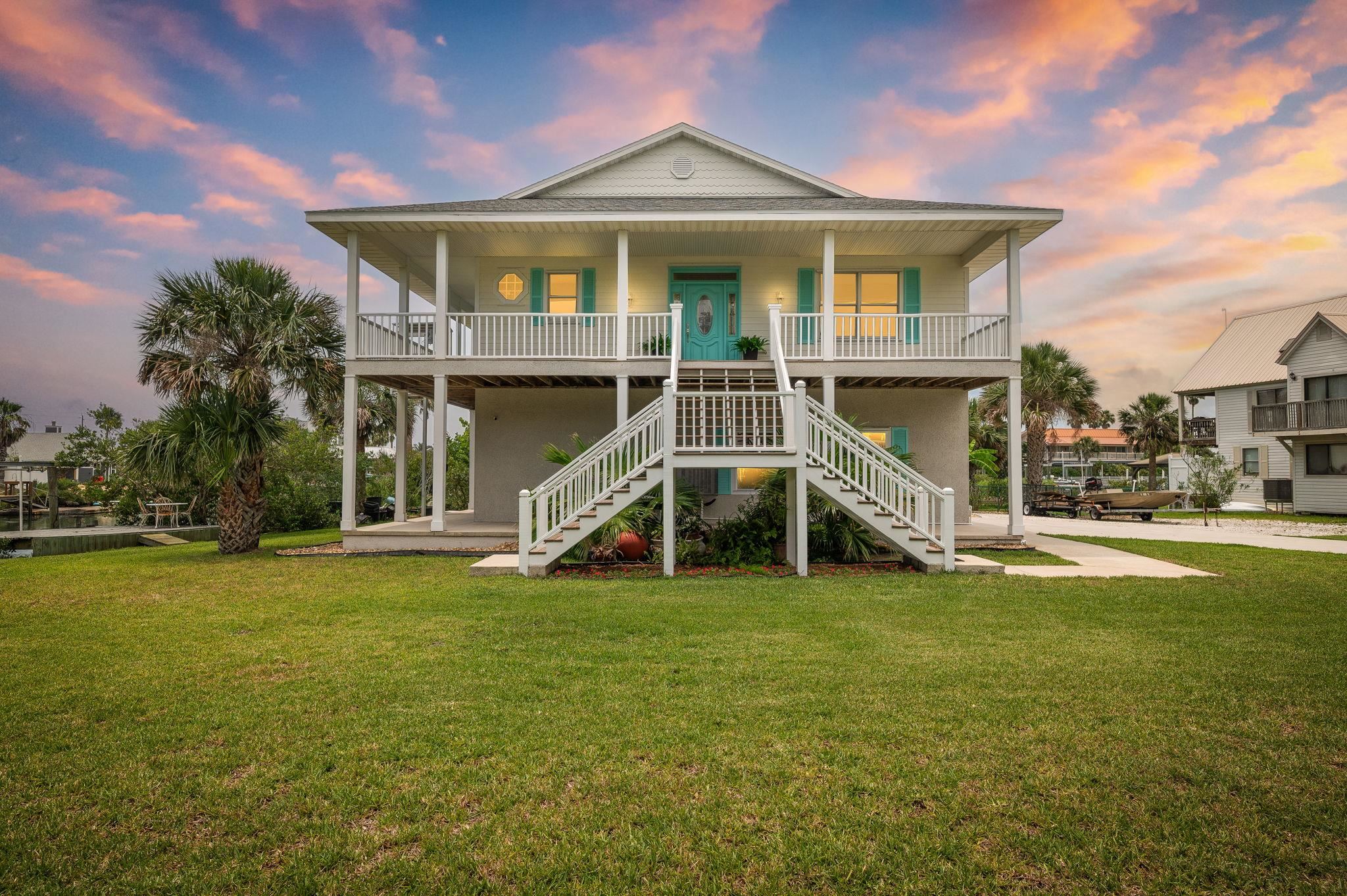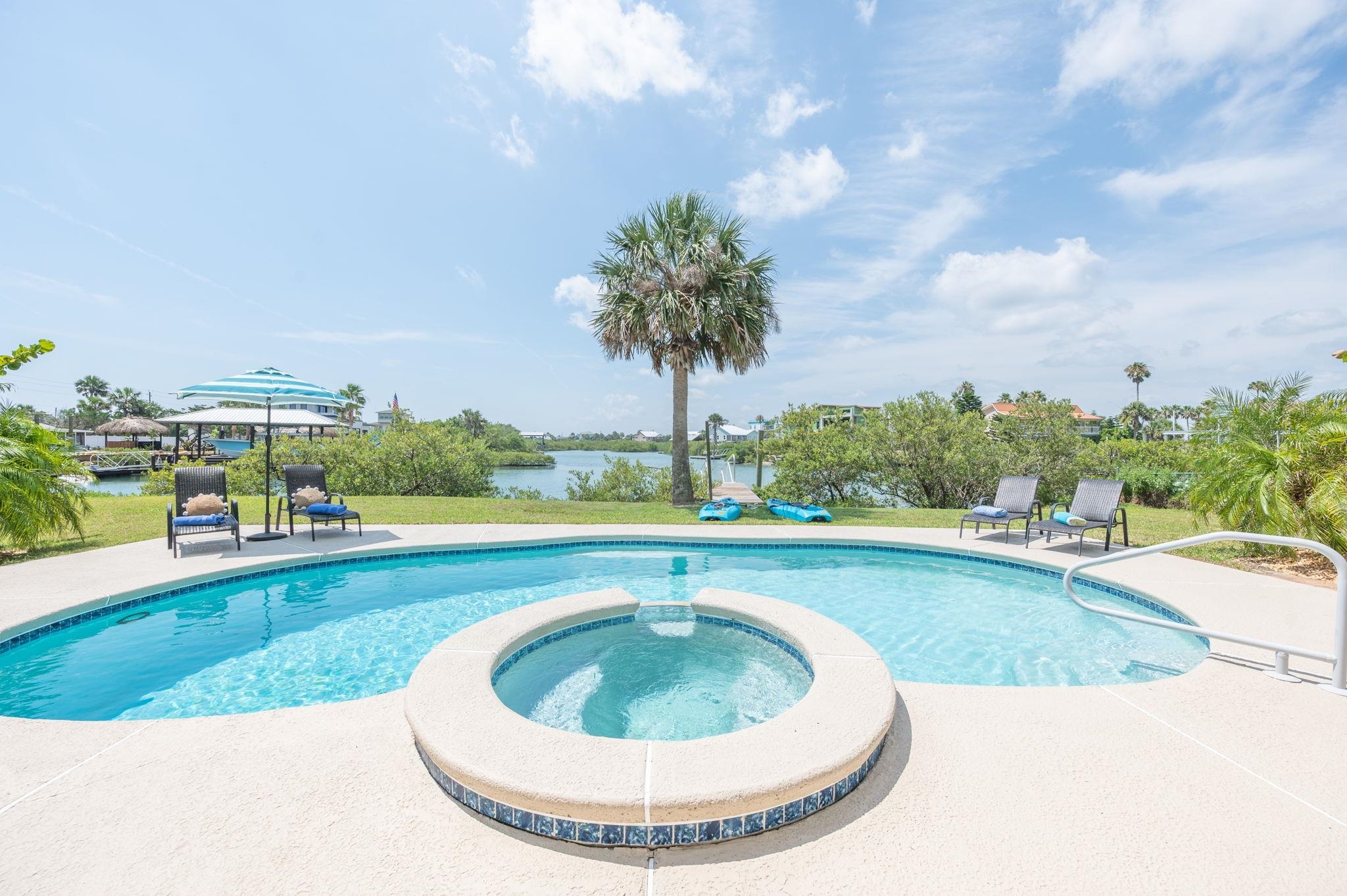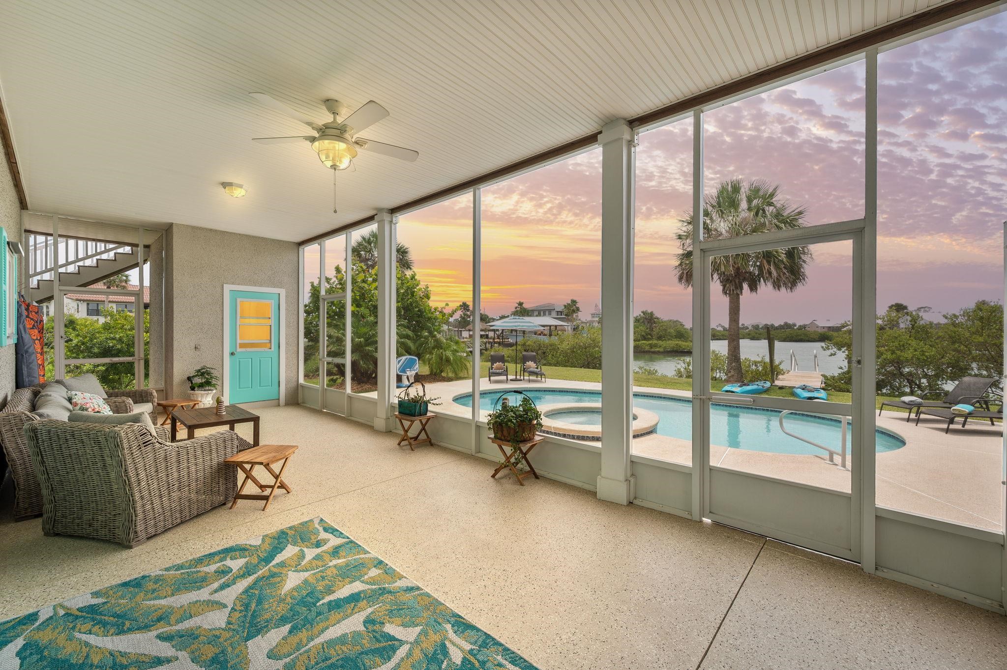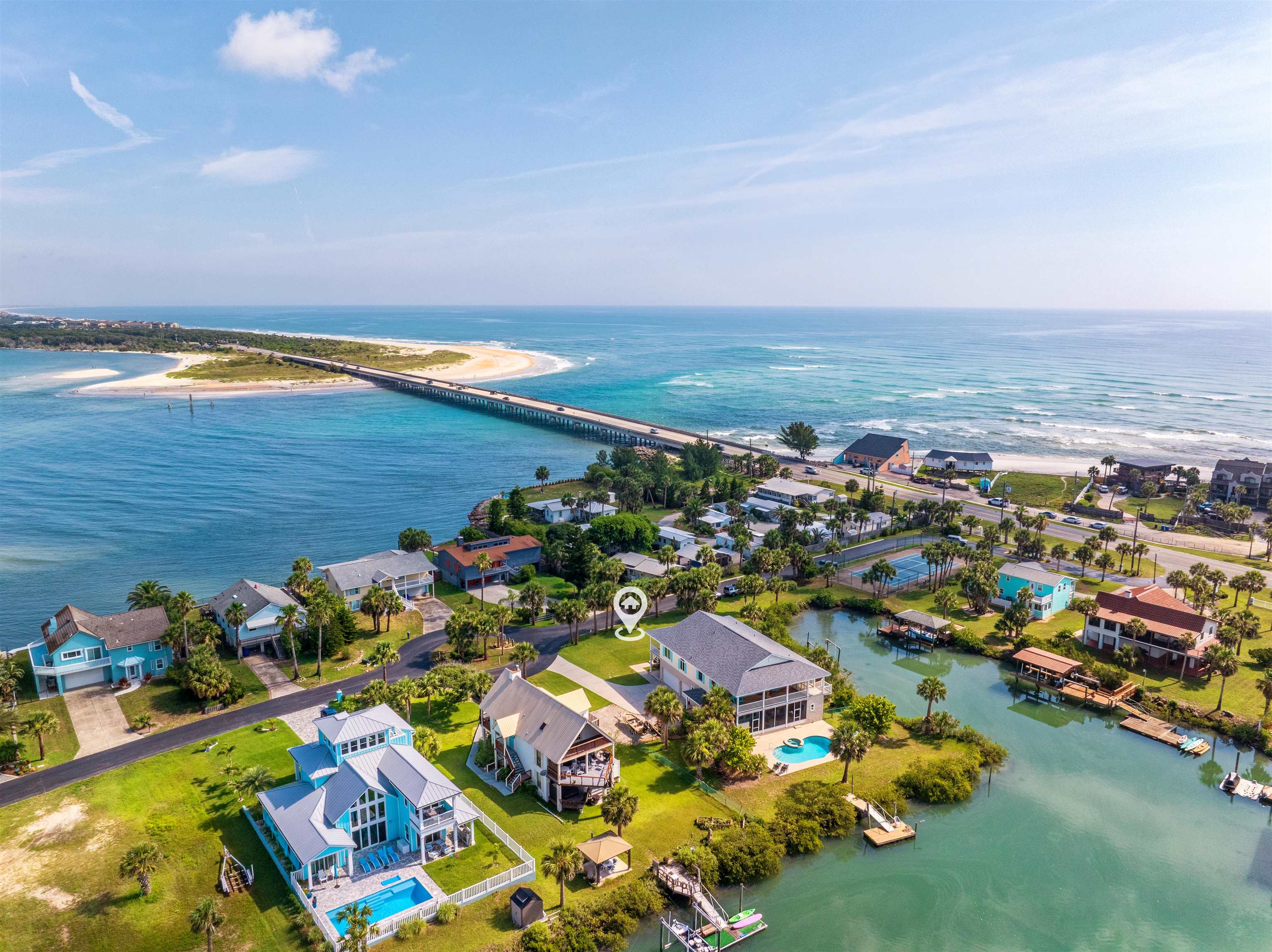 Experience true waterfront living on nearly an acre in the sought-after Barrataria Island community, just moments from Matanzas Inlet. Spanning two generous lots with an extraordinary 400 feet of direct water frontage, this beautifully appointed 3-bedroom, 4-bath residence blends timeless Lowcountry charm with elevated coastal design. Designed to embrace its surroundings, the home offers exceptional outdoor living with two private docks and sweeping water views that seem to go on forever. Inside, soaring ceilings and a light-filled, open layout create an effortless flow from the kitchen to the main living space, extending out to a spacious screened porch complete with a full outdoor bath. From there, step into your private oasis featuring a lagoon-style pool and spa, perfectly suited for both relaxed days and lively gatherings. Upstairs, the primary suite opens to a wraparound porch showcasing panoramic views of the ocean and Matanzas Inlet—an ideal setting for sunrise mornings and sunset evenings. A double-sided gas fireplace connects the suite to an additional sitting area, creating warm, inviting spaces with water views at every turn. A dedicated office provides a quiet and functional work-from-home option. Thoughtful conveniences such as an elevator, dumbwaiter, and oversized garage enhance everyday living. Throughout the home, refined finishes and inviting textures reflect a relaxed yet sophisticated coastal aesthetic. Residents enjoy access to a private tennis and pickleball court, along with a short stroll to Summer Haven Beach—an unspoiled stretch of shoreline known for its tranquility and old Florida appeal. Whether your days are spent boating, fishing, or simply soaking in the scenery, 231 Barrataria Drive offers a rare opportunity to enjoy coastal living at its finest, with unforgettable sunsets as your nightly backdrop.