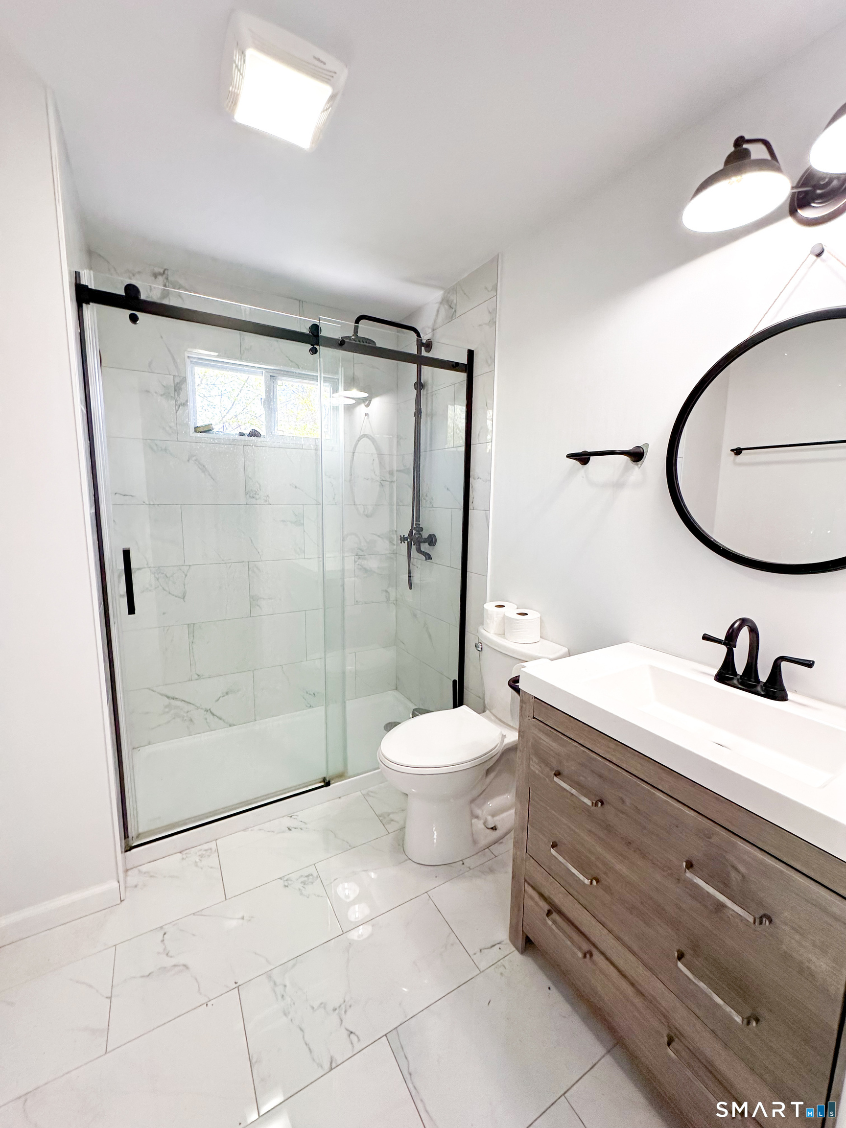 A flexible first-floor layout includes a cozy family room, oversized bedroom, and half bath with laundry. Upstairs, the primary suite offers a private retreat with a full bath and large walk-in closet. Two additional bedrooms and a second full bath complete the level. The finished basement adds valuable extra space for a home gym, playroom, or media area. Outside, enjoy a level backyard with an updated limestone patio, ideal for relaxing or entertaining. Key upgrades: hardwood floors, fresh interior paint, newer windows, siding, roof, seamless gutters, updated plumbing, newer oil tank, and upgraded 200-amp electrical service. Conveniently located near I-84, shopping, gyms, and schools.
