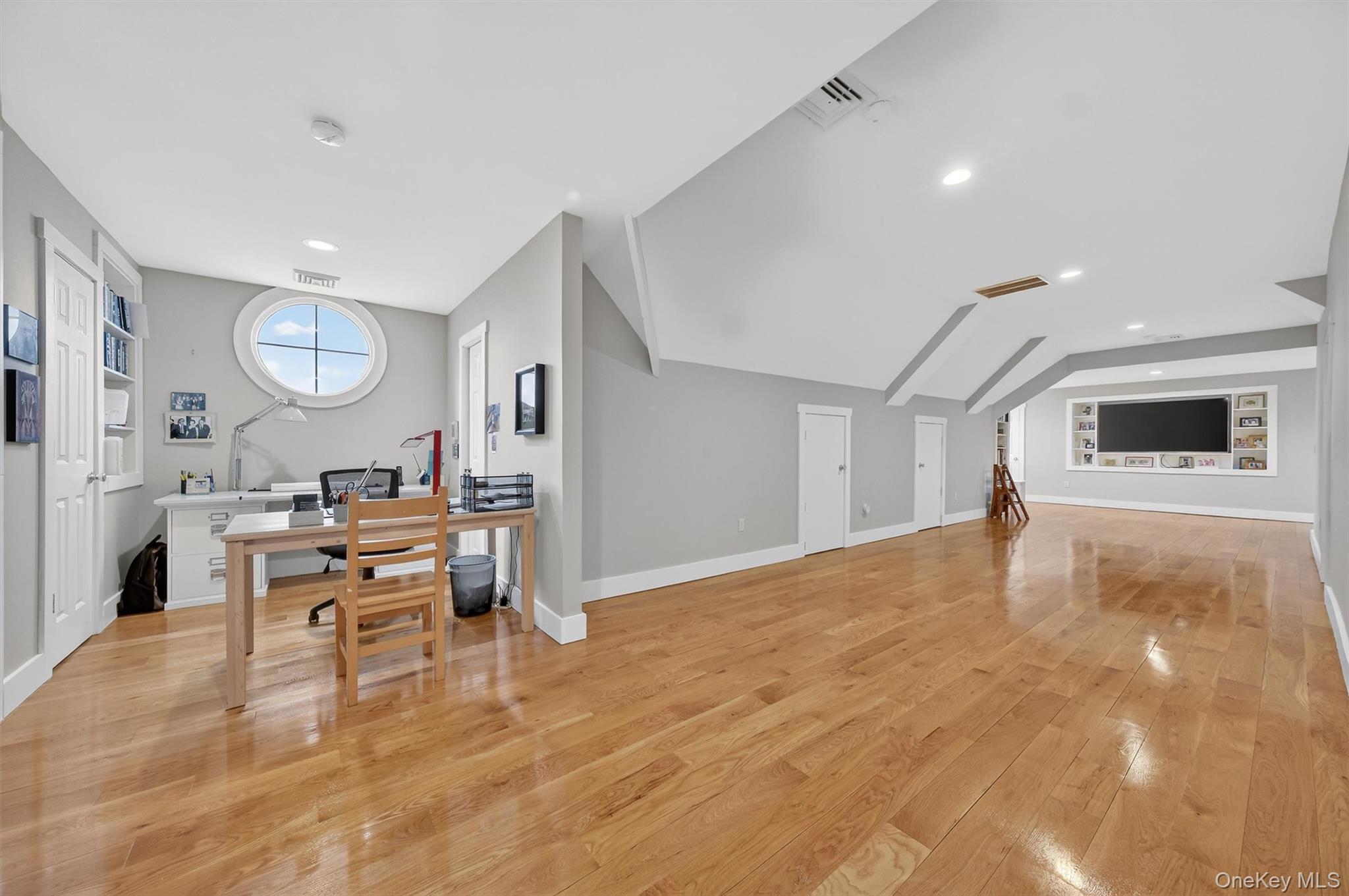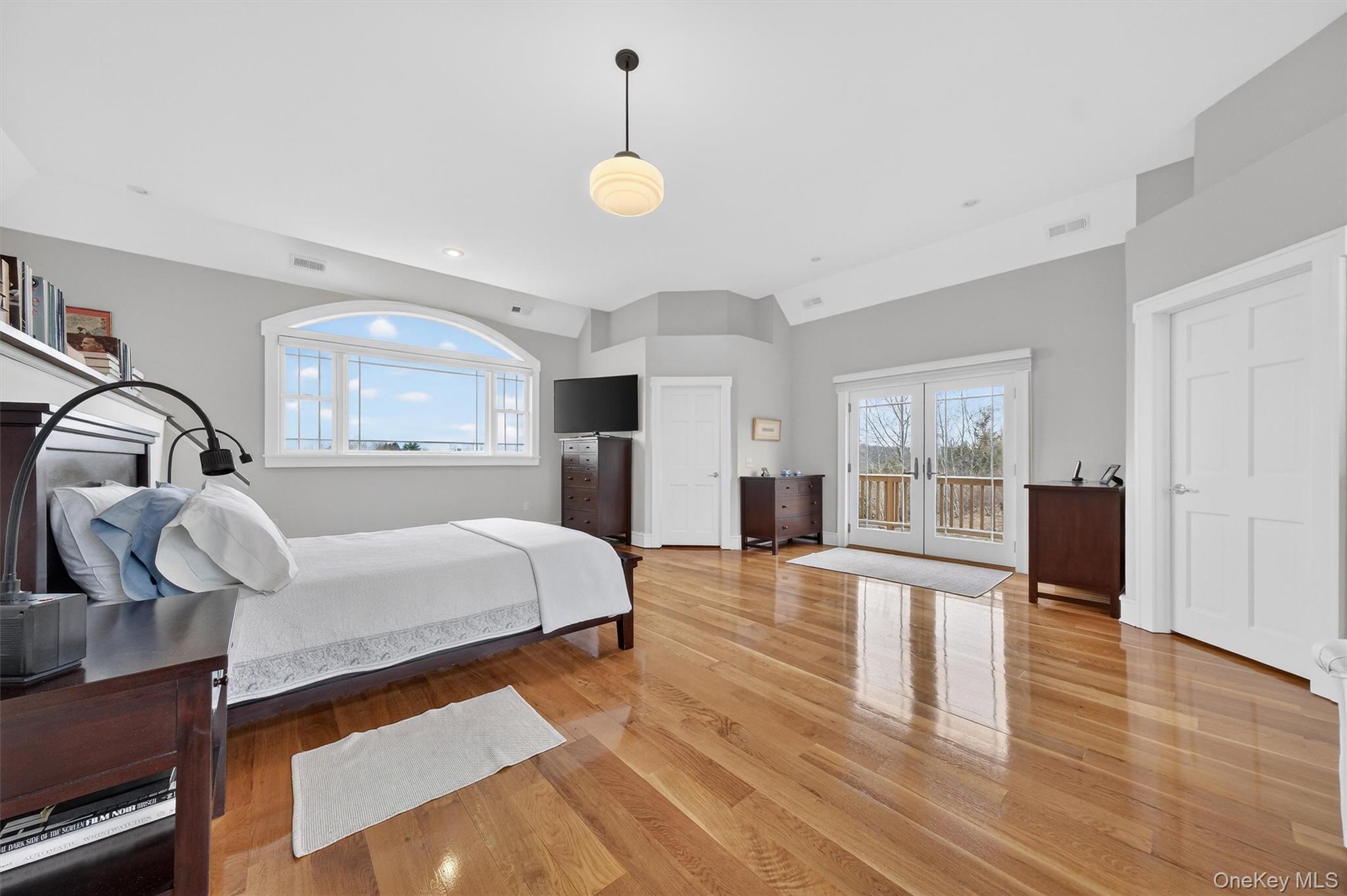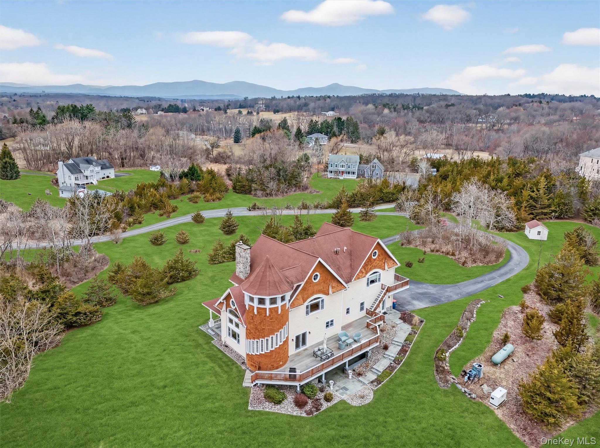 This exceptional estate encompasses nearly eight acres of meticulously landscaped grounds, offering an outstanding Hudson Valley residential experience. Constructed in 2007, the residence exemplifies superior craftsmanship and features a thoughtfully designed floor plan that emphasizes both comfort and functionality. Ideally situated in a scenic rural setting, this premier Hudson Valley location is conveniently located in the acclaimed Red Hook school district, just a short drive from the Taconic State Parkway, NYS Thruway, the Village of Red Hook, and the renowned town of Rhinebeck. From the main foyer, enter the impressive great room, distinguished by exposed wood beams that highlight the high yet welcoming ceilings, and a substantial stone fireplace serving as a focal point suitable for gatherings on cool Hudson Valley evenings. Large windows provide ample natural light throughout the day, enhancing both the spacious living area and the refined formal dining space. The adjoining kitchen is well-appointed with honey-toned shaker cabinets, quartz countertops, and premium appliances, creating an excellent environment for culinary activities and informal hosting. A graceful, curved staircase leads to the second level, home to three private bedrooms. The primary suite is a true retreat, showcasing sweeping panoramic views, Dual walk-in closets, and a spa-like ensuite bath complete with a classic soaking tub, a large step-in steam shower, and a dual marble vanity. Two additional bedrooms provide comfortable accommodations for family or guests; each thoughtfully designed for privacy and relaxation. The primary washer and dryer is located on this floor as well. The third floor boasts a spacious, light-filled open area, perfect for a playroom, studio, or home office with abundant storage options or possible fourth bedroom. On the lower level, a fully self-contained living and dining area includes a modern kitchen with a granite-topped island, ample seating, and a full bath, making it ideal for a media lounge, game room, or guest suite. The French doors lead to a covered paver patio making this area ideal for a future swimming pool. A secondary washer and dryer are also located on this floor. Outdoor living is equally impressive at 48 Eastview Lane, where a sun-drenched back deck offers abundant space for lounging and entertaining, while the welcoming front porch is the perfect spot to unwind and savor breathtaking sunsets against the Catskill Mountain view-scape. Notable additional features of this home include a high-capacity generator, large climate-controlled garage with durable poly enamel flooring, and a 10x10 storage shed. All appliances in both kitchens, laundries, water treatment, and HVAC related equipment are included in the sale. This remarkable property is worth viewing, offering comfort, sophistication, and timeless appeal to elevate your living experience.